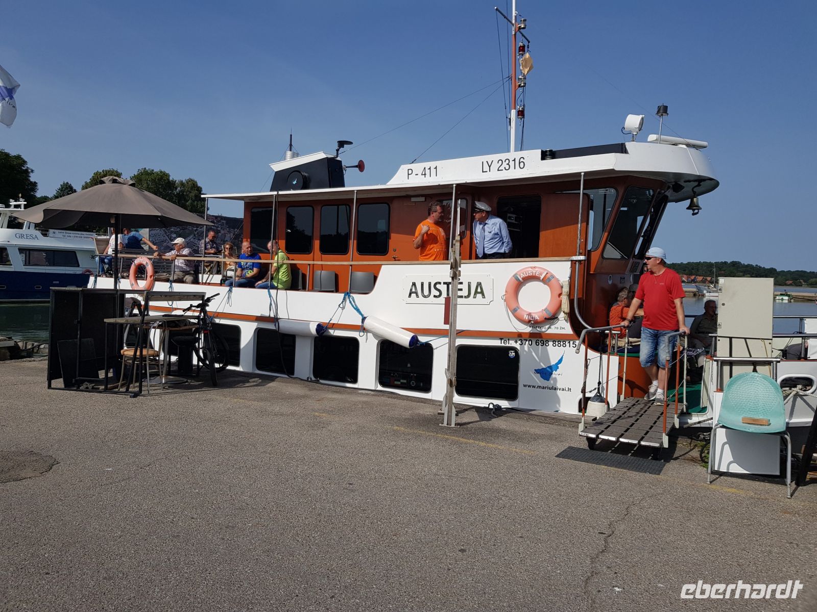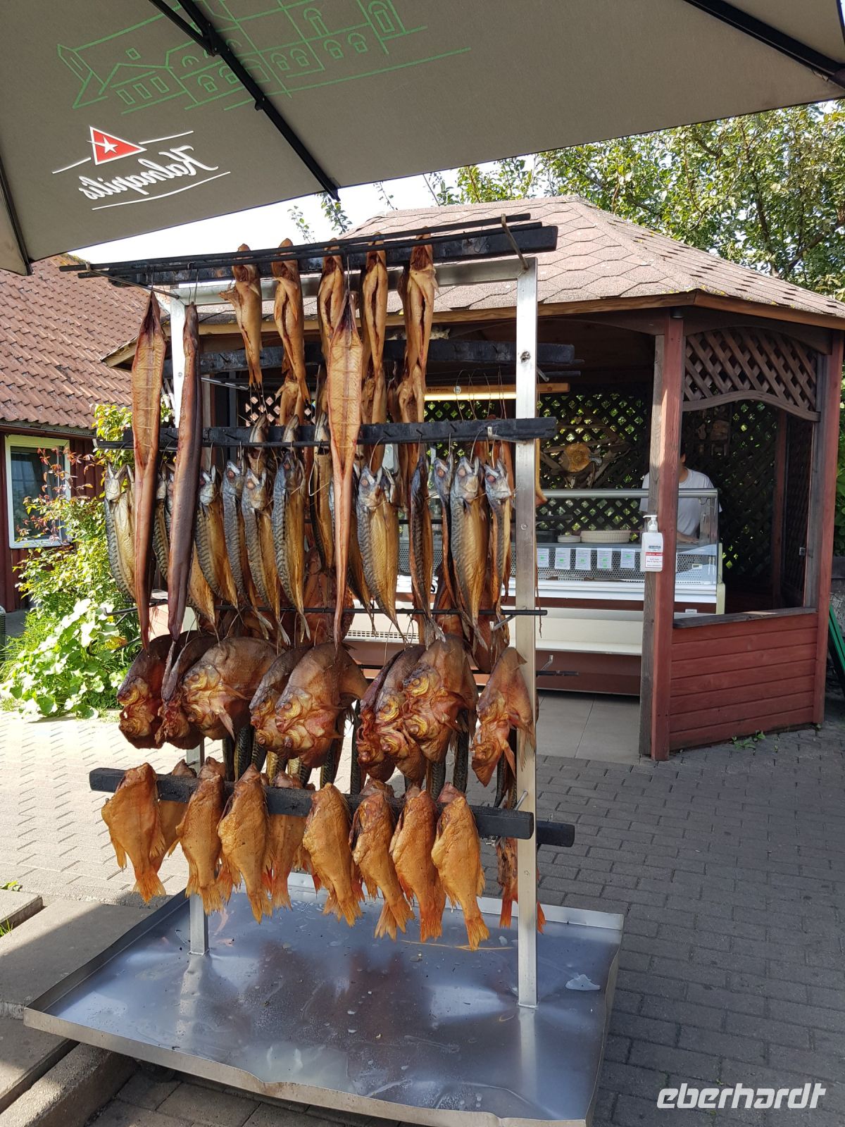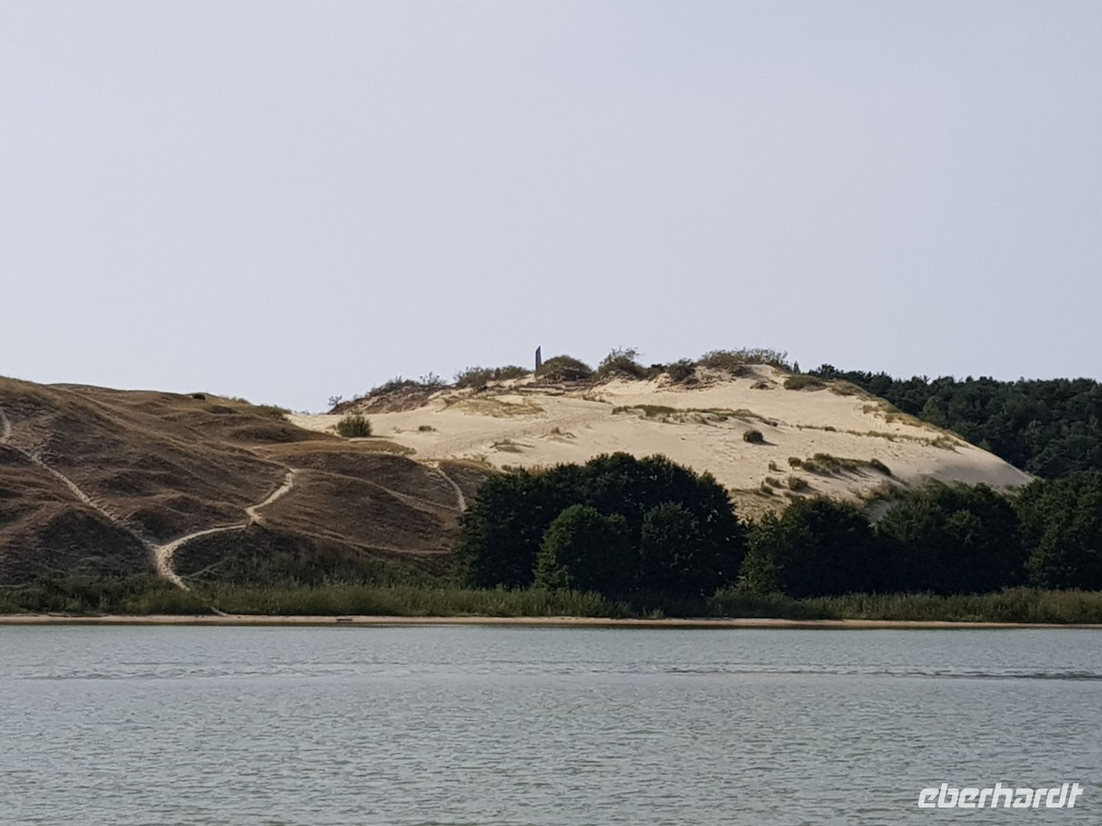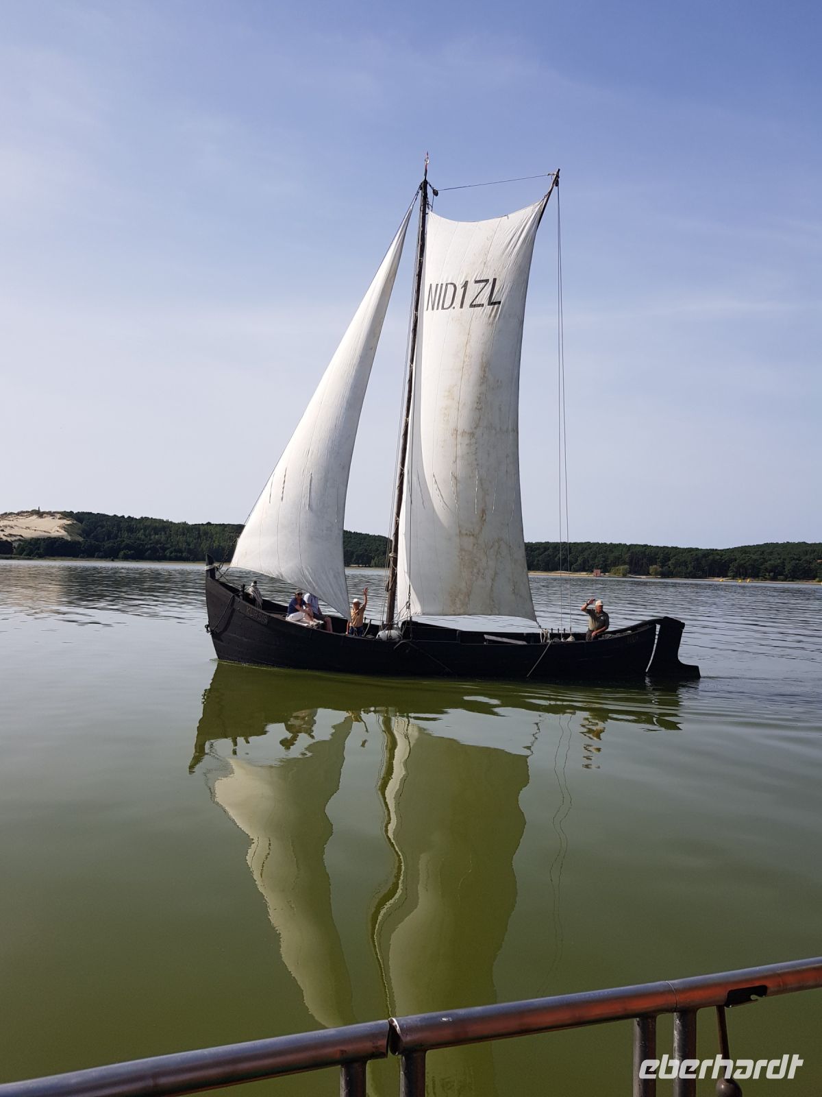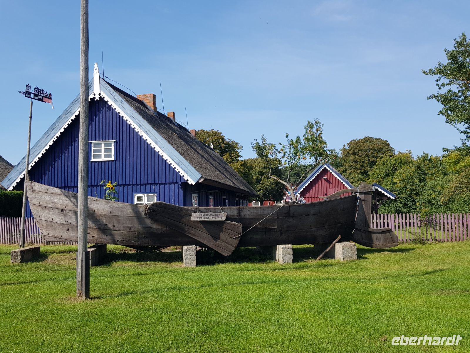 Unmittelbar am Haff, nicht weitentfernt vom Zentrum und Hafen auf der einen Seite und der hohen Düne auf der anderen Seite erwartet uns eine Fischräucherei mit frisch geräuchertem, noch warmen Fisch ( Vilija hatte am Vortag angerufen, zu welcher Zeit der Fisch aus dem Räucherofen kommt). Bis zur Abfahrt des bestellten Schiffes 15 Uhr bleiben knapp 2 Stunden, wer keinen Fisch mag, bestellt sich in einem der vielen Restaurants einen Eisbecher oder etwas Deftiges. Alles kann, nichts muss. An der 1-stündige Rundfahrt mit dem Schiff haben alle Gäste grosses Interesse gezeigt und so können wir die Düne vom Wasser aus sehen und das ist beeindruckend. Auch kreuzt gerade ein historischer Kurenkahn unseren Weg. Land und Leute - mal so, mal anders.