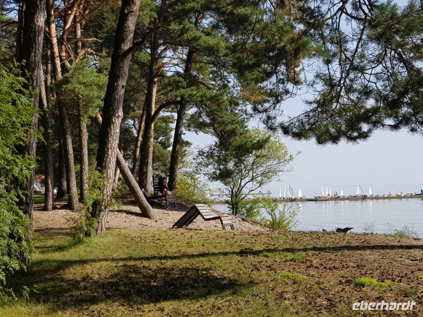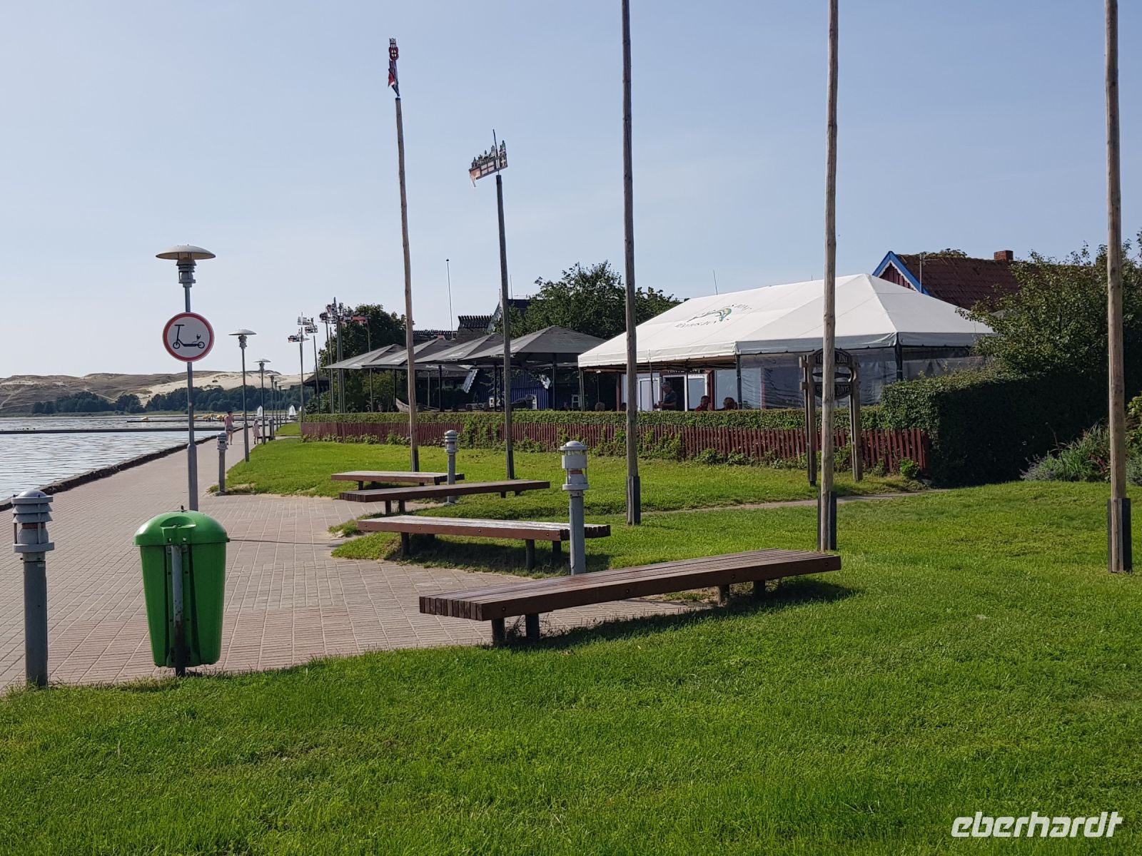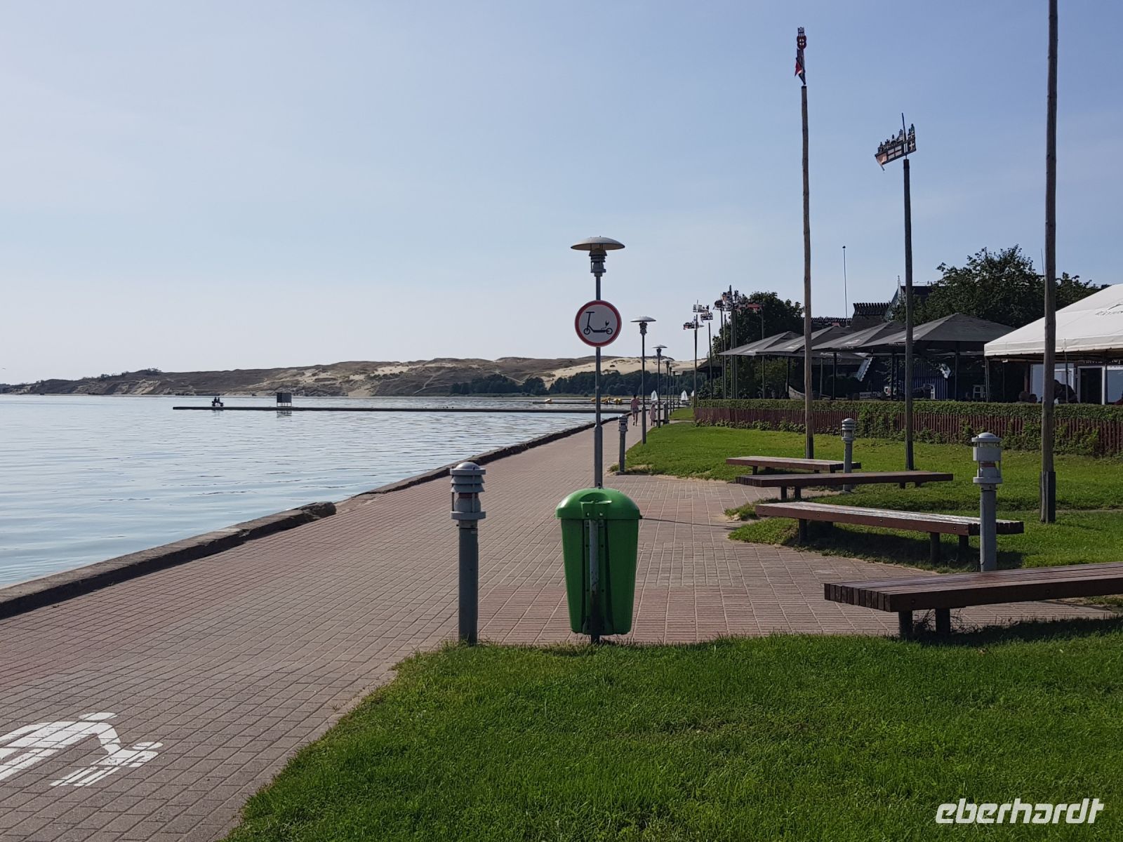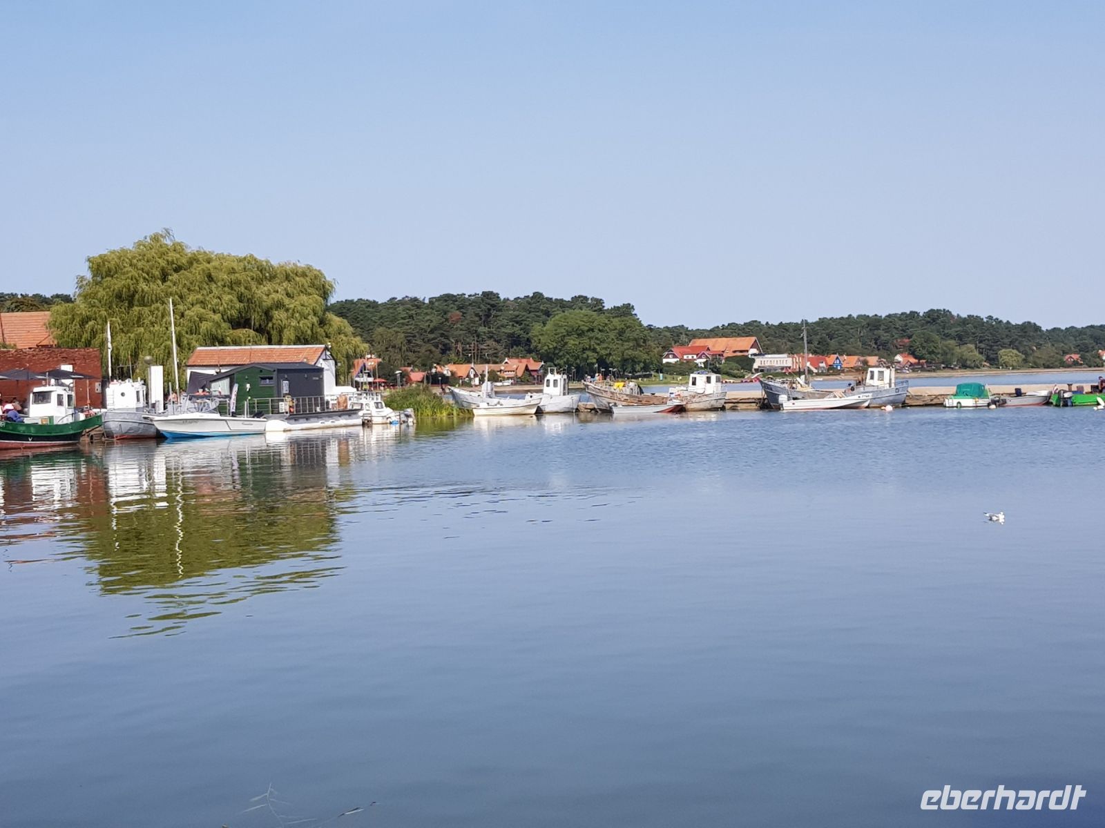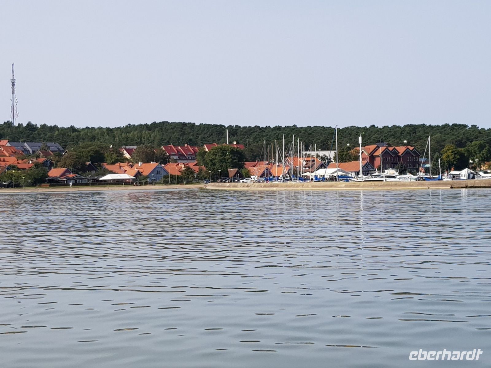 Unmittelbar am Haff, nicht weitentfernt vom Zentrum und Hafen auf der einen Seite und der hohen Düne auf der anderen Seite erwartet uns eine Fischräucherei mit frisch geräuchertem, noch warmen Fisch ( Vilija hatte am Vortag angerufen, zu welcher Zeit der Fisch aus dem Räucherofen kommt). Bis zur Abfahrt des bestellten Schiffes 15 Uhr bleiben knapp 2 Stunden, wer keinen Fisch mag, bestellt sich in einem der vielen Restaurants einen Eisbecher oder etwas Deftiges. Alles kann, nichts muss. An der 1-stündige Rundfahrt mit dem Schiff haben alle Gäste grosses Interesse gezeigt und so können wir die Düne vom Wasser aus sehen und das ist beeindruckend. Auch kreuzt gerade ein historischer Kurenkahn unseren Weg. Land und Leute - mal so, mal anders.
