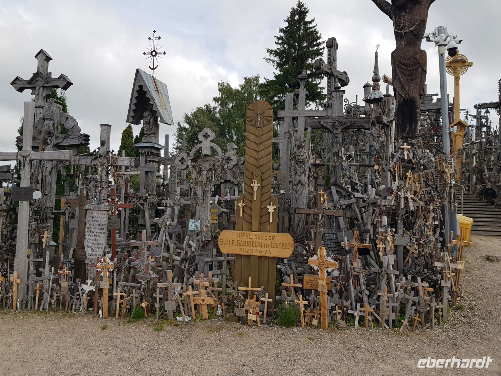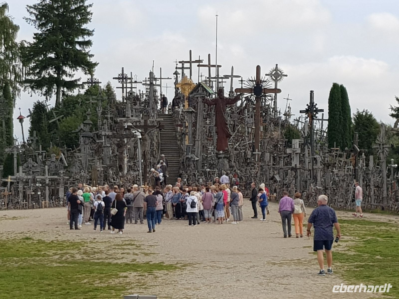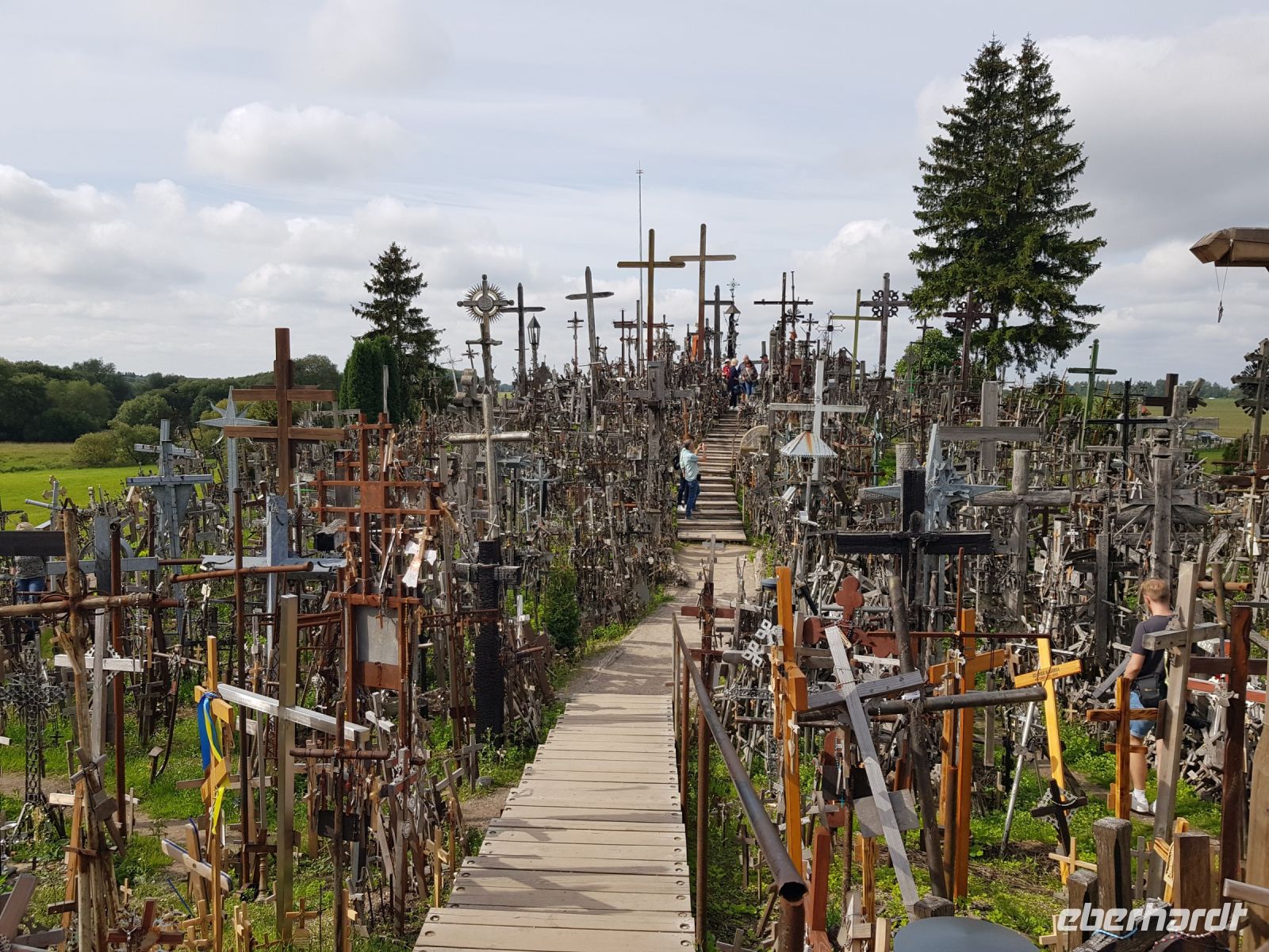 Wieder einmal heisst es Abschied nehmen, dieses Mal nicht nur vom Hotel und vom Ort, sondern auch vom Land Litauen. Zunächst fahren wir auf der E85 in Richtung Vilnius und machen eine 1.Pause an der Tankstelle Orlen an der Kreuzung E77 nach Riga. Alles shr gepflegt und sauber. Auf dem Weg machen wir noch einen längeren Stopp am berühmten Berg der Kreuze bei Siauliai. Die ersten Kreuze wurden in Gedenken an die von der zaristischen Armee niedergeschlagene Rebellion von 1831 aufgestellt, weitere nach der Rebellion von 1863. Anfang des 20.Jhd. war bereits ein sakraler Ort entstanden, an dem katholische Messen gelesen wurden. Als 1956 deportierte Litauer aus Sibirien zurückkamen, hinterliessen sie Kreuze mit Geschichten, die von ihren Leiden erzählten. In der Zeit bis zur Wende 1989 versuchten die Sowjets wiederholt den Ort zu zerstören. Etwa 1km entfernt steht ein Kloster der Franziskaner, das wir natürlich auch besichtigem konnten. Als wir nach 1 h wieder in den Bus steigen, sind es bis zur Grenze noch 40 km. Viso gero Lietvija! ( Auf Wiedersehen, Litauen!), Bis zum Schloss Rundale sindSveiki Latvija! ( Hallo, Lettland!)