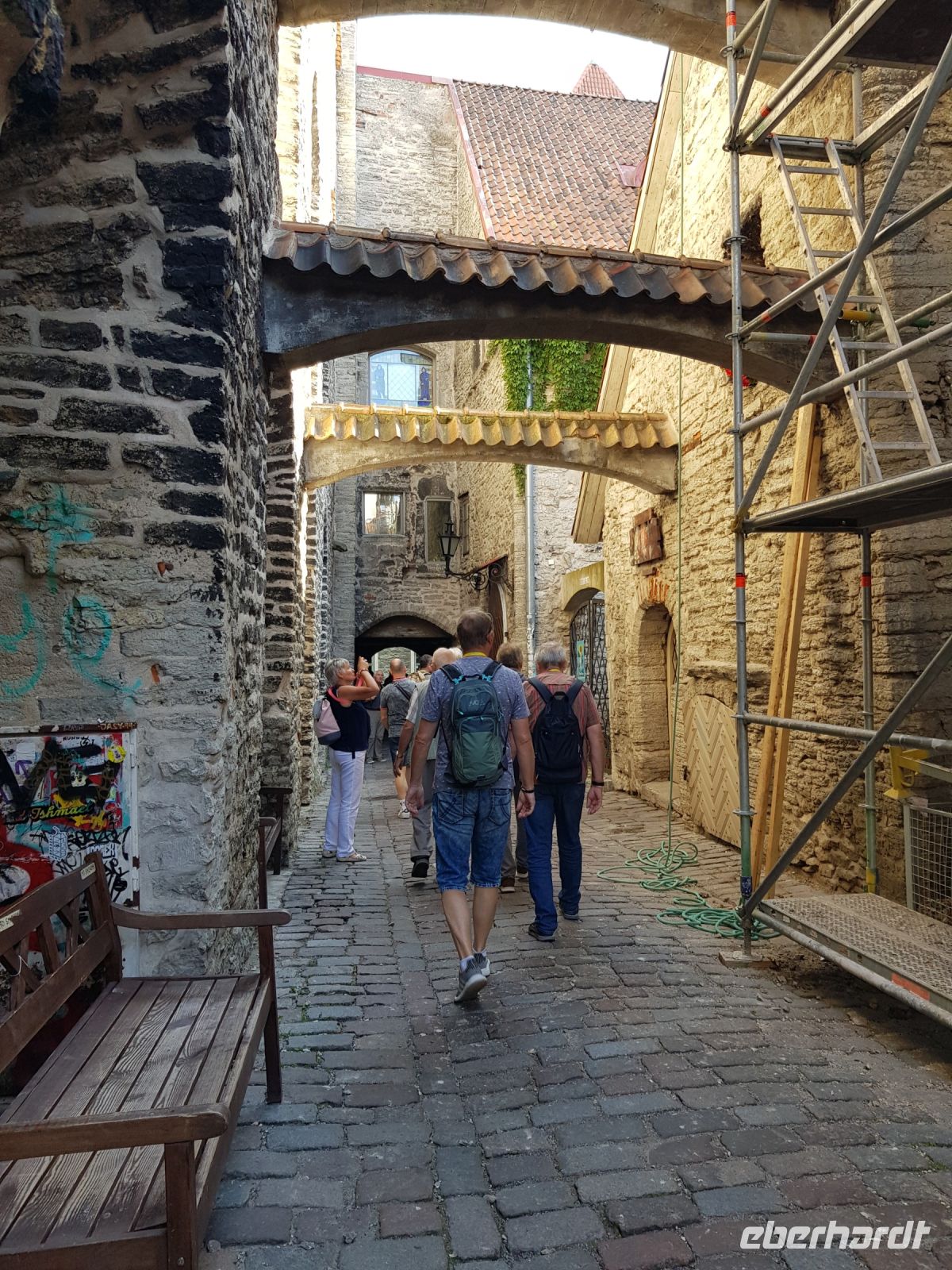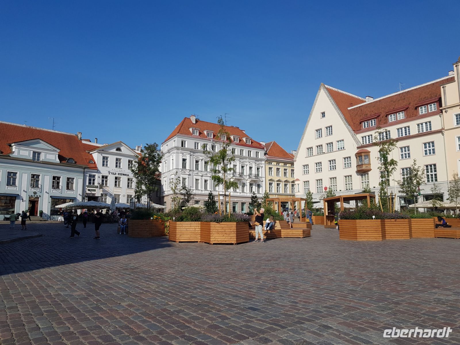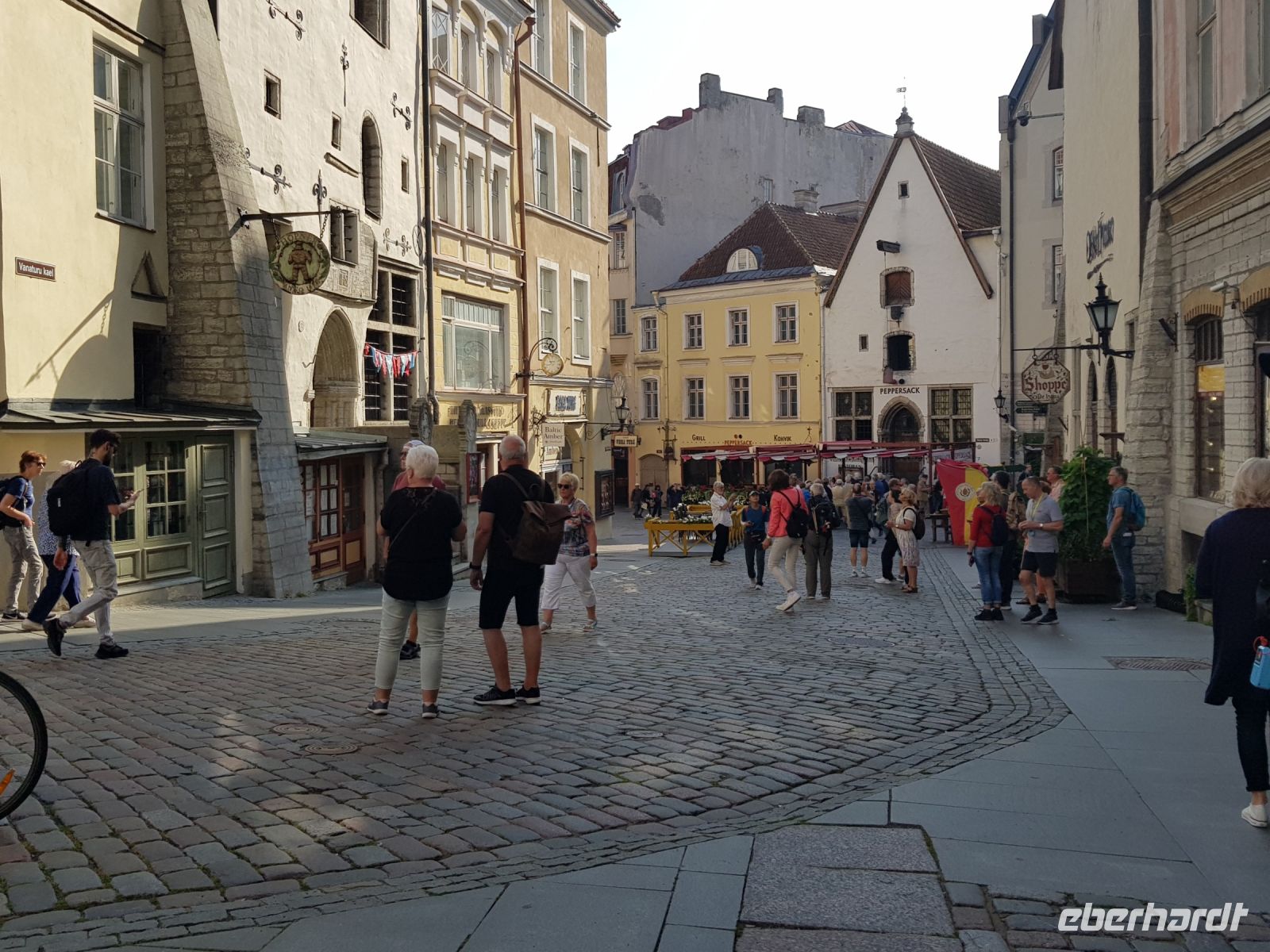 Von der Oberstadt nehmen wir das kurze und das lange Knie , kommen in die Unterstadt, dessen Mittelpunkt das Rathaus mit seinem großen Vorplatz mit zahlreichen Cafes ist. Von hier aus kommt man in das Gewirr der vielen der kopfsteingepflasteren Strassen der Unterstadt, gehen durch die Strassen Pikk und Lai, in denen die zahlreichen hanseatischen Speicher- und Gildehäuser stehen, ausserdem viele Botschaften.