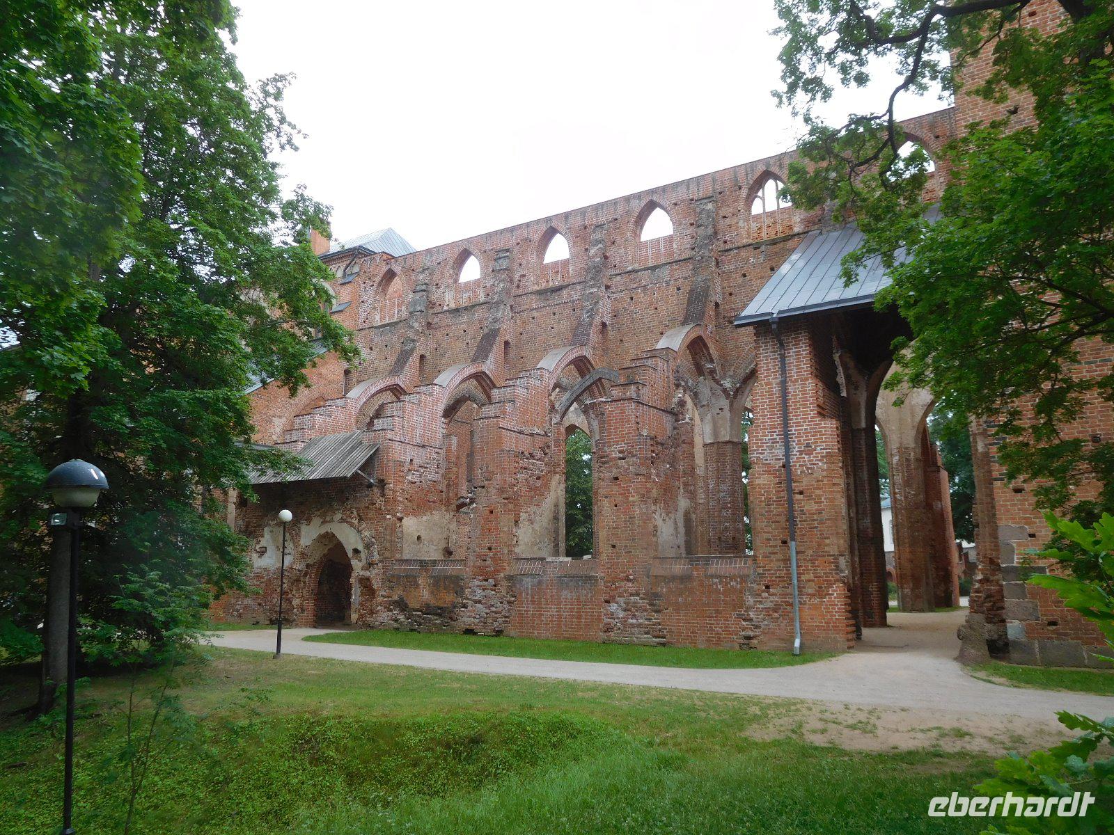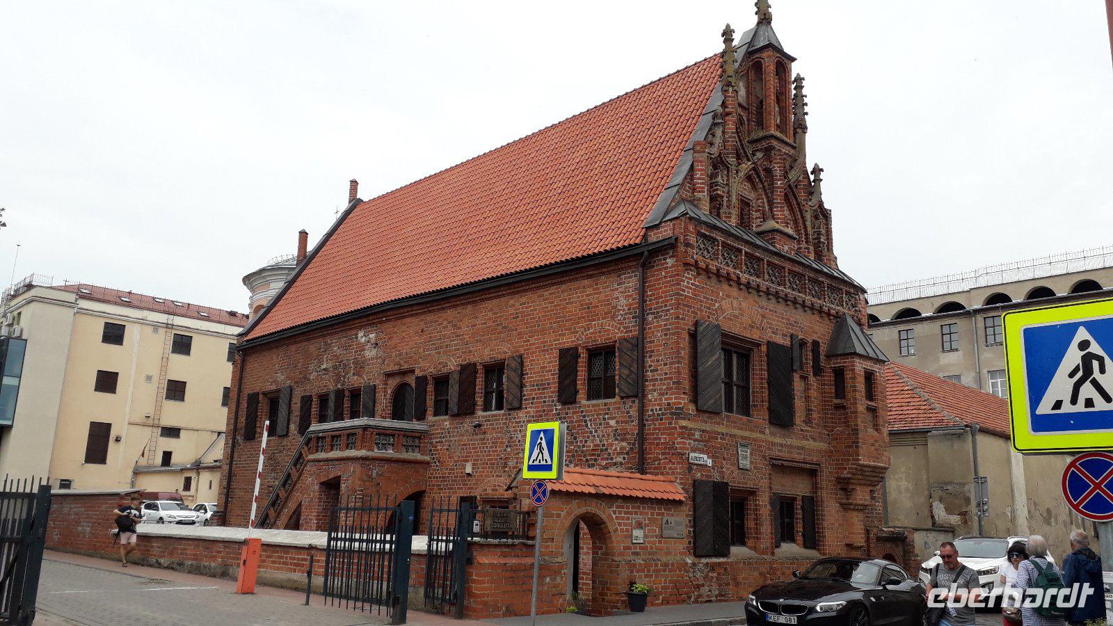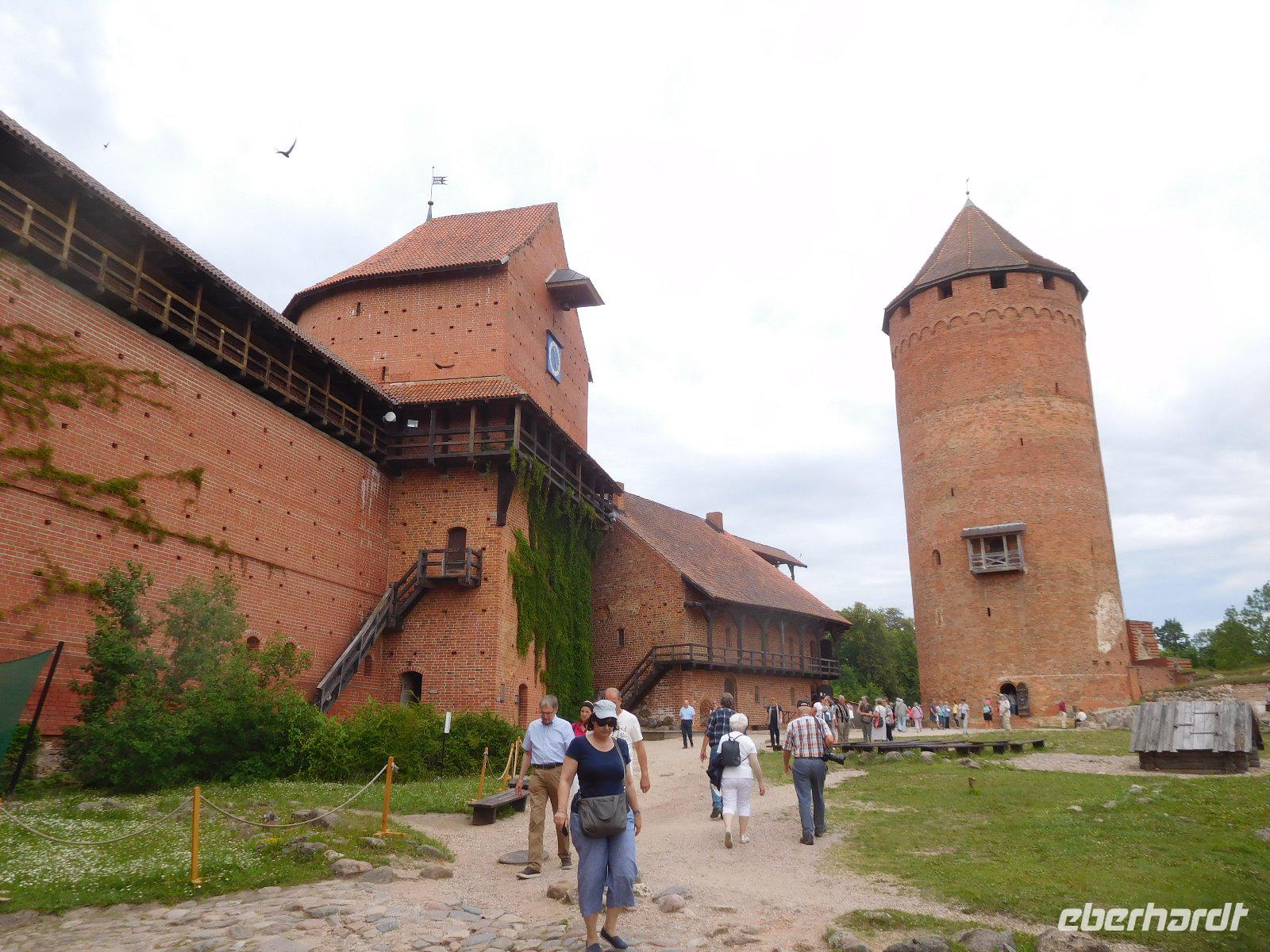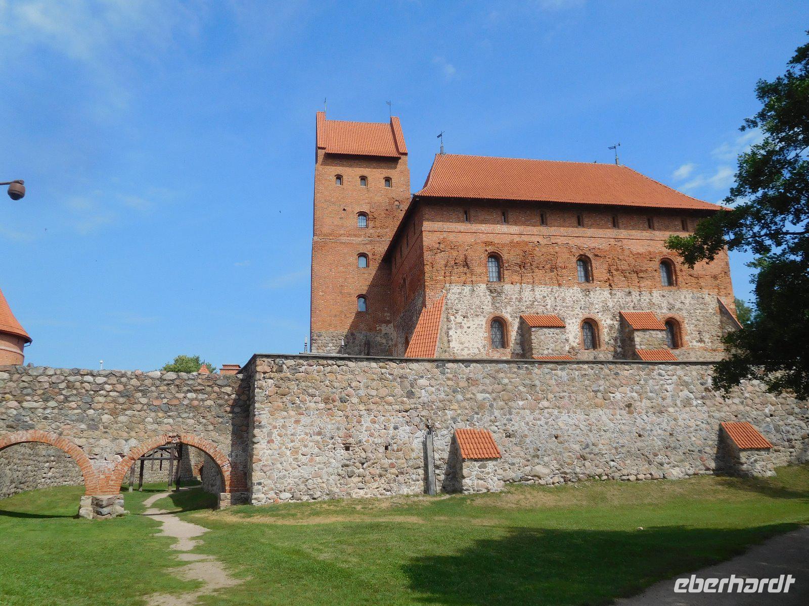 Nach dem Frühstück fuhren wir am zweiten Tag zur Wasserburg von Trakai, der einzigen dieser Art im Baltikum. Sie ist das Wahrzeichen des unabhängigen Litauen und ein Höhepunkt der Reise. Die nur über einen Steg erreichbare Burg wurde der Legende nach schon von Fürst Gediminas als Holzfestung errichtet, die mehrfach abbrannte. Ende des 14. Jahrhunderts errichtete Vytautas der Große die steinerne Burg mit diversen Anleihen beim Deutschen Orden in Stil und Fortifikation, so dass man sich in einer kleinen Ausgabe der Marienburg wähnt. Von hier regierten die Großfürsten ein Land, das von der Ostsee bis zum Schwarzen Meer reichte. Der durch leidvolle Erfahrungen misstrauisch gewordene Vytautas rekrutierte sich von der Krim, denn so weit ging sein Herrschaftsbereich, etwa 400 Familien der Karäer, ein Turkvolk, das im 7. Jahrhundert eine jüdische Sekte gebildet hatte, die sich zwar an der Thora, nicht aber an den Folgeschriften orientierte. Ganz nach dem Vorbild Kaiser Friedrich II. von Hohenstauffen, dessen Leibgarde aus sizilianischen Bergmuselmanen bestand, stellten diese Karäer die Leibwache für Vytautas. Auf dem festländischen Ortsteil sieht man noch ihre giebelständigen Holzhäuser mit den drei Fenstern: eins für Vater im Himmel, eins für den auf Erden und eines für Vytautas. Auch die Kerene, wie ihre Synagoge genannt wird, steht noch. Der abschließende Anblick der Wasserburg im Sonnenlicht war unvergesslich.