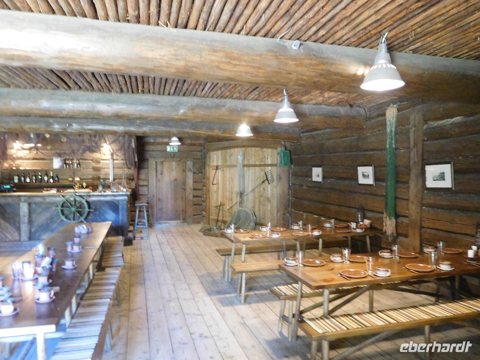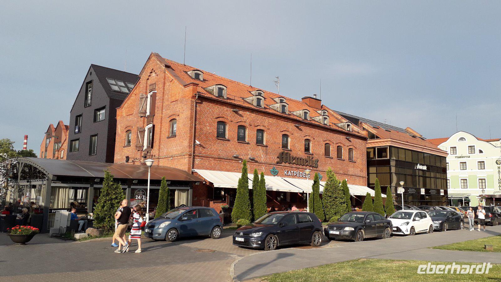 Abends traf sich die Gruppe um 18.15 Uhr, um zum Abendessen zu gehen, das im Restaurant „Berneliu Uzeiga", deutsch: Burschenschänke, gleich am Gediminas-Prospekt gereicht wurde. Die von engagierten Gastronomen wie eine Dorfschänke eingerichtete Braugaststätte verbreitete uriges Flair. Zu Trinken gab es Kwas, der Vorspeise mit Wurst und Käse folgte eine Suppe aus Roter Beete mit Gemüse, Pilzen und Sahne. Anschließend kamen die unvermeidlichen Zeppelinas, fleischgefüllte Taschen aus Kartoffelteig. Es folgten allerhand Kartoffelspeisen. Das alles ließ sich eigentlich nur mit hochprozentiger Verdauungshilfe halbwegs bewältigen. Gut gesättigt klang ein netter Abend aus.