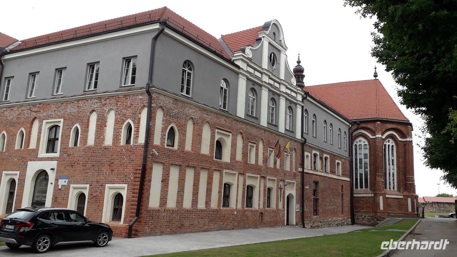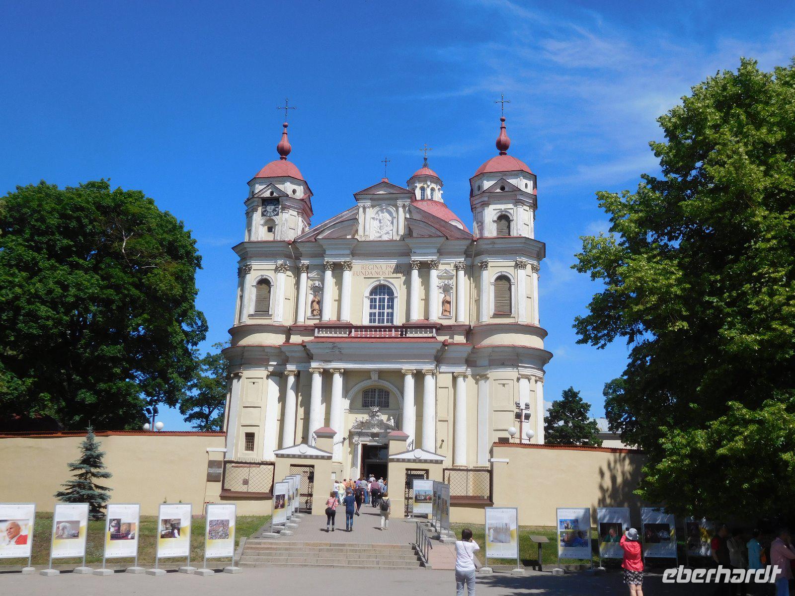 In Frankfurt trafen sich alle Fluggäste mit dem Reiseleiter und pünktlich startete der Flug nach Vilnius. Dort erwarteten uns schon unsere örtliche Führerin Wanda Golnik und der Busfahrer. Wir fuhren gleich zur reich mit Stuckfiguren verzierten Barockkirche Peter und Paul, bevor wir in unserem Hotel eincheckten. Dies liegt am Rand der Altstadt in einem netten urbanen Viertel nahe der großen Markthalle unweit vom einzig erhaltenen Stadttor, dem Tor der Morgenröte mit der berühmten Madonna, die eines der wichtigsten Pilgerziele Litauens ist. Noch vor dem Abendessen im Hotel ging der Reiseleiter mit uns bis zum Kathedralenplatz und zeigte die wichtigsten Orientierungspunkte der Altstadt.