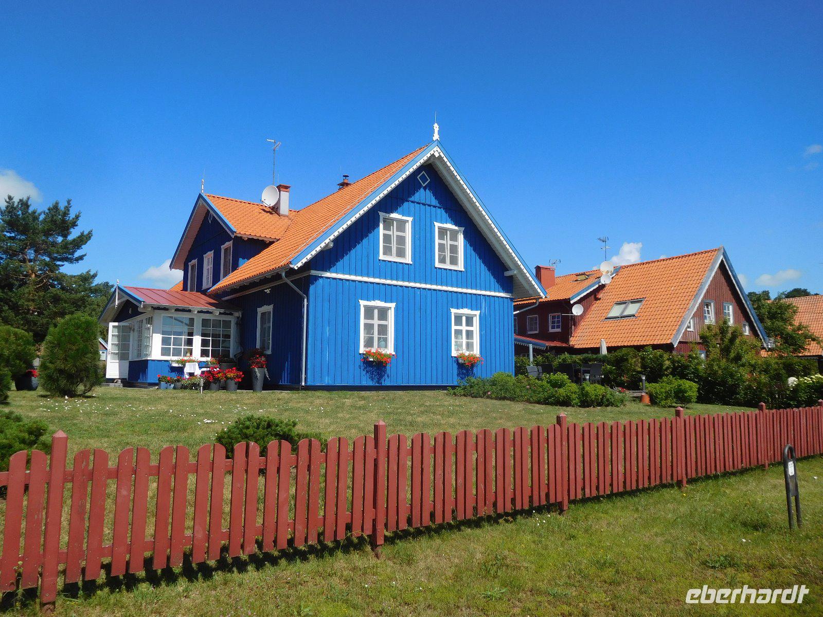 Nach dem reichhaltigen Frühstück fuhren wir nach Nidden auf der kurischen Nehrung, wohin wir zunächst mit der Fähre übersetzen mußten. In Nidden erwartete uns schon ein Boot, das unser Reiseleiter bestellt hatte. Bei traumhaftem Licht schipperten wir über das Haff bis zur hohen Düne an der russischen Grenze. Stimmungsvoll wirkte das Haff in den frühen Sonnenstrahlen und ein guter litauischer Kräuterschnaps ließ wohlige Stimmung aufkommen. Dann spazierten wir durch Nidden und vorbei an bunten Fischerkaten ging es zum Friedhof mit der evangelischen Dorfkirche von 1888 und zum Hotel, das Ende des 19. Jahrhunderts von dem bekannten Mäzen Hermann Blode, dem Begründer der Künstlerkolonie in Nidden, erbaut wurde. Anschließend kamen wir zum Sommerhaus, das Thomas Mann sich vom Nobelpreisgeld 1929 über dem berühmten „Italienblick" hat bauen lassen. Der Bus brachte uns dann landseitig zur hohen Düne und dann zurück Richtung Memel. Die erste Pause legten wir am herrlichen Ostseestrand von Preila ein, wo man baden oder einfach den Strand genießen konnte. Weiter ging es anschließend nach Schwarzort, wo in der Freizeit Ort und Hexenberg erkundet werden konnten. Es folgte eine Busfahrt über den Rest der kurischen Nehrung, die zahlreiche Ausblicke in die Natur dieses besonderen Stückchens Baltikum ermöglichte.