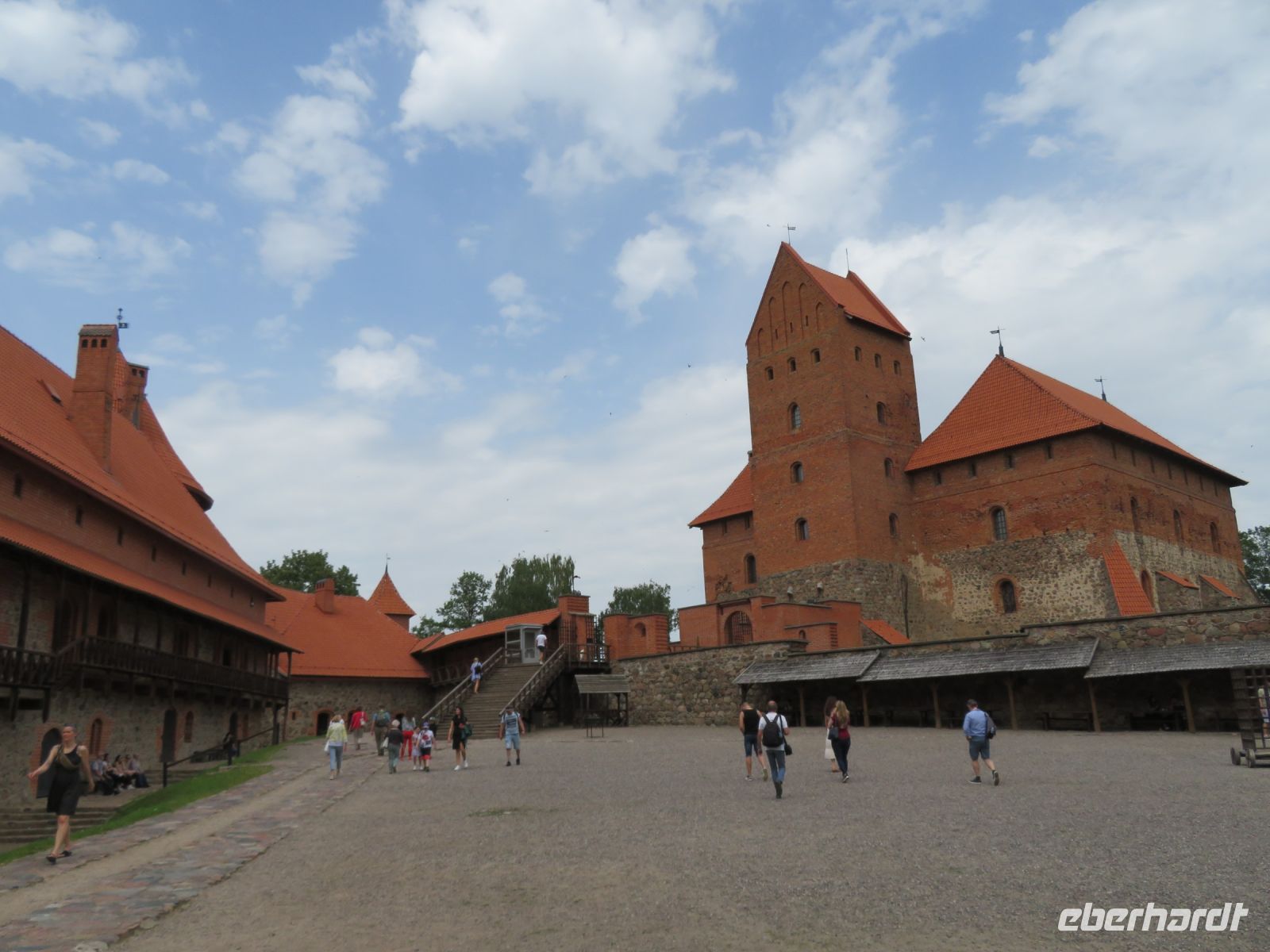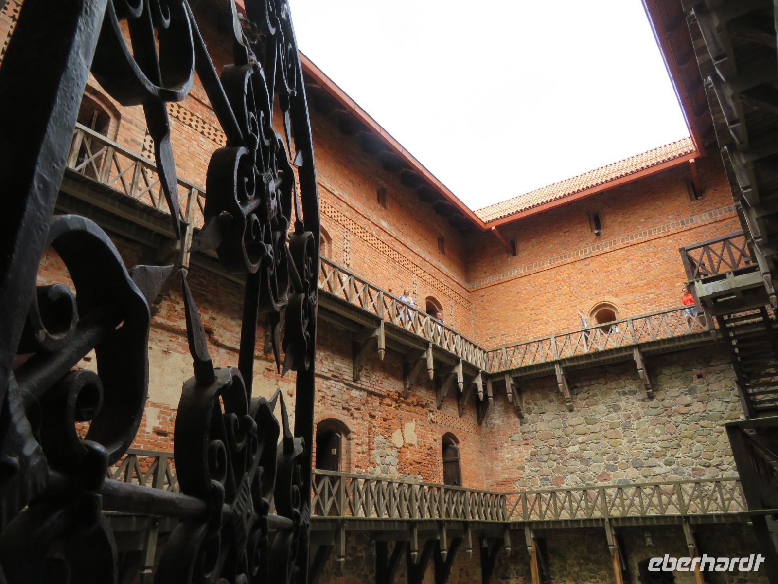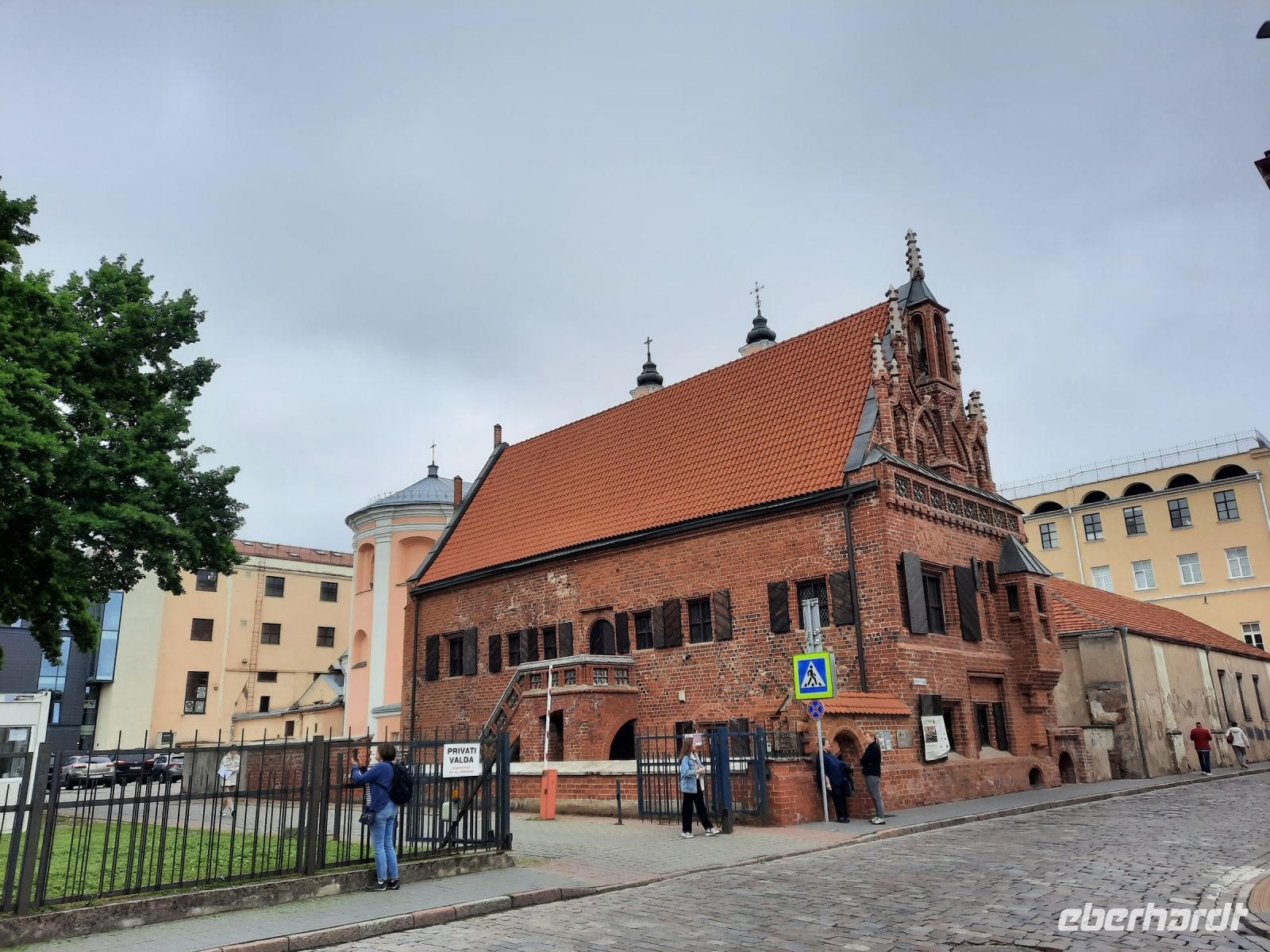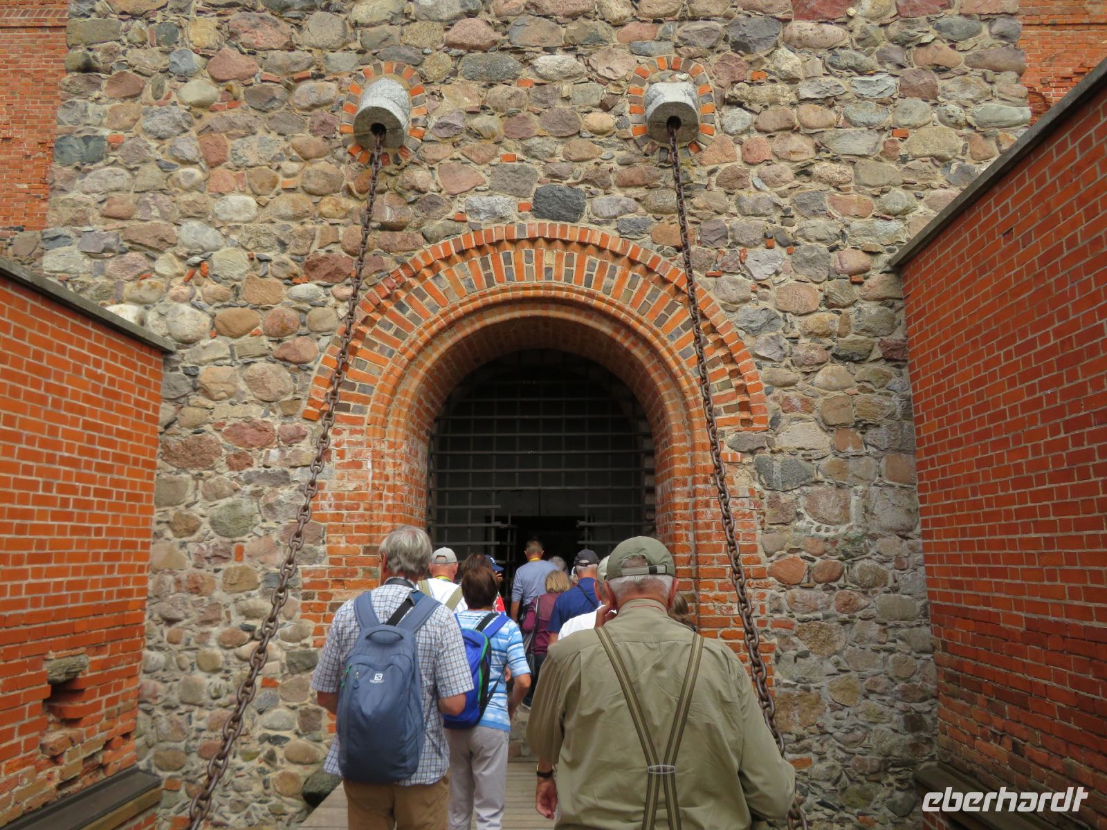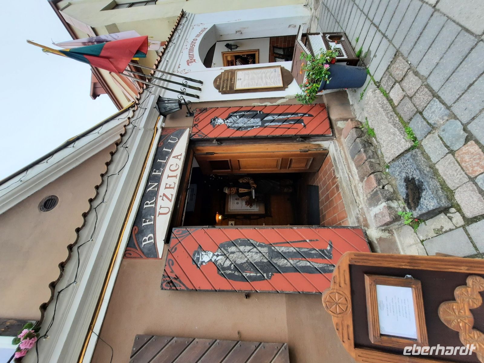 Von 1316 bis 1323 war Trakai Hauptstadt des Landes. Auch hier hatte Gediminas seine Finger im Spiel, als er 1321 die Stadt erbauen ließ, damals wichtiges militärisches und politisches Zentrum des Großfürstentums. Auf einer Halbinsel des Galve-Sees entstand die mittelalterliche, backsteinerne Burganlage, die nach Bränden und Zerstörungen erst nach dem 2. Weltkrieg wieder als Wasserburg aufgebaut wurde. Über Holzstiegen und enge Gänge durchstreiften wir die Gemäuer der Burganlage (manchmal bildeten wir dabei eine Ameisenstraße) und erfuhren viel Wissenswertes zur Geschichte. In Trakai gibt es noch eine Besonderheit: Seit dem 14. Jhd. leben hier die Karäer, ein turksprachiges Volk jüdischen Glaubens aus der Krimregion, die damals die Großfürsten als Wachgarde ins Land holten. Heute lebt noch ein ganz geringer Teil dieser Volksgruppe in Trakai. Eins ihrer Gebetshäuser, die Kenesas sahen wir in der Stadt, ebenso die hölzernen Wohnhäuser, deren Giebel mit 3 Fenstern zur Straße gewandt sind. Wir genossen diesen sonnigen, warmen Sonntagnachmittag am See, bevor wir nach Vilnius zurück fuhren. Am Abend waren wir im Restaurant Lokys (Zum Bären) zu Gast.