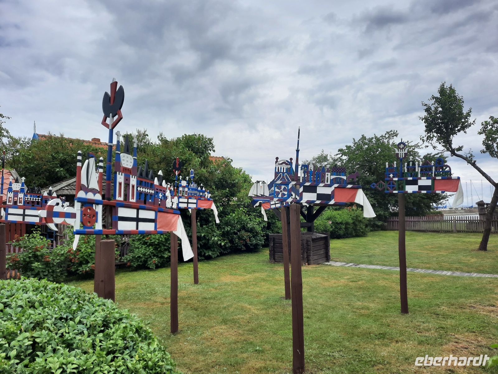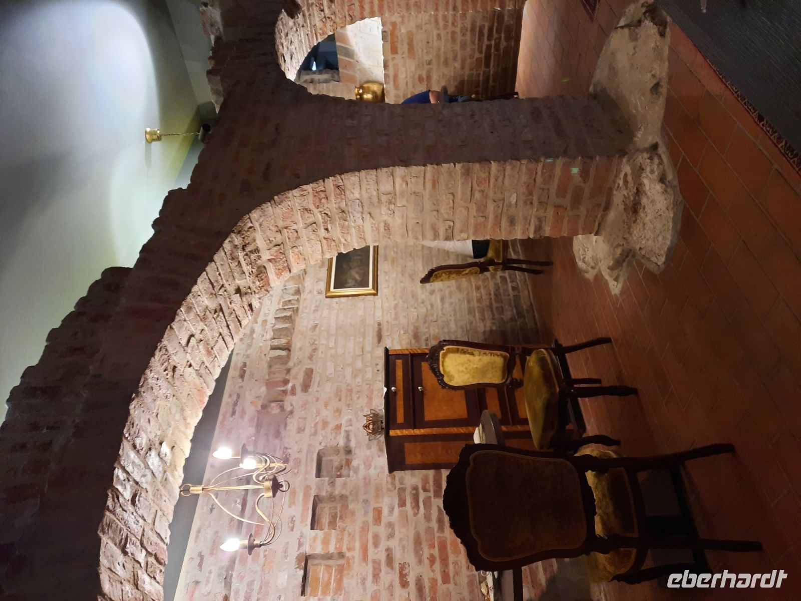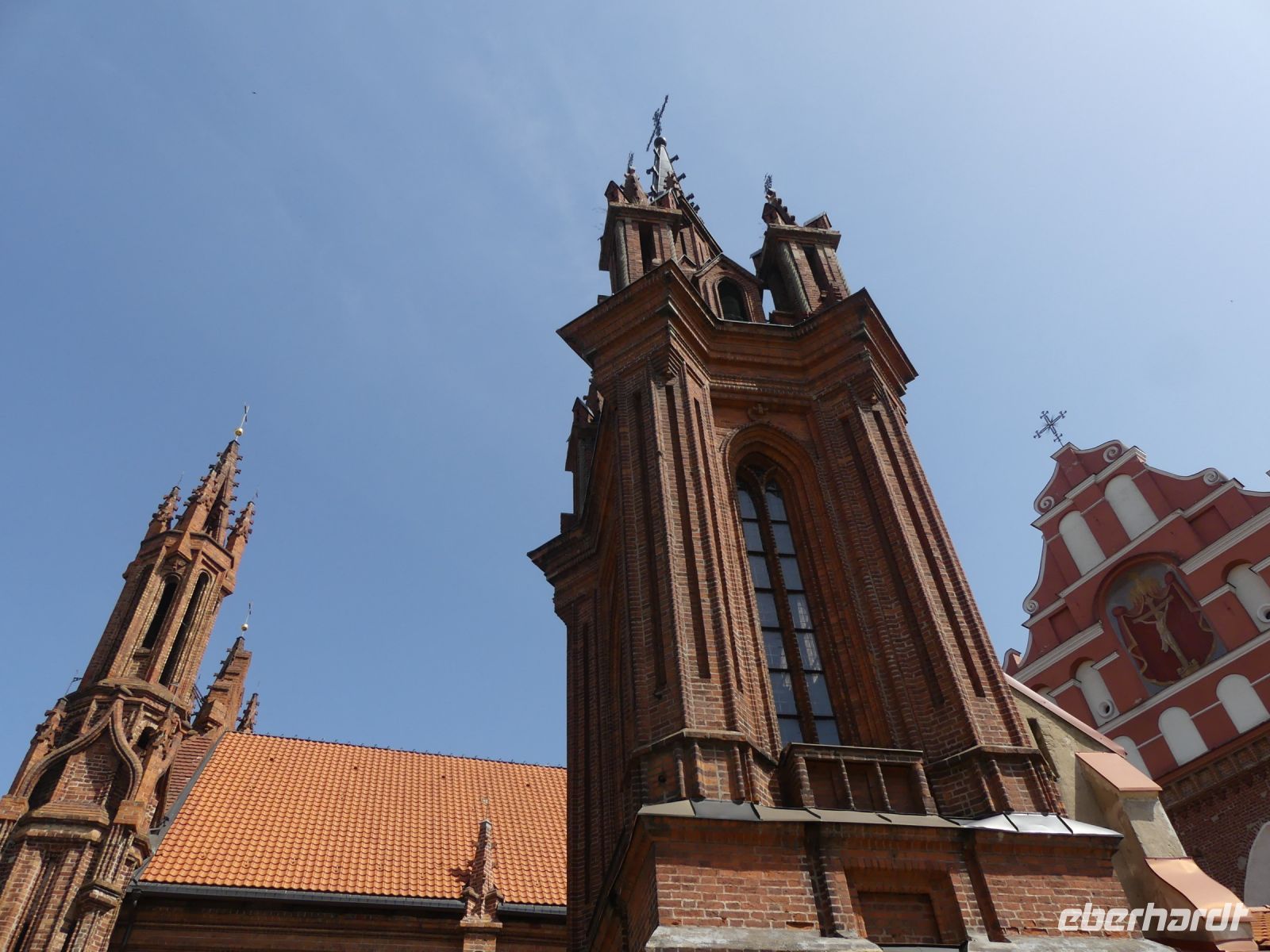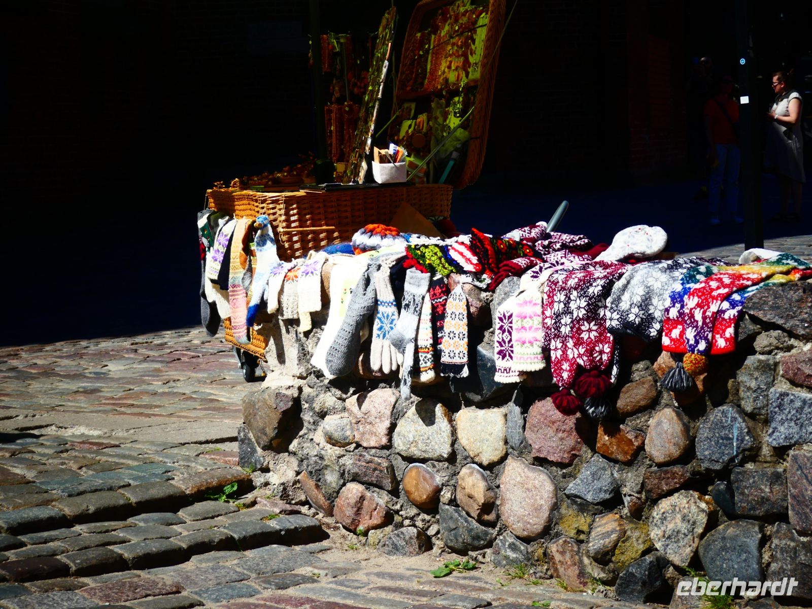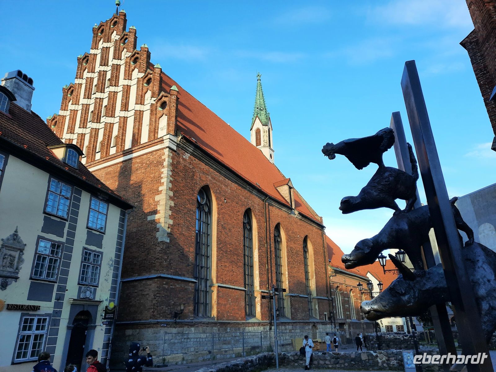 Von 1316 bis 1323 war Trakai Hauptstadt des Landes. Auch hier hatte Gediminas seine Finger im Spiel, als er 1321 die Stadt erbauen ließ, damals wichtiges militärisches und politisches Zentrum des Großfürstentums. Auf einer Halbinsel des Galve-Sees entstand die mittelalterliche, backsteinerne Burganlage, die nach Bränden und Zerstörungen erst nach dem 2. Weltkrieg wieder als Wasserburg aufgebaut wurde. Über Holzstiegen und enge Gänge durchstreiften wir die Gemäuer der Burganlage (manchmal bildeten wir dabei eine Ameisenstraße) und erfuhren viel Wissenswertes zur Geschichte. In Trakai gibt es noch eine Besonderheit: Seit dem 14. Jhd. leben hier die Karäer, ein turksprachiges Volk jüdischen Glaubens aus der Krimregion, die damals die Großfürsten als Wachgarde ins Land holten. Heute lebt noch ein ganz geringer Teil dieser Volksgruppe in Trakai. Eins ihrer Gebetshäuser, die Kenesas sahen wir in der Stadt, ebenso die hölzernen Wohnhäuser, deren Giebel mit 3 Fenstern zur Straße gewandt sind. Wir genossen diesen sonnigen, warmen Sonntagnachmittag am See, bevor wir nach Vilnius zurück fuhren. Am Abend waren wir im Restaurant Lokys (Zum Bären) zu Gast.