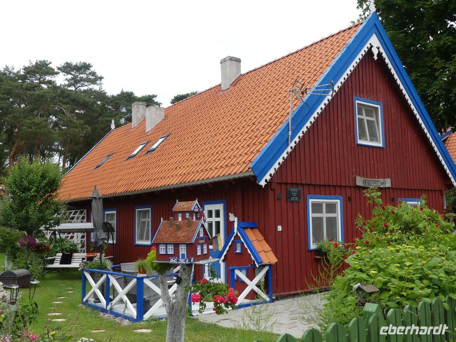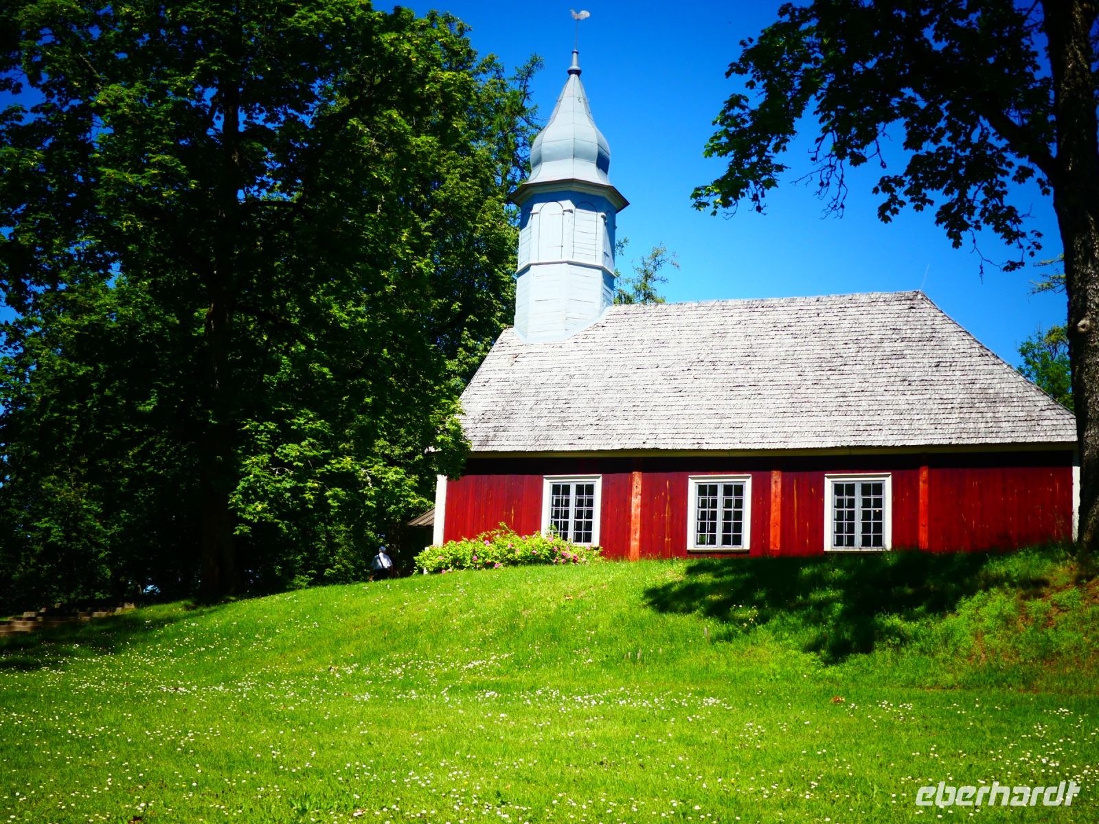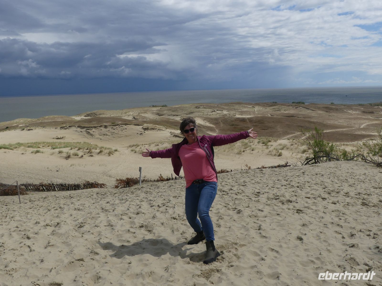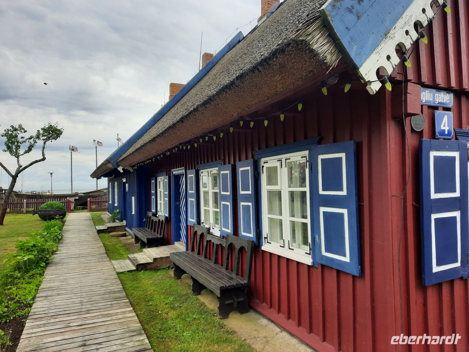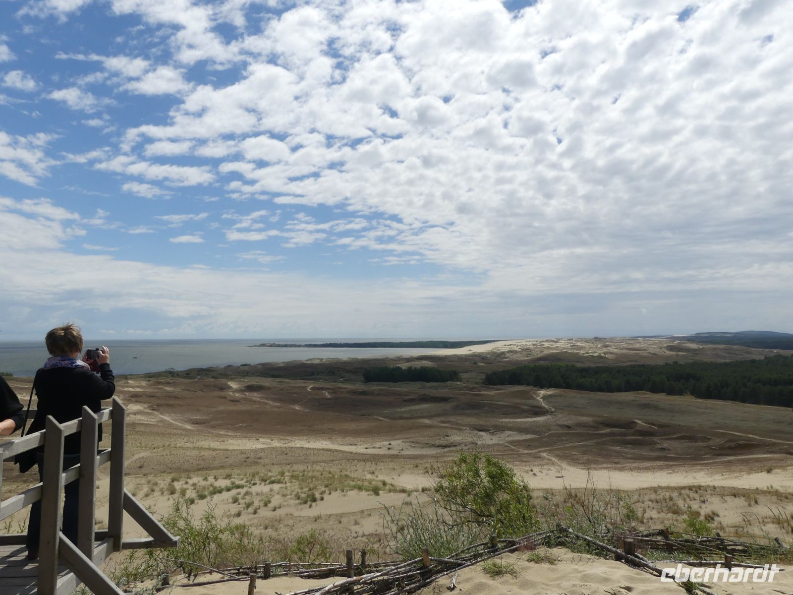 Was war denn heute los? Es regnete! Das sollte aber nur eine kurze Momentaufnahme während unserer Reise sein. Mit einem perfekten Frühstücksbuffet begann unser Tag. Der heutige Ganztagesausflug führte uns heute auf die Kurische Nehrung (Neringa). Darauf freuten sich alle, obwohl sich die Sonne noch dezent im Hintergrund hielt und es regnete. Die Nehrung trennt das Haff (Süßwasser), bis auf die schmale Meerenge bei Klaipeda, von der Ostsee. Somit ist das Haff das größte Binnengewässer Litauens. Die Kurische Nehrung, auch litauische Sahara genannt ist 98 km lang, davon 52 km litauisch, der andere Teil gehört zu Russland. Seit 2002 gehört sie zum Weltnaturerbe der UNESCO. Unweit von Nida (Nidden) befindet sich mit 3,8 km die breiteste Stelle, während die schmalste Stelle bei Lesnoi (russischer Teil) gerade mal 380 m beträgt. Neben der wissenschaftlichen Begründung erzählt auch eine Legende der Riesin Neringa von der Entstehung der Nehrung. Die meisten Ansiedlungen der Nehrung befinden sich auf der geschützten Haffseite. Nach kurzer Fährfahrt unternahmen wir eine kleine Rundfahrt. Vorbei an Juodkrante (Schwarzort), einem der ältesten Orte der Nehrung und kleinen Fischerhäusern fuhren wir nach Nida (Nidden). Zuerst besichtigten wir das Sommerhaus des Literaturnobelpreisträgeres Thomas Mann, den alten Friedhof mit alten Gräbern der Kuren und eine Bernsteingalerie. Entlang der Promenade spazierten wir ins Zentrum, zum Hafen. Hier verbrachten wir unsere Mittagspause. Im einstigen Fischerdörfchen, heute beliebter Ferienort sind viele Holzhäuschen mit den typisch blauen Verzierungen und Holzschnitzereien zu sehen. In einigen bunt blühenden Vorgärten standen die für Region typischen Kurenkähne. Kleine Restaurants und Cafes luden zum Verweilen zur Mittagszeit ein. Mittlerweile schien auch wieder die Sonne. Danach ging es zur hohen Düne. Auf einem gut befestigten Weg erklommen wir die 52 m hohe Düne, auf deren Gipfel sich eine Sonnenuhr befindet. Von oben eröffnete sich uns ein fantastischer Blick über die sandige und mit Kiefern bewaldete Nehrung bis auf die russische Seite, den rot-weißen Leuchtturm von Nida und auf das Haff. Natürlich durfte bei unserem Ausflug auch ein Besuch des Ostseestrandes, wofür ja die Kurische Nehrung bekannt ist, nicht fehlen. Als Abschluss des Tages genossen wir den herrlichen weißen Sandstrand und das Rauschen der Ostsee.
