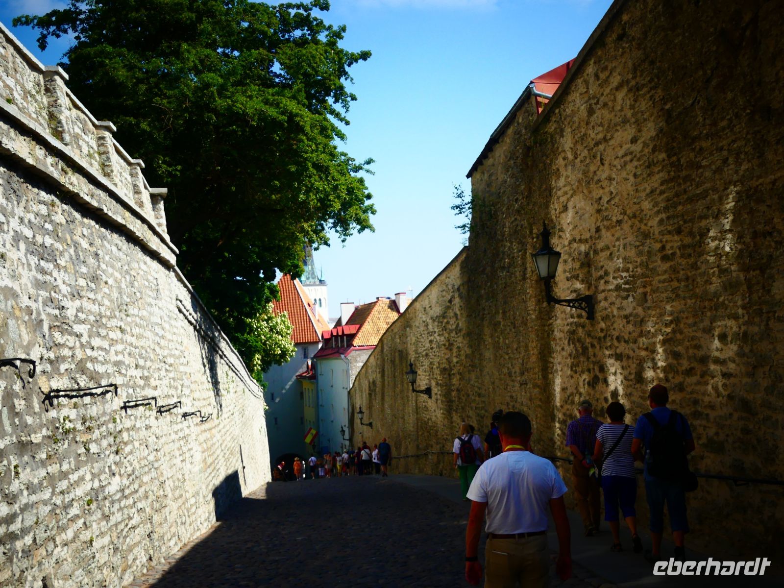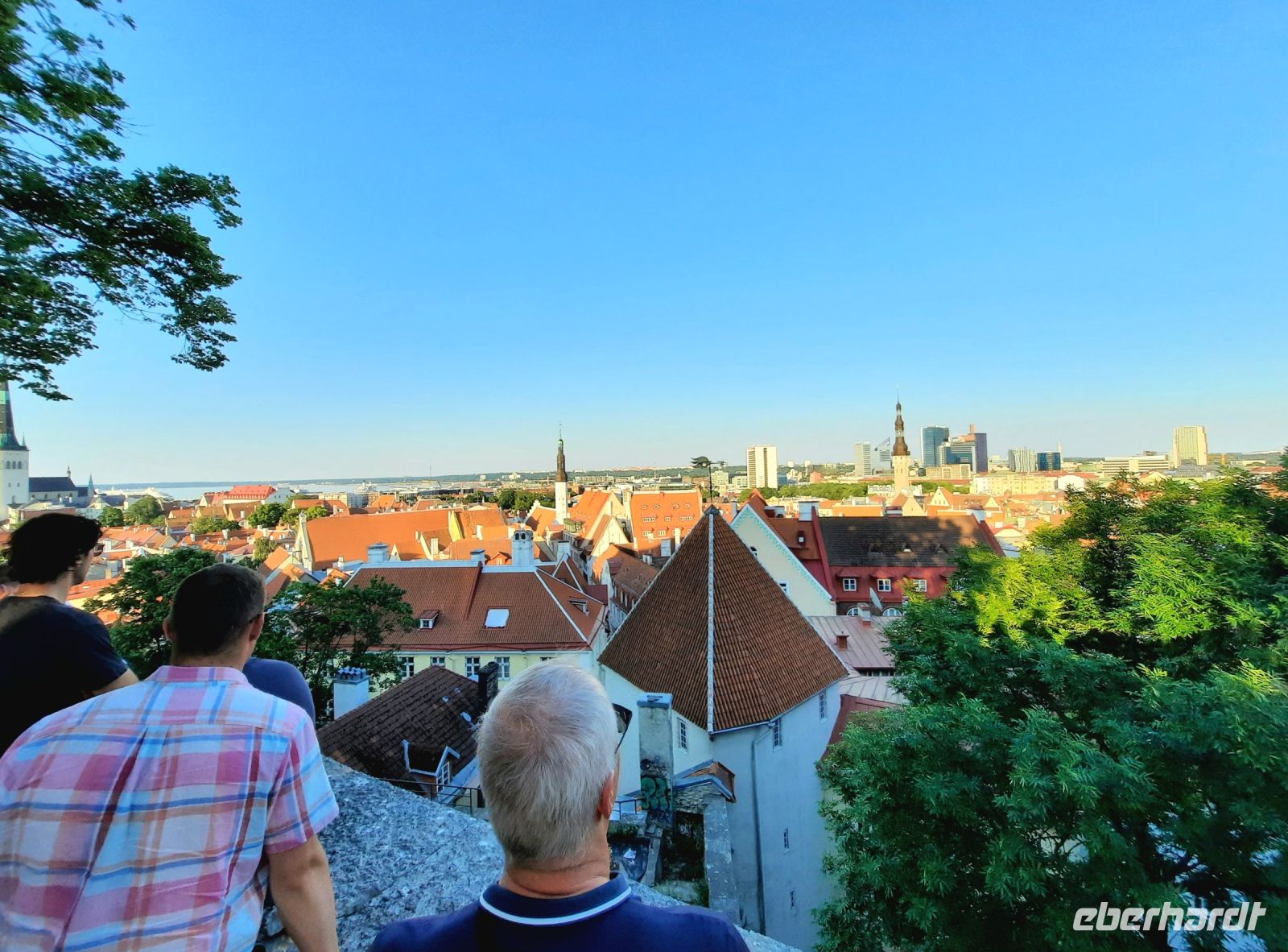 Bei Sonnenschein und sommerlichen Temperaturen begaben wir uns auf eine Erkundungsfahrt durch Tallinn, deren mittelalterliche Altstadt auch auf der Liste des UNESCO-Weltkulturerbe steht. Zur Geschichte: Im 11. Jhd. entstand auf dem heutigen Domberg eine Bauernburg und wurde später als Dänenstadt bekannt. Anfang des 13. Jhd. trat der deutsche Schwertritterorden an die Macht und holte deutsche Handwerker und Kaufleute in die Stadt. Durch den Salzhandel entwickelte sich Tallinn zu einer bedeutenden Hansestadt, wobei die Kaufleute immer mehr Einfluss erlangten. So wurde die Stadt geteilt. Die Oberstadt war den Adeligen und Geistlichen vorbehalten (Domgilde), während die Unterstadt (auch eigenes Münzrecht), wo die Kaufleute wohnten, von einem gewählten Magistrat verwaltet wurde. Mit dem Bus fuhren wir zunächst in die Vororte Tallinns. An der bekannten Sängerwiese machten wir einen Fotostopp. Die legendären Sängerfeste haben eine lange Tradition und sind auch durch die jüngste Geschichte mit der Singenden Revolution bekannt. Auf der muschelförmigen Bühne können ca. 30.0000 Sänger Platz nehmen, deren Gesang fast 500.000 Besucher erleben können. Nicht nur die Größe, sondern auch der weite Blick auf die Tallinner Bucht und über die Stadt faszinierte uns. Nach einer technischen Pause am Passagierhafen fuhren wir mit dem Bus zur Oberstadt.