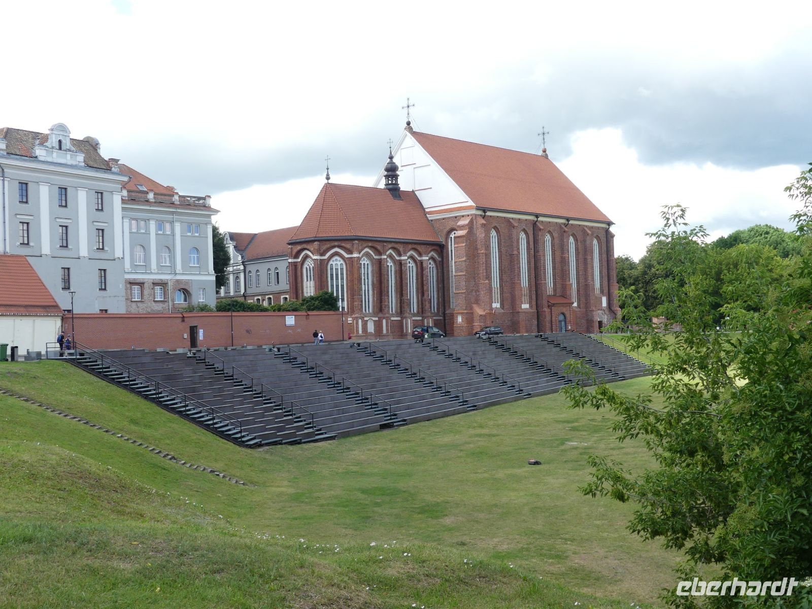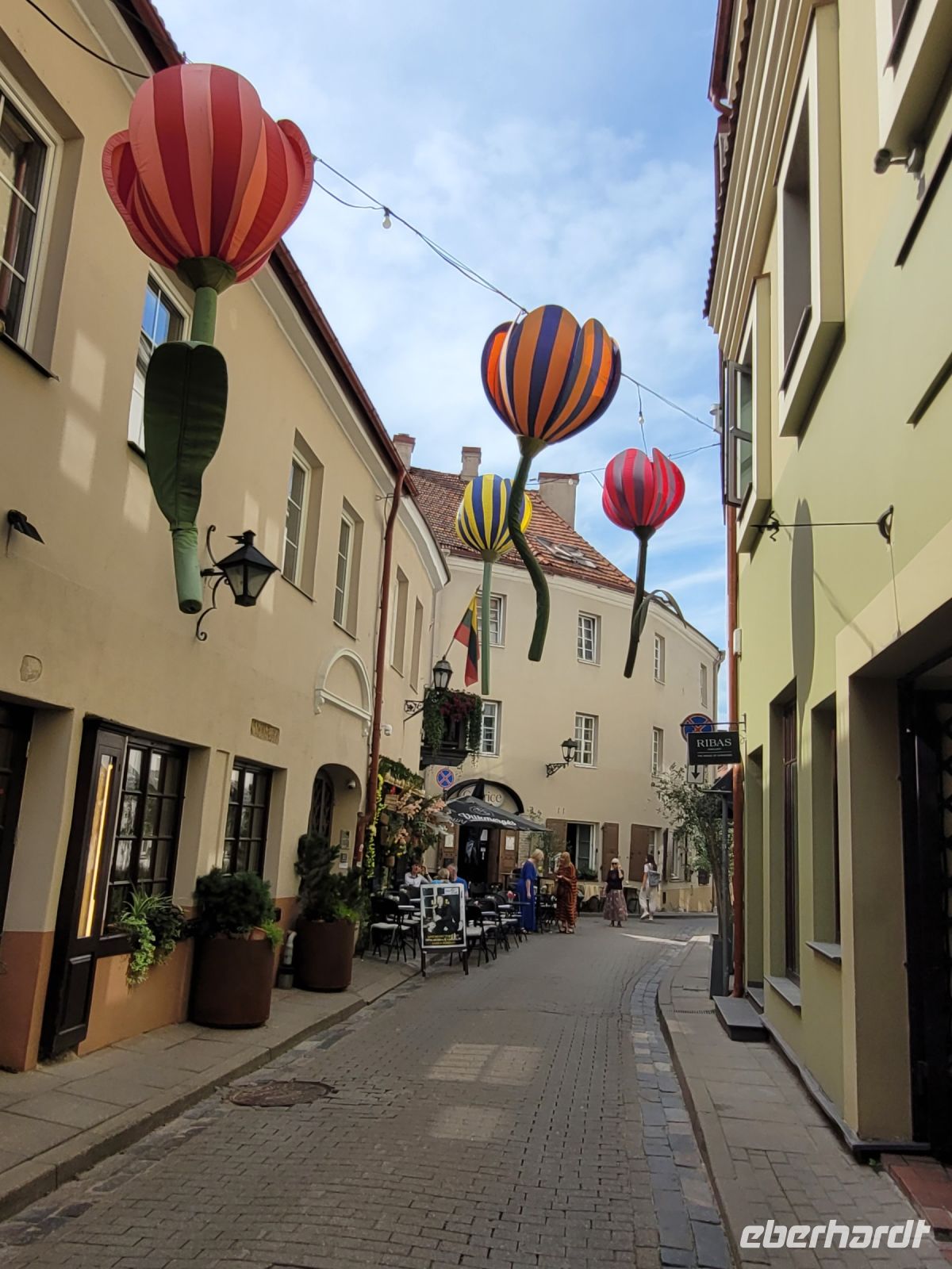 Nach dem guten Frühstück erwartete uns Davia vor der Rezeption zum Stadtrundgang. Ein Gewitter bahnte sich an, deshalb deckten wir uns schnell noch mit Regenschirmen vom Hotel ein. Die Hauptstadt von Litauen, ist für seine Barockarchitektur bekannt, die sich besonders in der mittelalterlichen Altstadt zeigt. Die Gebäude an diesen zum Teil mit Kopfsteinpflaster belegten Straßen spiegeln jedoch unterschiedliche Stile und Zeiten wieder. Sehenswert sind die St.-Annen-Kirche, ein gotisches Backsteingebäude zusammen mit der ebenfalls gotischen Bernhardiner-Kirche, die barocke Universitätsanlage mit der Johannes-Kirche. Die Wahrzeichen der Stadt sind die Ruine der Burg von Gediminas auf dem gleichnamigen Hügel aus dem 14. und 15. Jh. sowie an ihrem Fuße die klassizistische römisch-katholische Kathedrale Sankt Stanislaus mit ihrem etwas abseitsstehenden Glockenturm. Sehr beeindruckend fanden wir „Der tanzende Jude" als Mahnmal für ein ehemaliges Getto.
