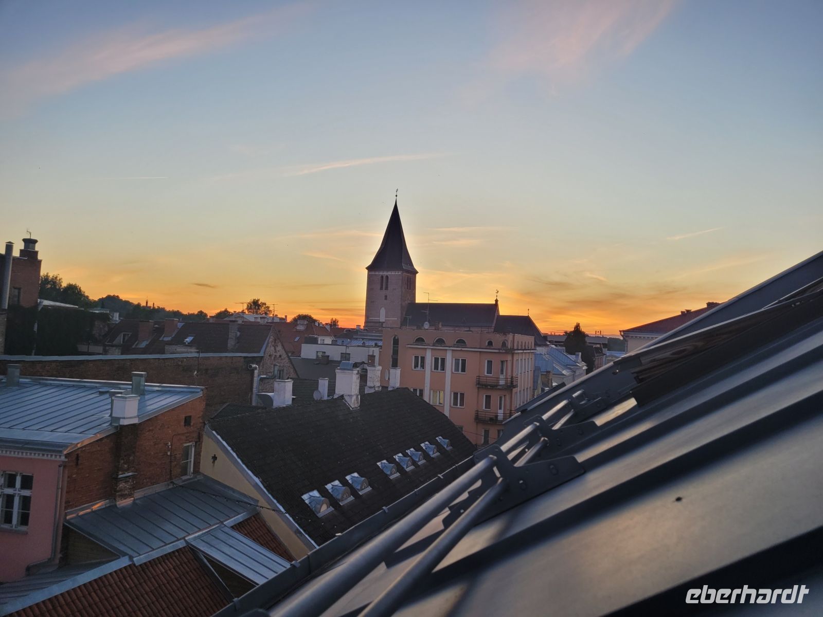 Durch die verschiedenen Flüge traf sich unsere 18 Gäste starke reiselustige Gruppe erst zum Abendessen im Hotel. Ein Teil hatte den Nachmittag schon in der Altstadt von Vilnius (Welle) verbracht. Wunderschön liegt die Stadt an der Mündung der Vilnia in die Neris, in einem waldreichen Gebiet nur etwa 40 km von der weißrussischen Grenze entfernt. 20.00 traf sich unsere EHT - Gruppe zum gemeinsamen Abendessen Im Hotelrestaurant. Hatten wir einen Appetit! Es gab ein leckeres Kürbissüppchen, Hähnchen mit Gemüsebeilage und als Dessert ein Törtchen. So gestärkt ließen wir ganz gemütlich den ersten Tag oben auf der Terrasse mit einem wunderschönen Sonnenuntergang ausklingen.