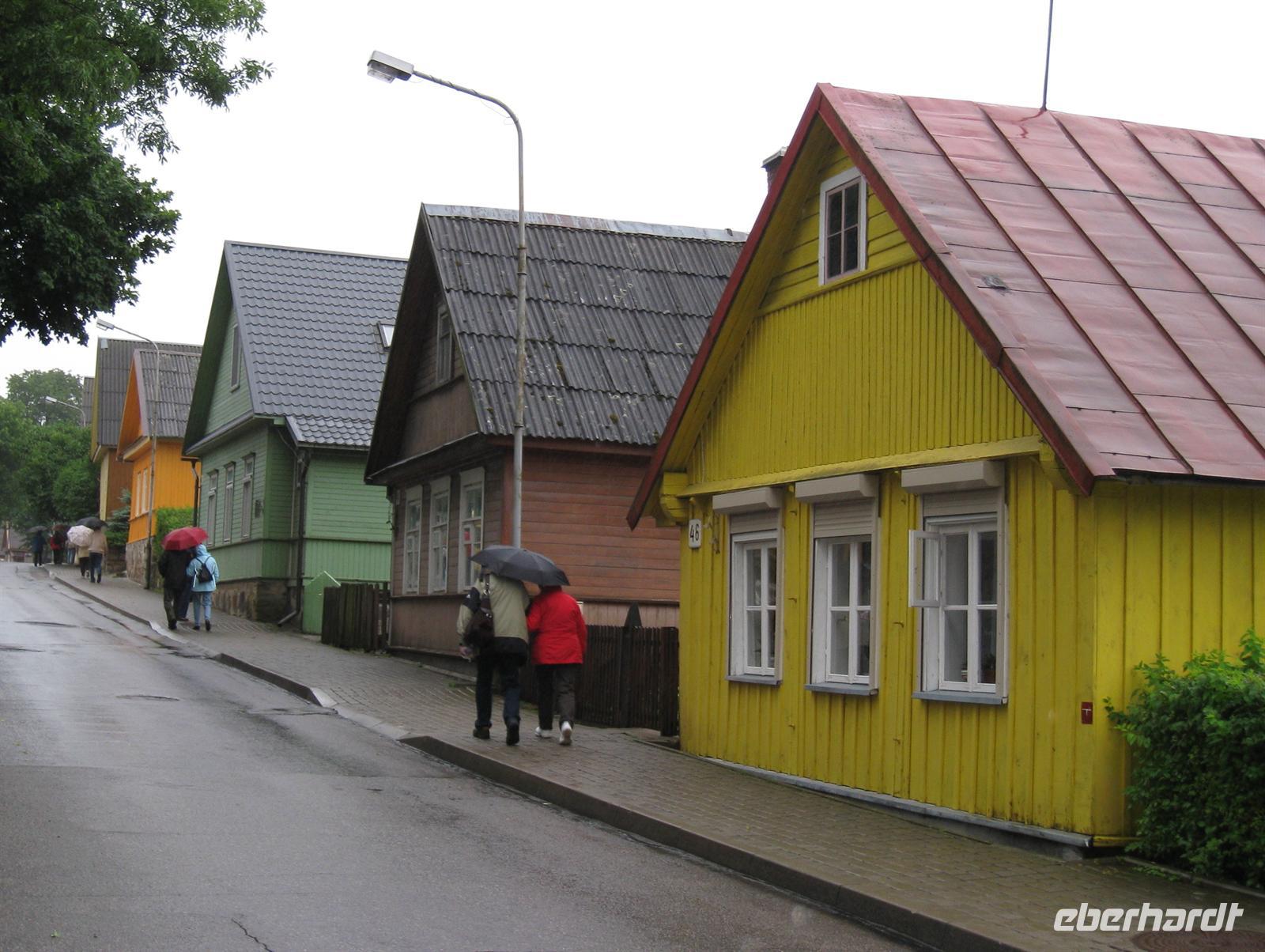 Trakai die einzige Wasserburg des Baltikums, einst Gründungsfeste des mächtigen litauischen Fürstentums, steht aus rotem Stein gemauert mitten im See. Den blauen Himmel dachten wir uns beim Kosten von Kibinai - einer Teigtasche der hier wohnenden Karäer- hinzu. Durch deren Dorfstraße voller farbintensiver Häuser gelangten wir zum Bus.