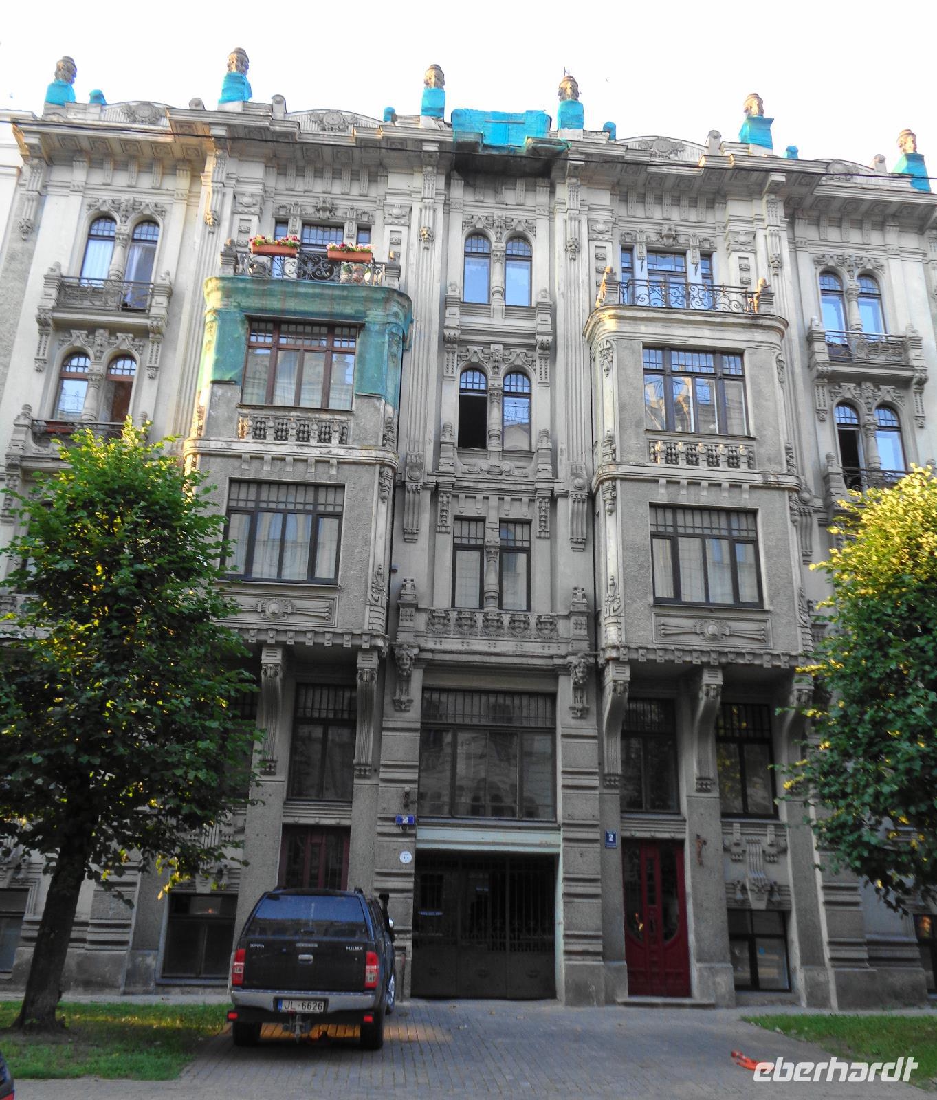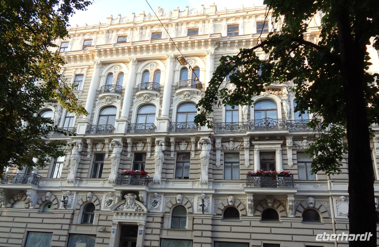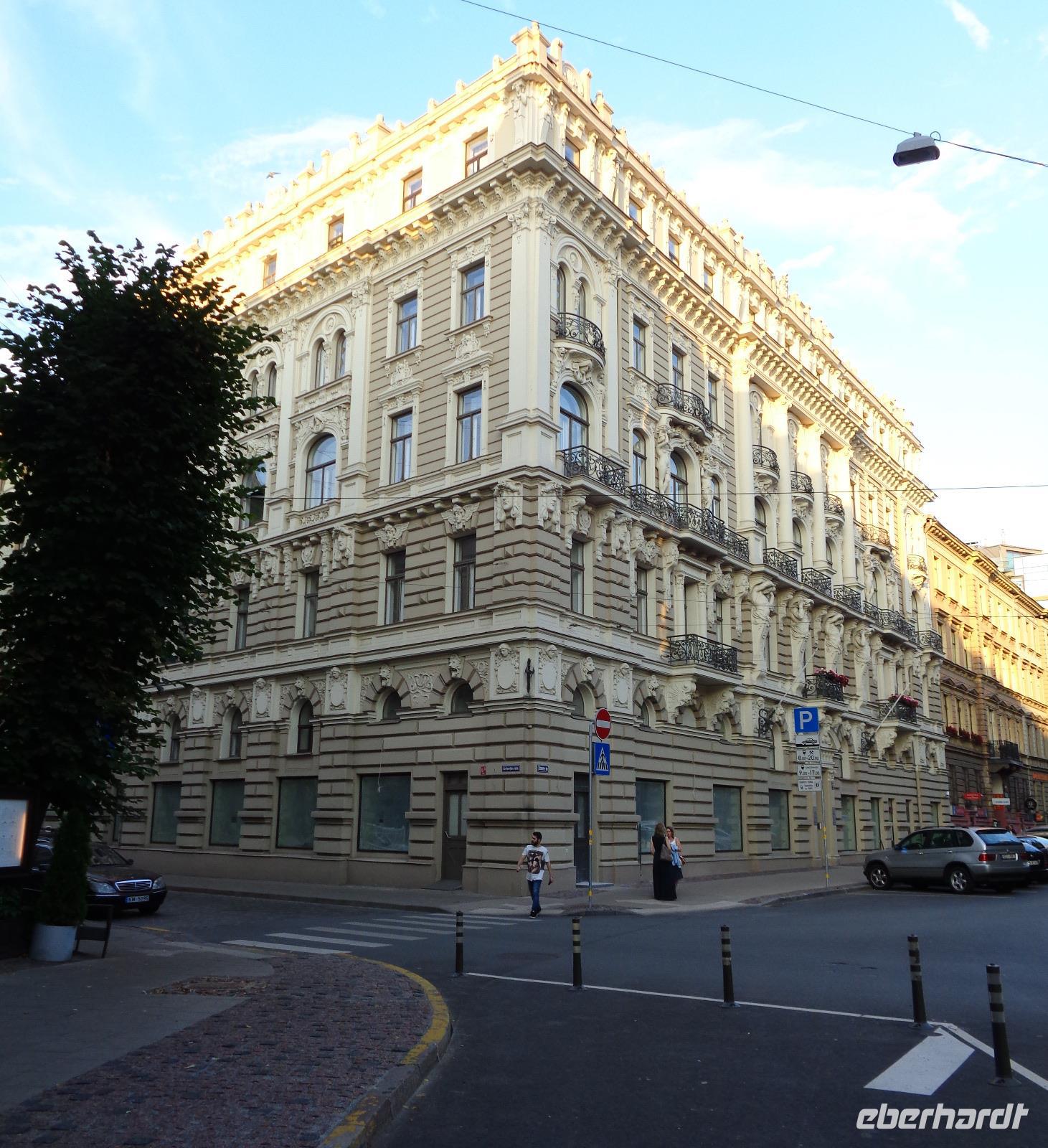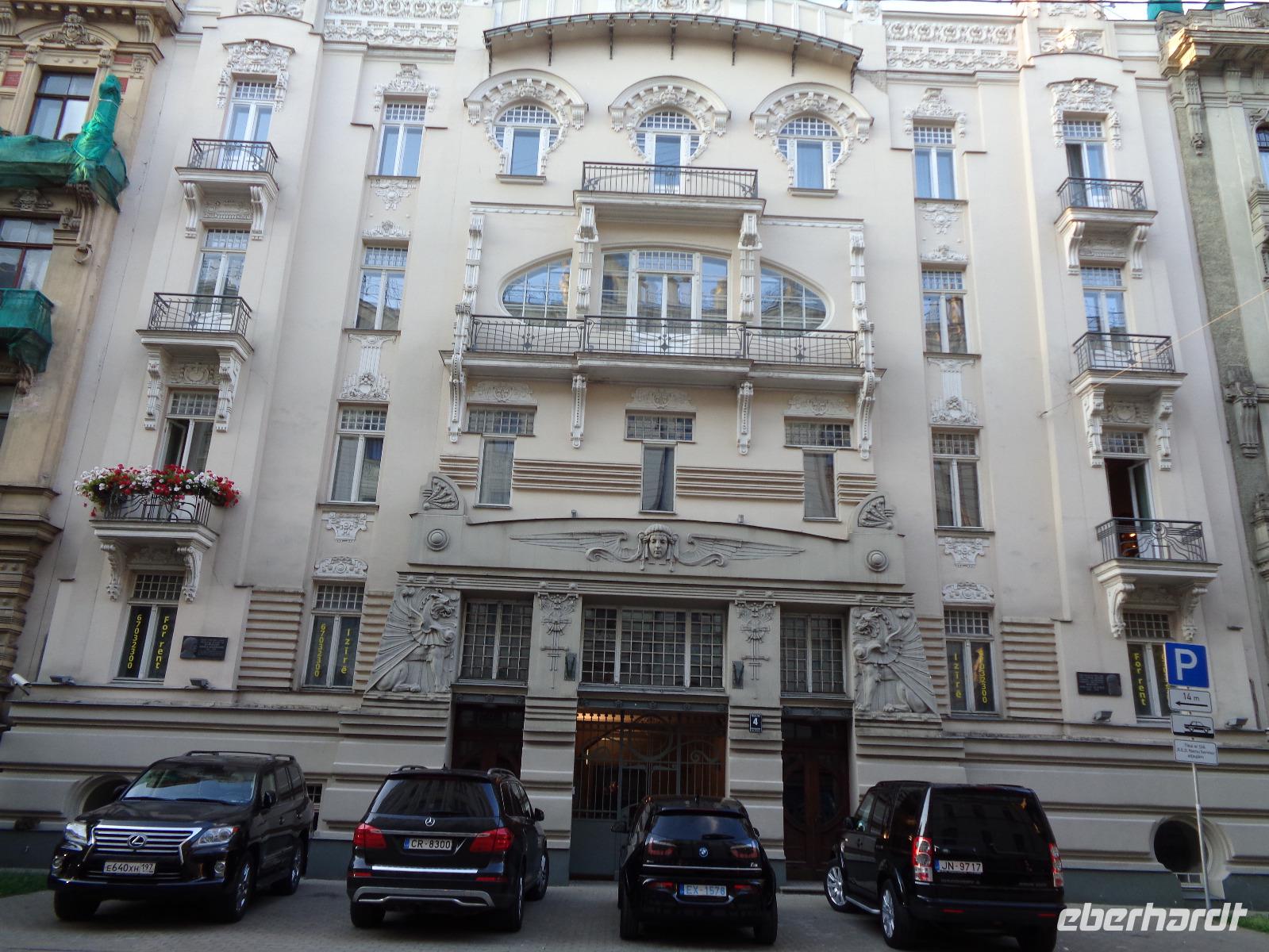 Gleich vom Hotel aus führte uns Birute noch am Abend durch das nordöstlich der Altstadt gelegene Jugendstilviertel, das zum UNESCO-Welterbe gehört. Die mit allerhand nackten Frauen, Fabelwesen, Monstern und Pflanzenornamenten überreich geschmückten Häuser gehören neben Barcelona, Wien und Paris zu den bedeutendsten Zeugnissen des Jugendstils in Europa. Der Architekt Michail Eisenstein entwarf um die Jahrhundertwende 19./20. Jh. rund 50 dieser Häuser, insgesamt gibt es in Riga ca. 800 von diesen ehemaligen Mietshäusern.