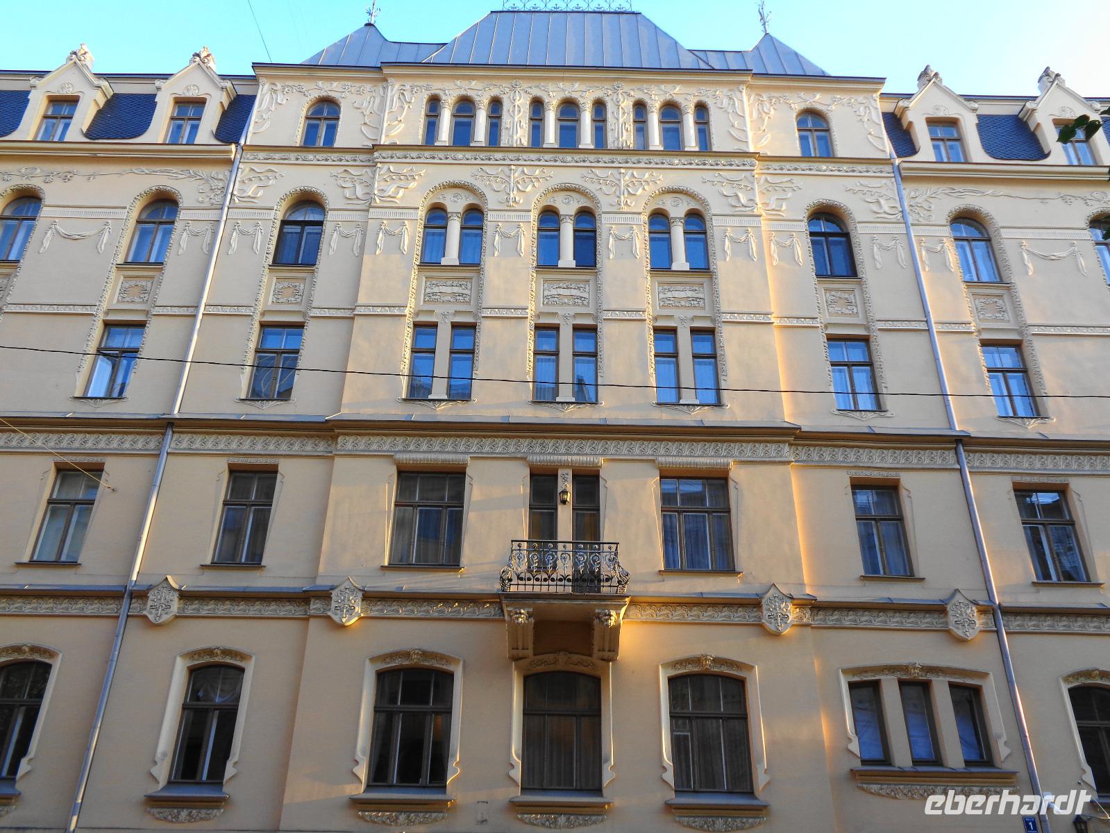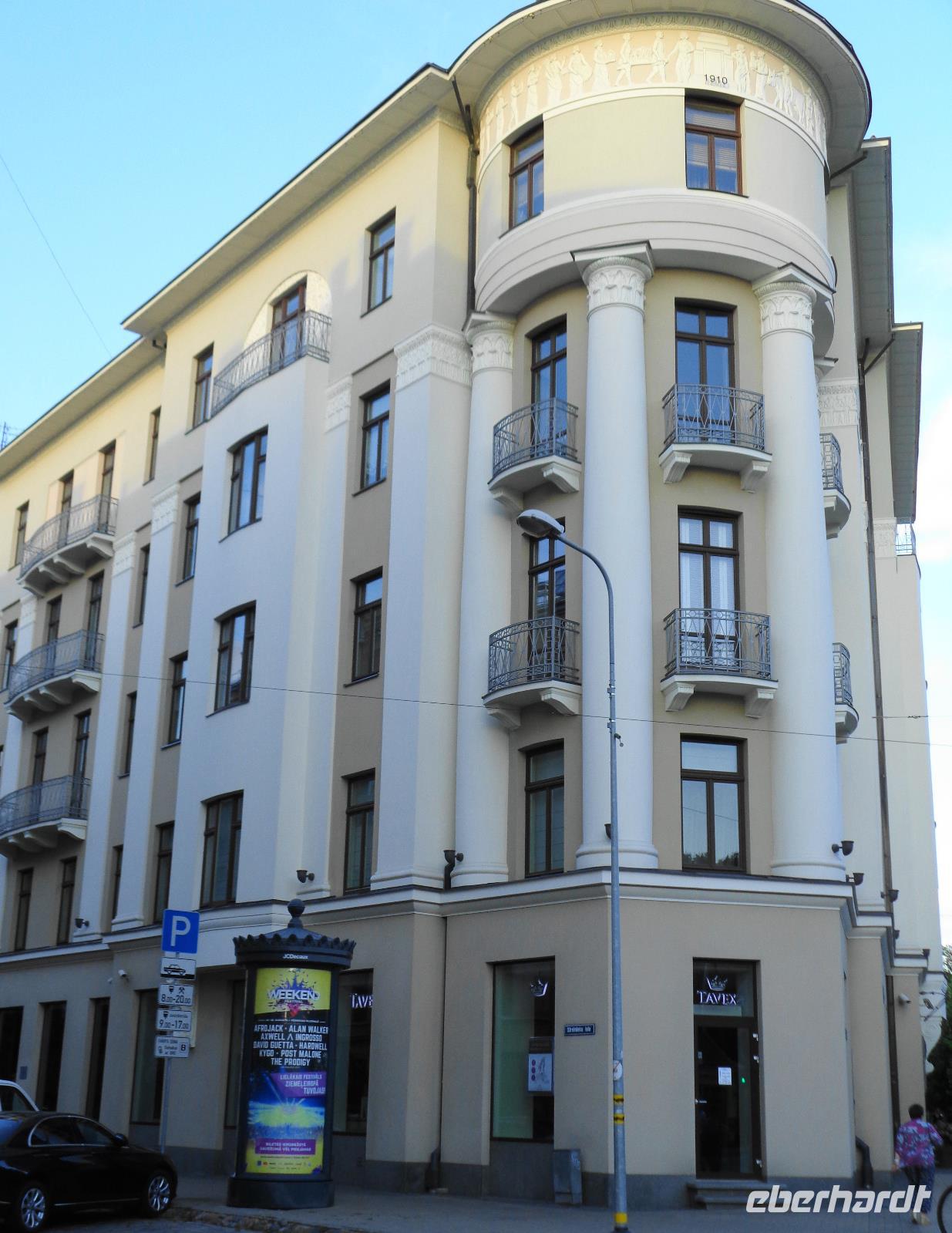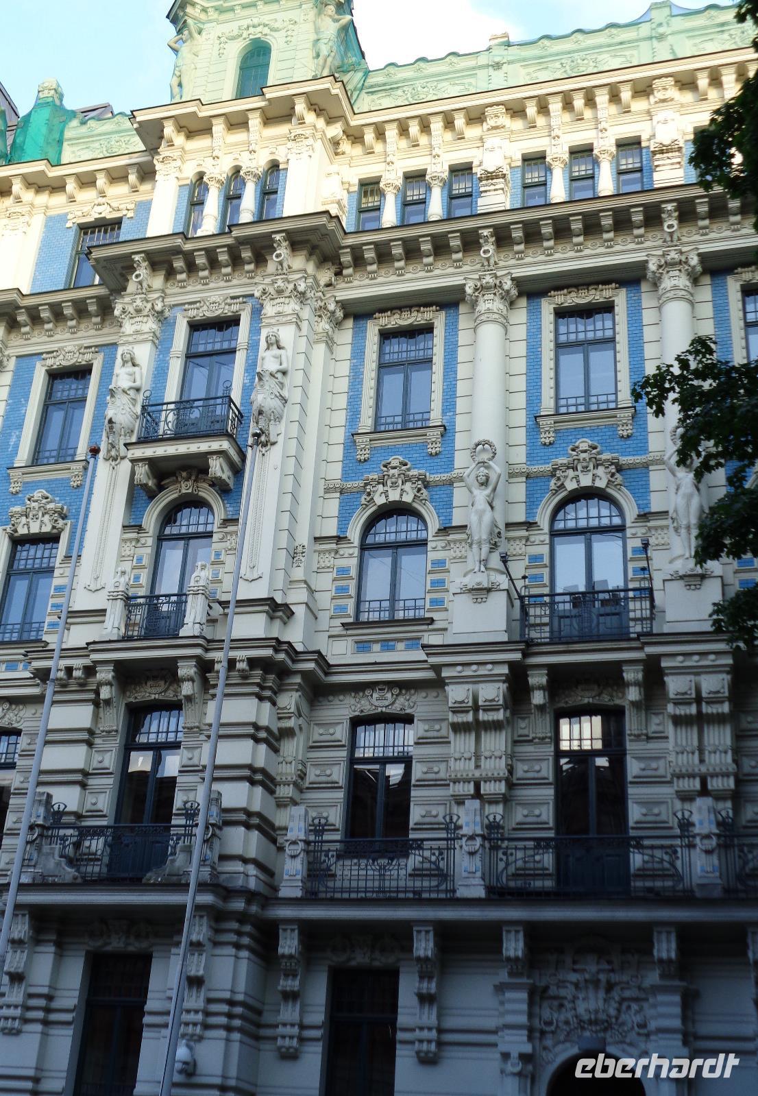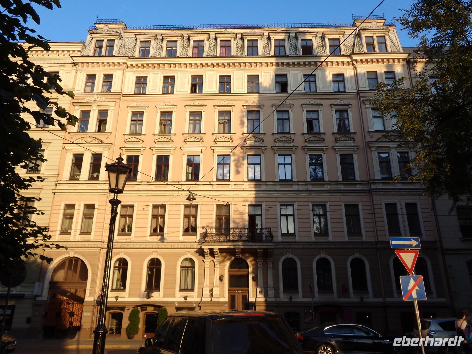 Gleich vom Hotel aus führte uns Birute noch am Abend durch das nordöstlich der Altstadt gelegene Jugendstilviertel, das zum UNESCO-Welterbe gehört. Die mit allerhand nackten Frauen, Fabelwesen, Monstern und Pflanzenornamenten überreich geschmückten Häuser gehören neben Barcelona, Wien und Paris zu den bedeutendsten Zeugnissen des Jugendstils in Europa. Der Architekt Michail Eisenstein entwarf um die Jahrhundertwende 19./20. Jh. rund 50 dieser Häuser, insgesamt gibt es in Riga ca. 800 von diesen ehemaligen Mietshäusern.