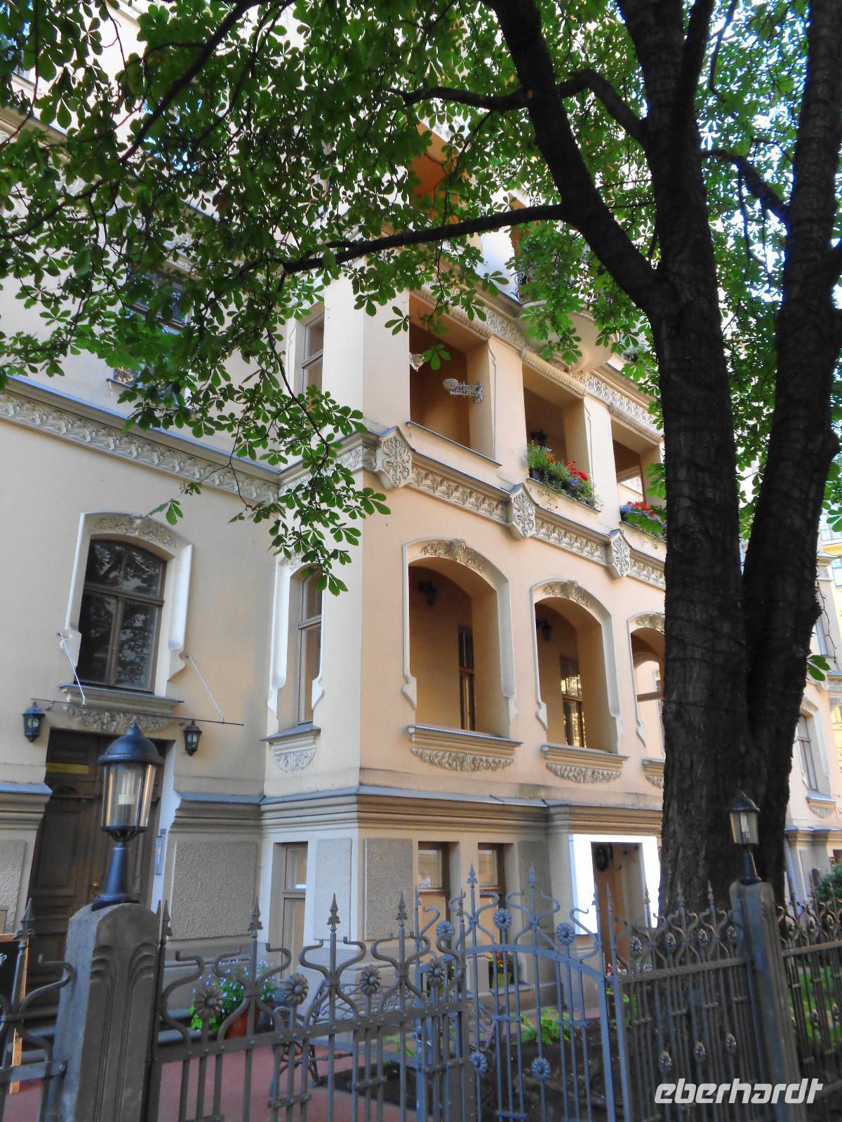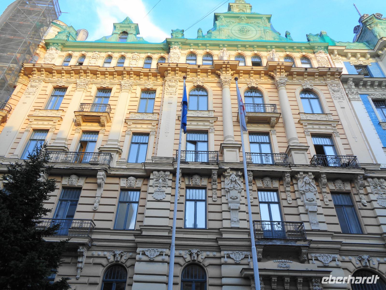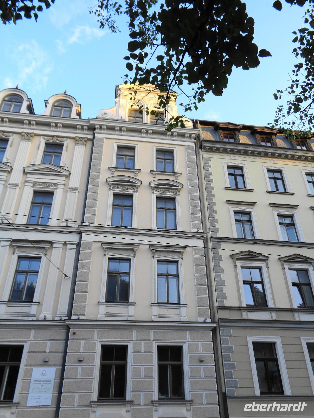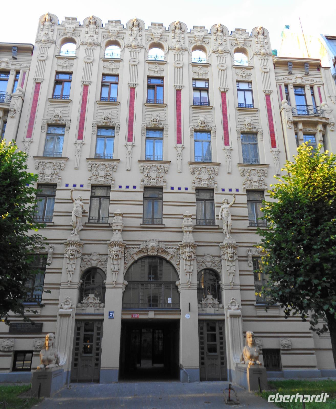 Gleich vom Hotel aus führte uns Birute noch am Abend durch das nordöstlich der Altstadt gelegene Jugendstilviertel, das zum UNESCO-Welterbe gehört. Die mit allerhand nackten Frauen, Fabelwesen, Monstern und Pflanzenornamenten überreich geschmückten Häuser gehören neben Barcelona, Wien und Paris zu den bedeutendsten Zeugnissen des Jugendstils in Europa. Der Architekt Michail Eisenstein entwarf um die Jahrhundertwende 19./20. Jh. rund 50 dieser Häuser, insgesamt gibt es in Riga ca. 800 von diesen ehemaligen Mietshäusern.
