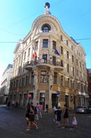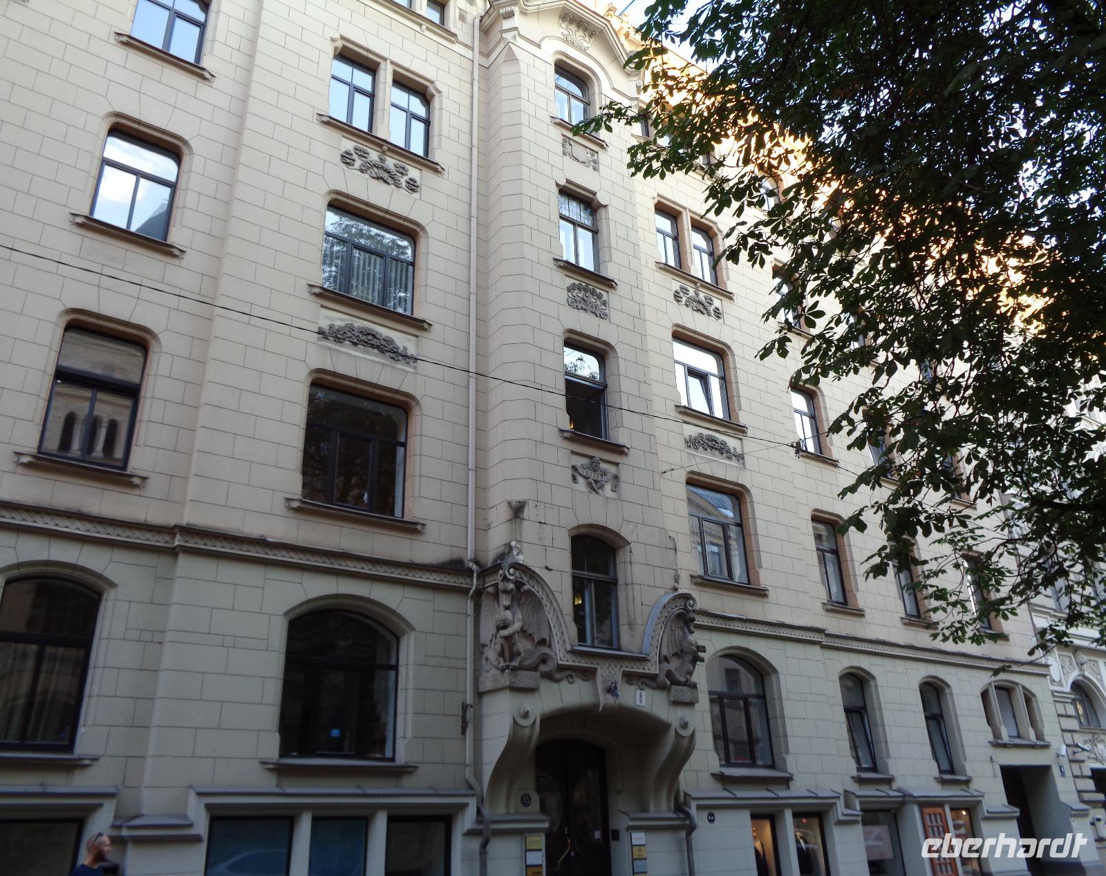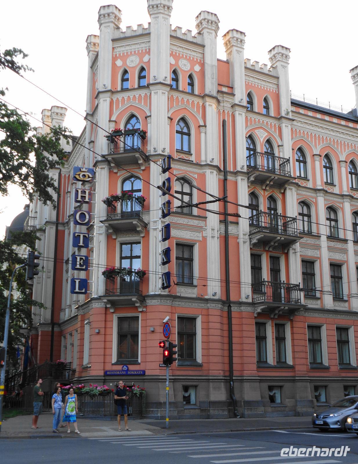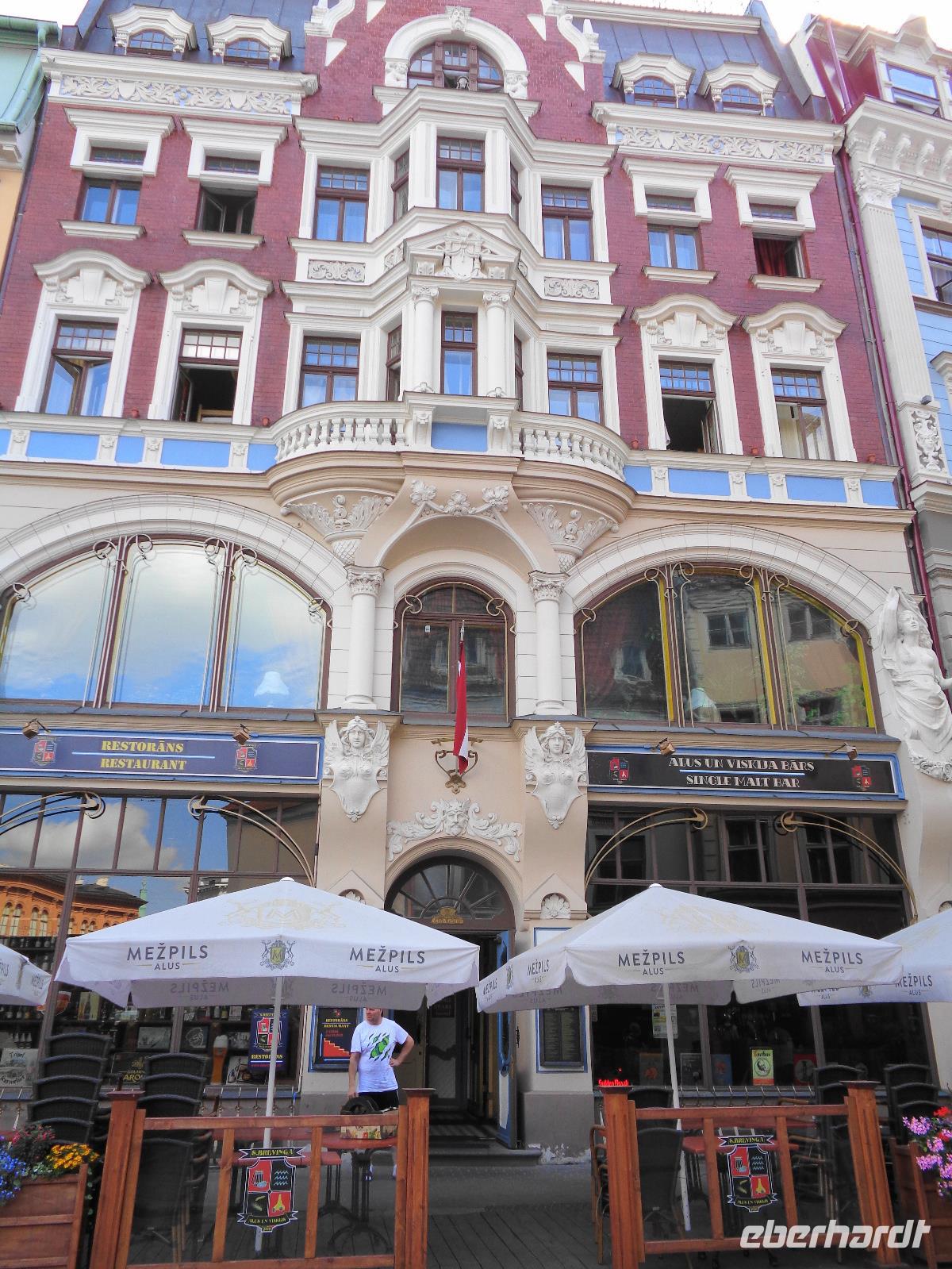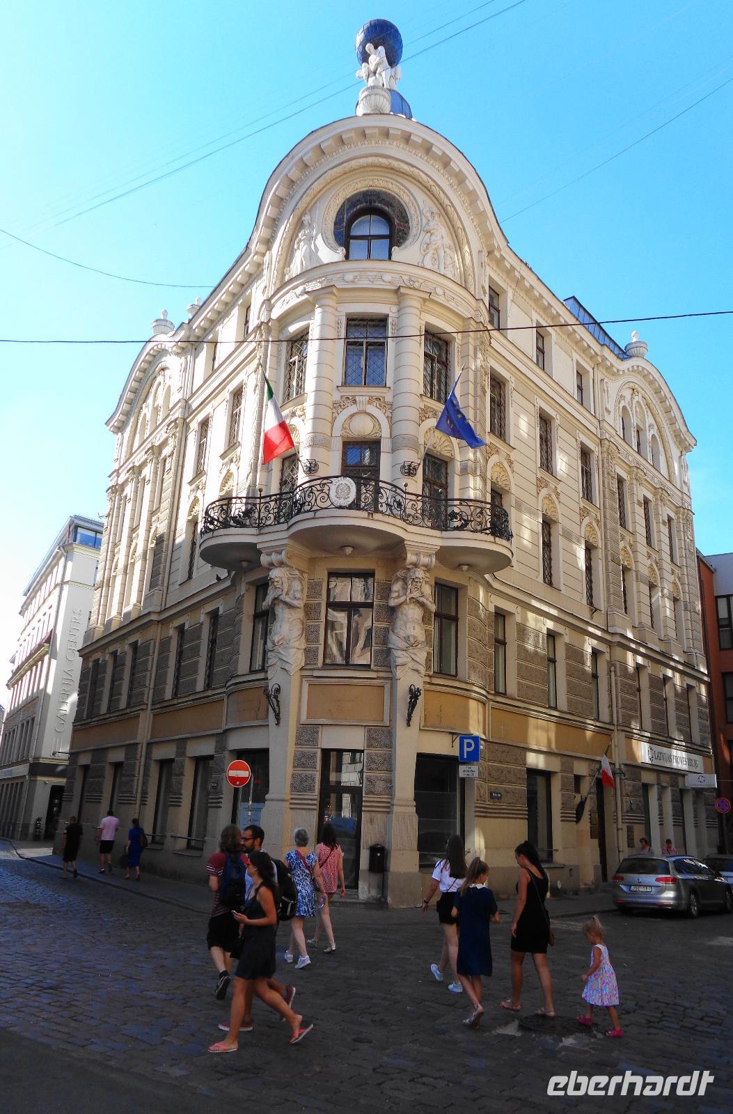 Gleich vom Hotel aus führte uns Birute noch am Abend durch das nordöstlich der Altstadt gelegene Jugendstilviertel, das zum UNESCO-Welterbe gehört. Die mit allerhand nackten Frauen, Fabelwesen, Monstern und Pflanzenornamenten überreich geschmückten Häuser gehören neben Barcelona, Wien und Paris zu den bedeutendsten Zeugnissen des Jugendstils in Europa. Der Architekt Michail Eisenstein entwarf um die Jahrhundertwende 19./20. Jh. rund 50 dieser Häuser, insgesamt gibt es in Riga ca. 800 von diesen ehemaligen Mietshäusern.