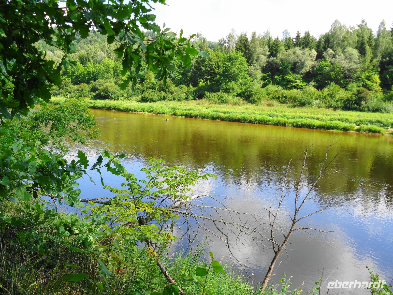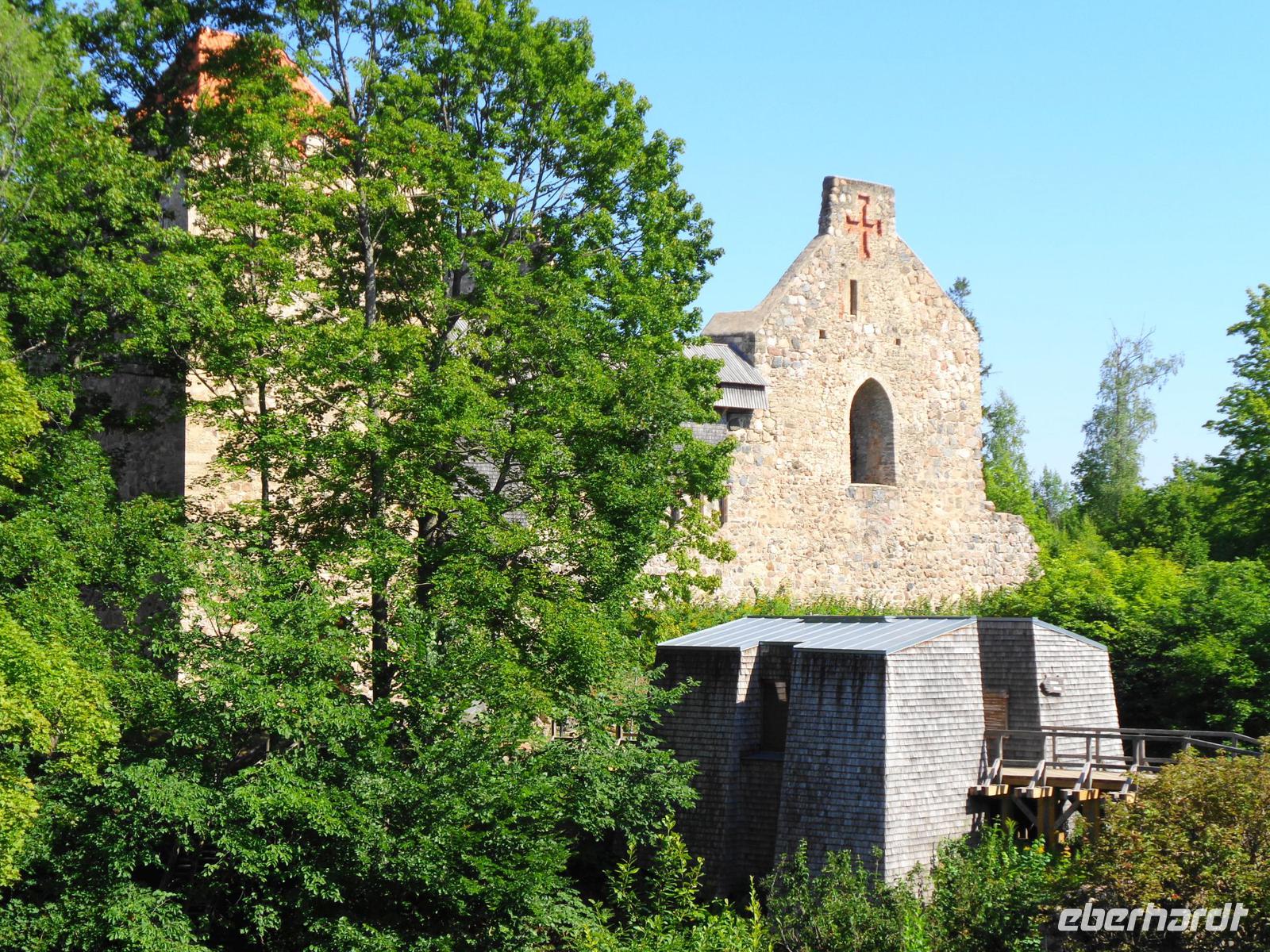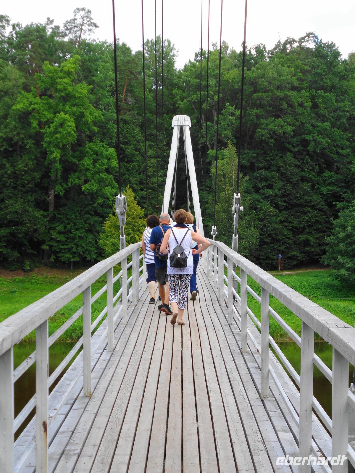 Weiter ging unsere Reise heute zum ca. 50 km von Riga entfernten Gauja-Nationalpark. Zunächst machten wir einen Zwischenstopp an der Bob- und Rodelbahn von Sigulda (Segewold), die Sportinteressierten von internationalen Wettkämpfen bekannt ist. Vom Startpunkt aus hatten wir eine herrliche Fernsicht und konnten sogar die Lettische Skeletonmannschaft beim Sommertraining beobachten. Interessant auch die Ruine der alten Ordensburg und das benachbarte „Neue Schloss" in dem vielbesuchten Ferienort am Rande des Nationalparks.