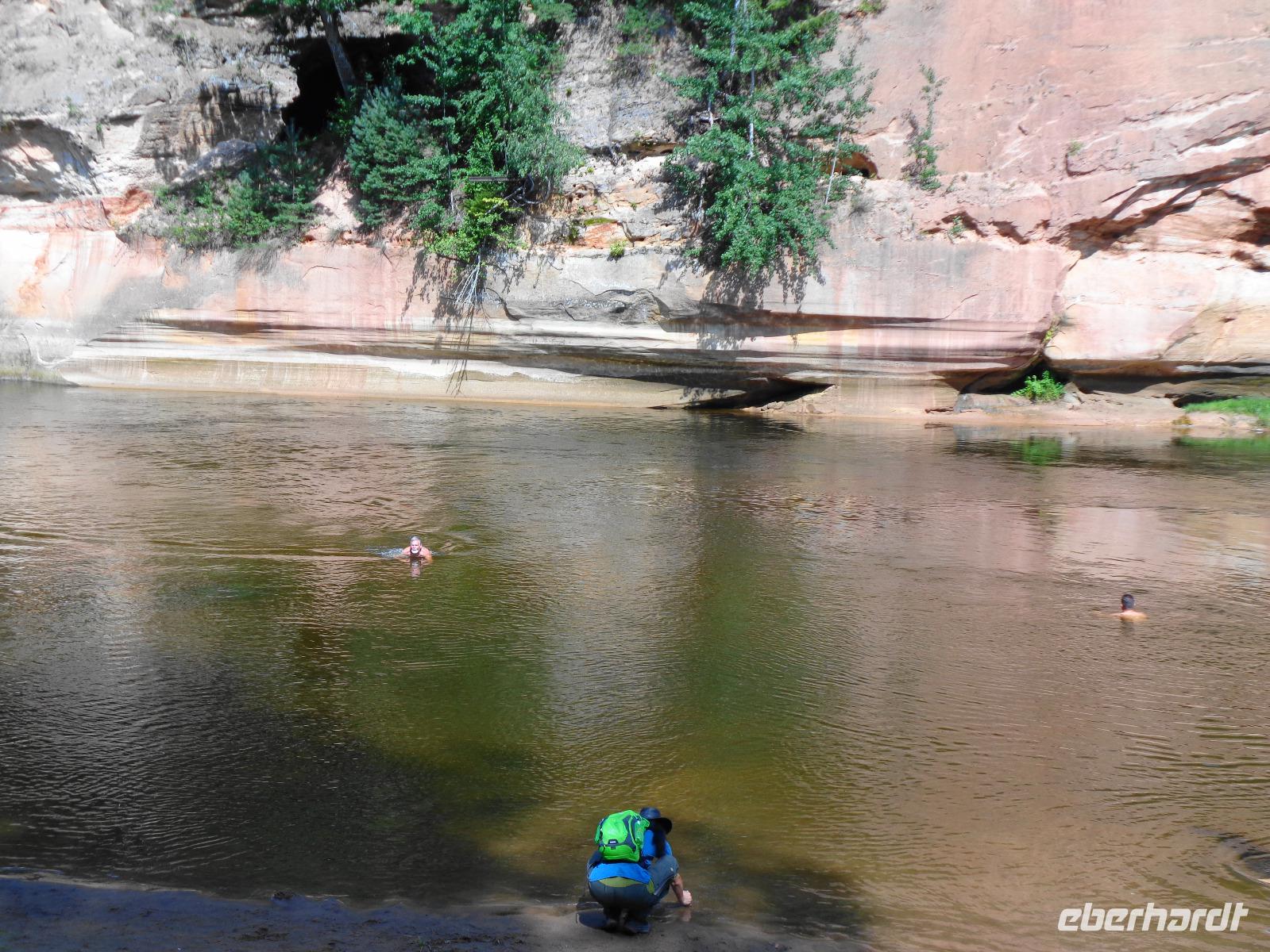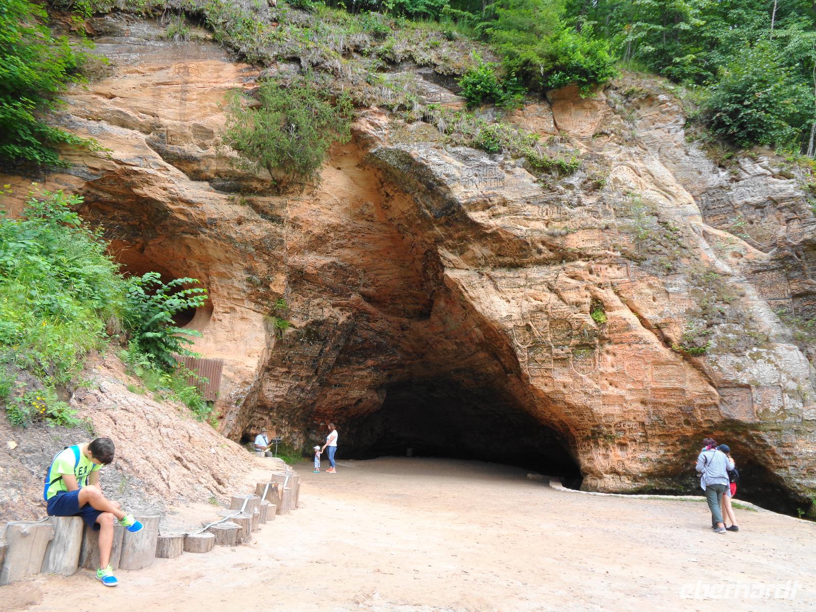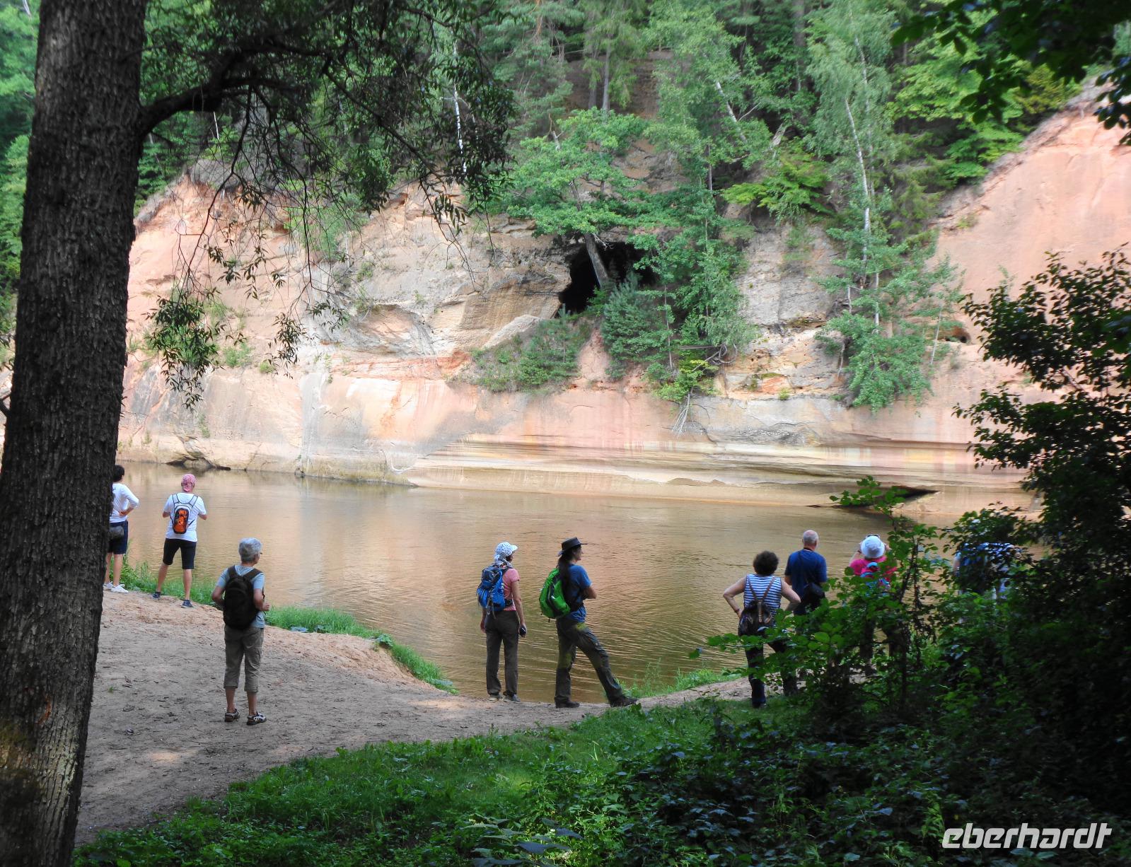 Mit seinen 917 km2 ist der Gauja-Nationalpark der größte des Baltikums. Die grandiose Landschaft des Urstromtals der Gauja mit über 30 m hohen Sandsteinfelsen und zahlreichen Höhlen ist ein Eldorado für Naturfreunde. Unsere Wanderung durch die „Livländische Schweiz" führte uns an die Ufer der Gauja mit ihren beeindruckenden Steilufern und einige unserer Wasserratten nützten auch hier die Möglichkeit zu einem erfrischenden Bad. An der Gutmannshöhle, der größten im Baltikum, lauschten wir der Geschichte von der tragischen Liebe eines jungen Mädchens, der „Rose von Turaida", zu zwei Männern.