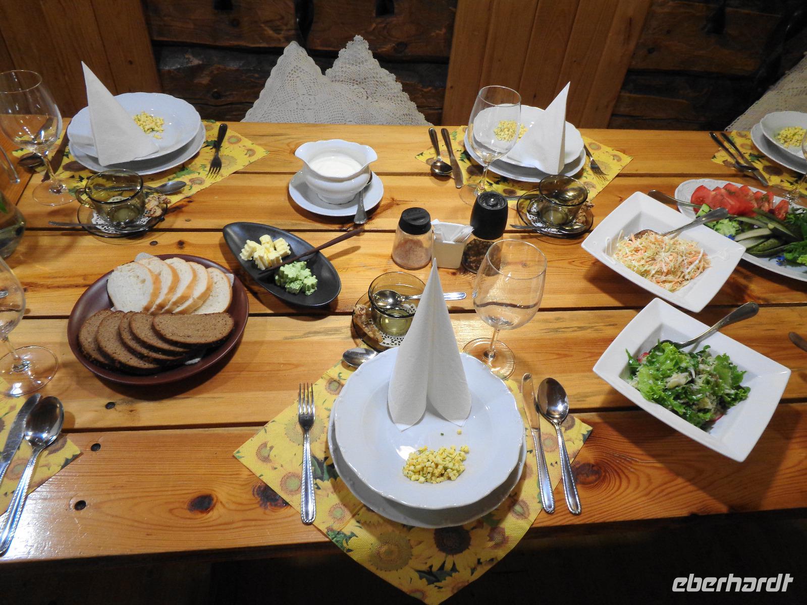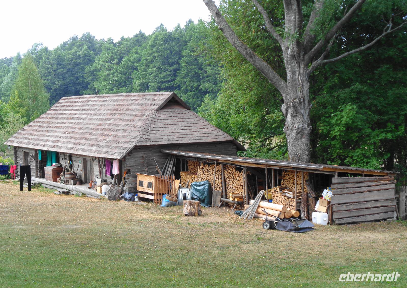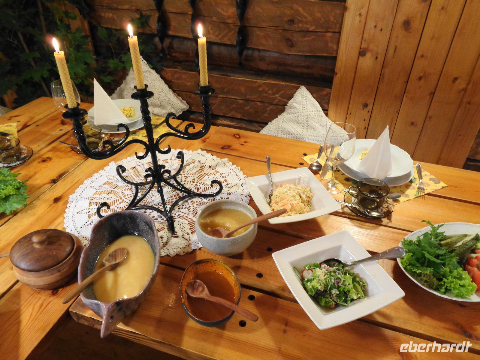 Zum Abendessen erwartete uns heute etwas ganz Besonderes: auf dem Bauernhof Zipare hieß uns die Bauersfamilie mit einem typisch lettischen Abendessen willkommen. Vom Hausherrn erfuhren wir, wie er nach der Wende auf der Suche nach neuen Einnahmequellen mit der Produktion von Holzschindeln begonnen hat. Seine Frau züchtet Bienen und bewirtschaftet den wunderschönen alten Hof. An liebevoll gedeckten Tischen servierte sie uns allerlei Salate aus eigenem Anbau, eine schmackhafte Suppe und ein Eintopfgericht. Zum Nachtisch gab es die typische Brotsuppe. Auch Honig verschiedener Reifegrade durften wir verkosten. Tochter Marta und ihre kleine Schwester gaben ein kleines Konzert auf der Kokle, der lettischen Knieharfe. Die ganze Familie war sehr gastfreundlich und beantwortete bereitwillig unsere Fragen, Marta sogar in exzellentem Englisch.