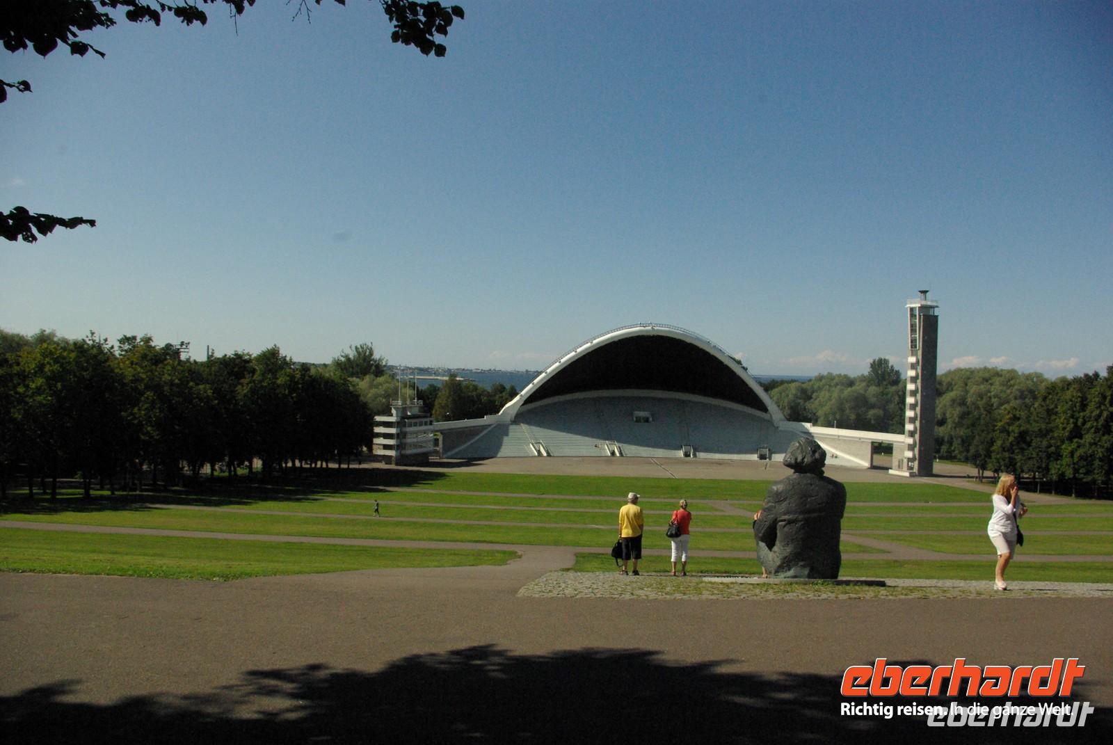 Um 08.30 Uhr startete der Bus nach einem guten Frühstück nach Estland. Wie bei der Einreise nach Lettland gab es keinerlei Grenzformalitäten zu erledigen, aber das Terminal mit guter Infrastruktur bot Gelegenheit zur Pause. Nach einer kleinen Stadtrundfahrt durch den traditionsreichen Badeort Pärnu legten wir am Strand die Mittagspause ein. Gegen 14.30 Uhr waren wir in Tallin und fuhren gleich zur Sängerbühne, die 2500 Sängern und 70.000 Zuschauern Platz bietet. Die baltischen Sängertreffen, in Estland seit 1868 veranstaltet, sind ja quasi wichtigster Ausdruck der kulturellen Identität und des Nationalstolzes dieser Völker, die sich sozusagen in die Unabhängigkeit hinein sangen. Dementsprechend wichtig also der Ort.