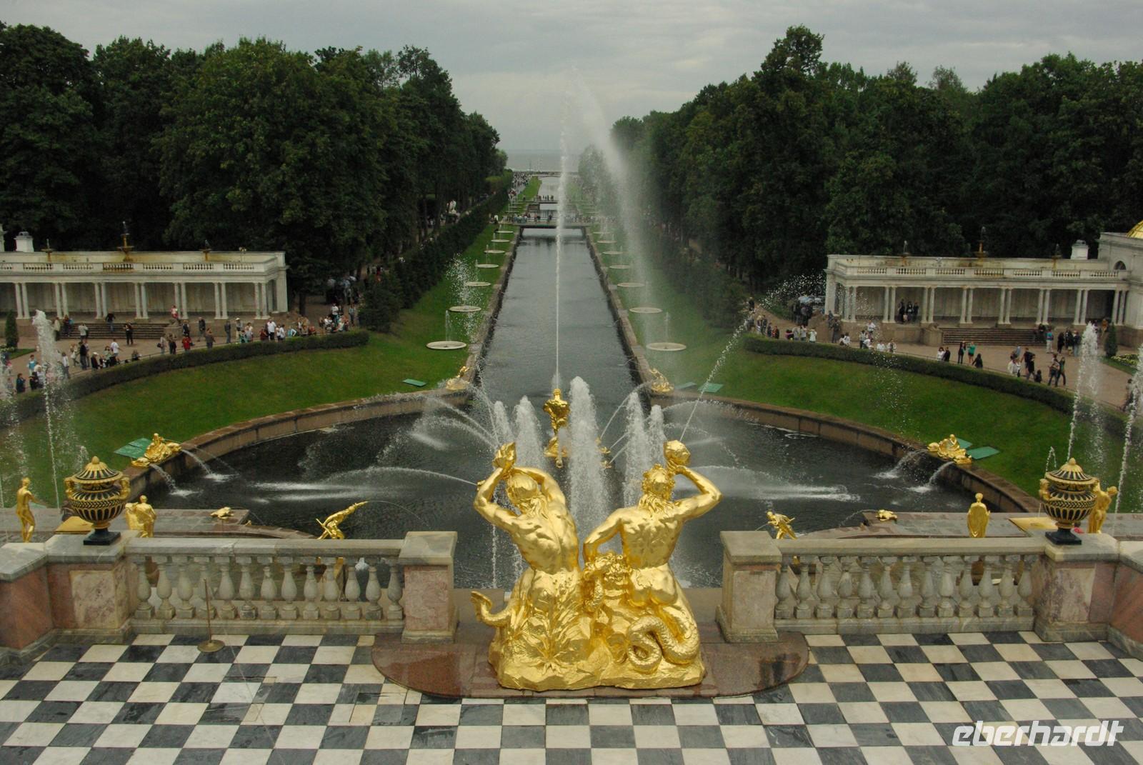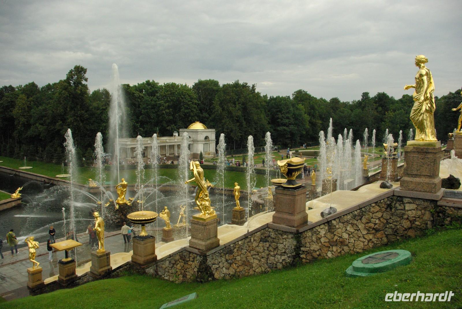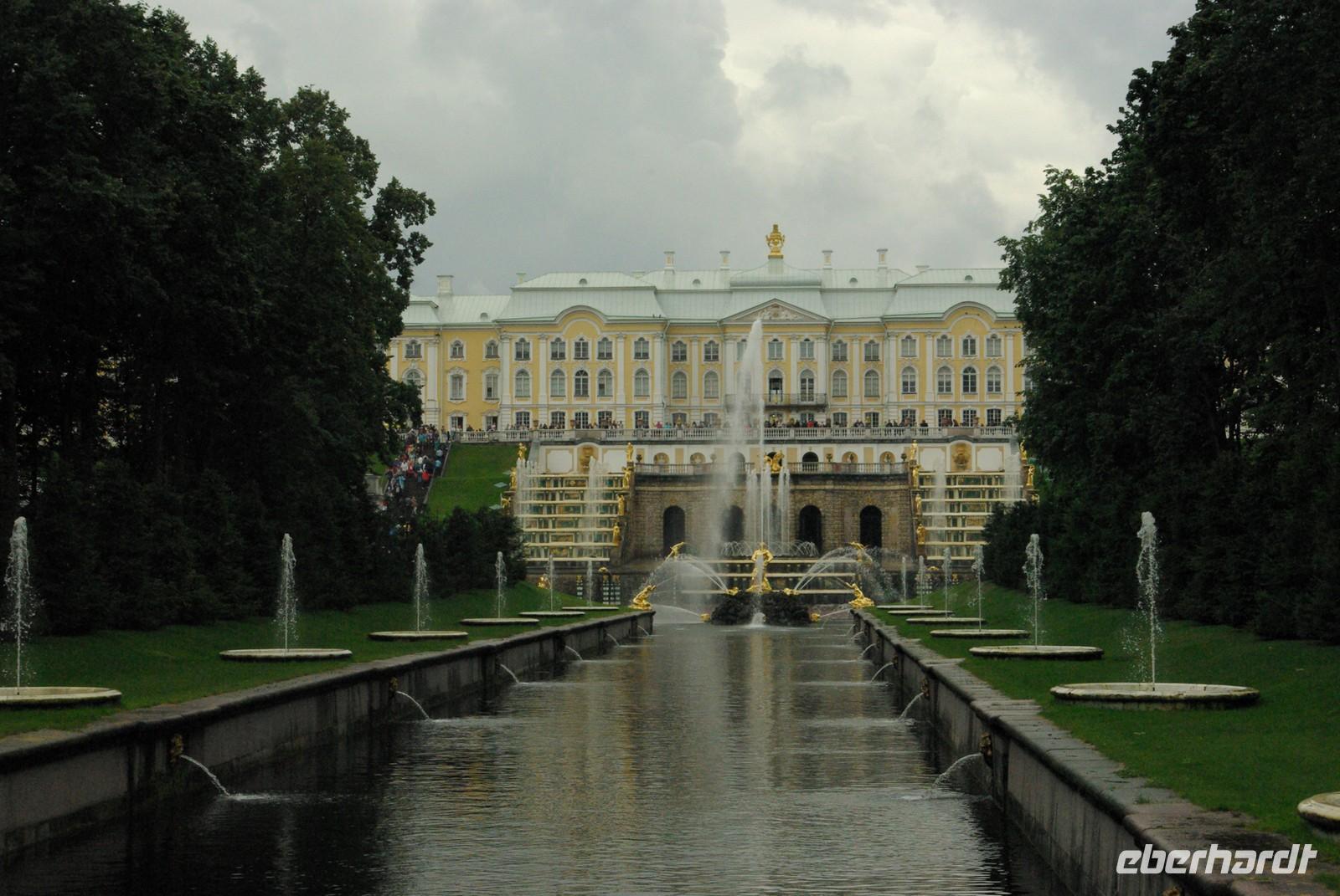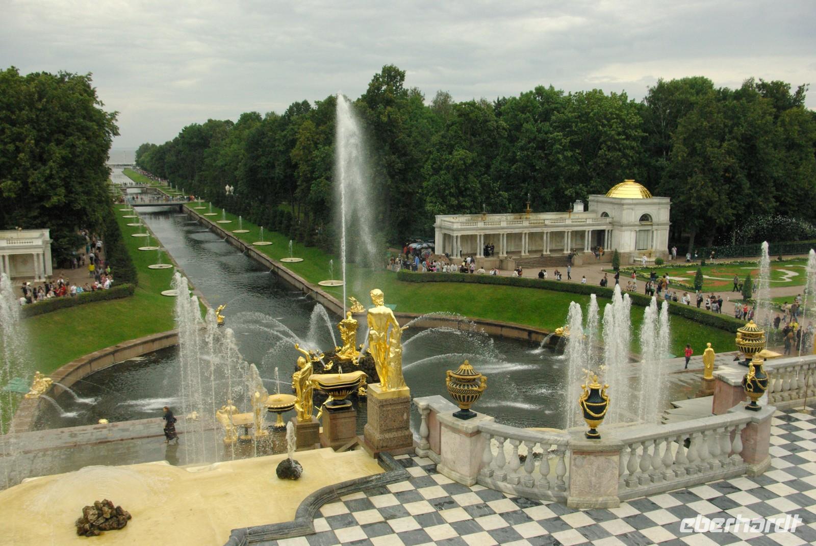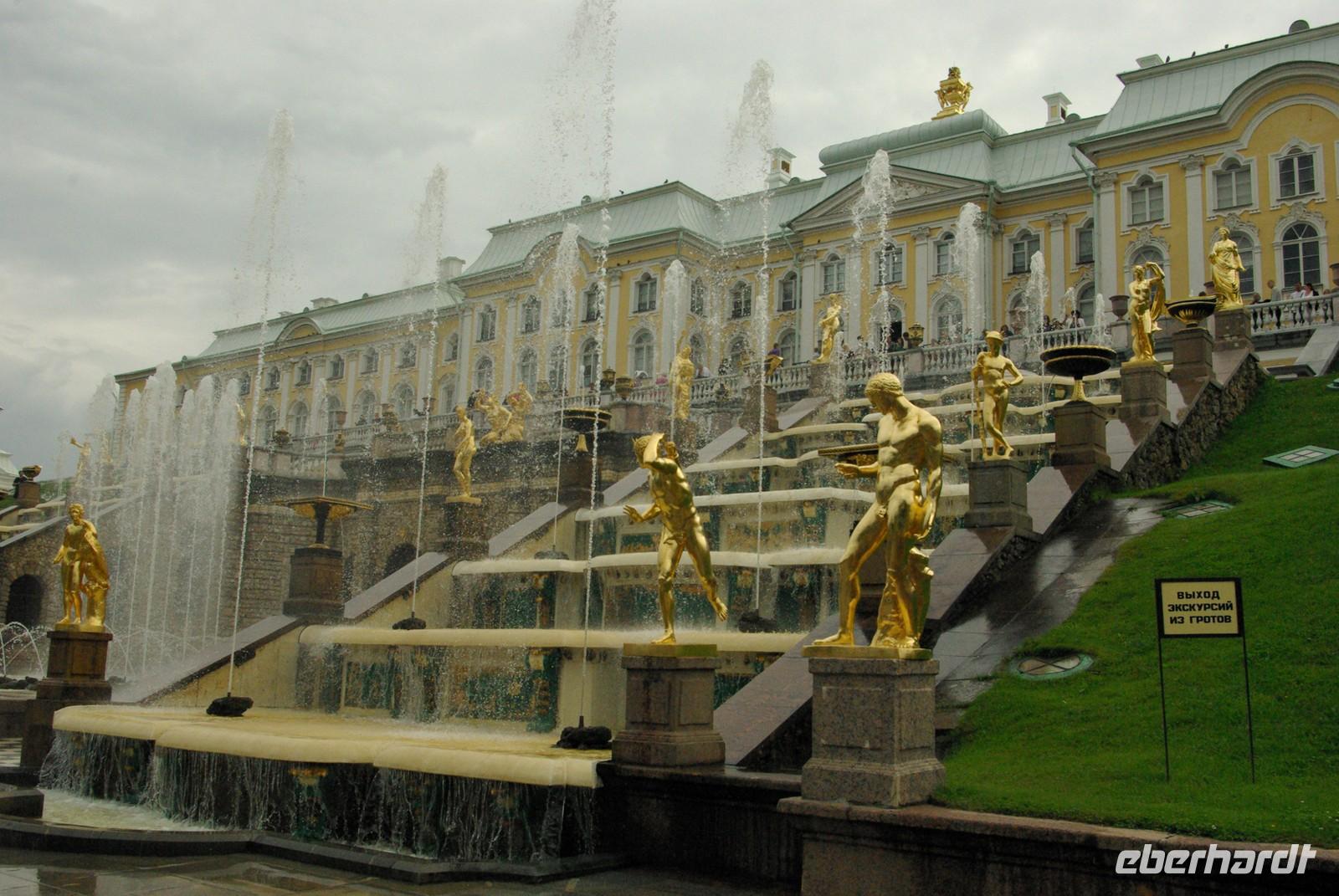 Das Besichtigungsprogramm begann an der Auferstehungskirche, im Volksmund Blutkirche, die zum Andenken an den ermordeten Zaren Alexander von dessen gleichnamigem Sohn in tradierter Moskauer Bauweise mit vielen bunten Zwiebeltürmen errichtet wurde. Danach kam mit dem Besuch der Eremitage der mit Abstand kunsthistorische Höhepunkt der Reise, denn schließlich ist sie eine der drei größten Kunstsammlungen überhaupt, wohl auch qualitativ. Nach der Mittagspause mit Bordverpflegung wartete mit Peterhof ein weiterer Höhepunkt. Die nach dem Vorbild von Versailles als Sommerschloss erbaute Anlage begeistert vor allem durch die imposanten Wasserspiele mit zahlreichen vergoldeten Figuren. Leider regnete es anfänglich, doch nach einer Weile war wieder trockenes und halbwegs helles Wetter, so dass auch die Fotografen auf ihre Kosten kamen.