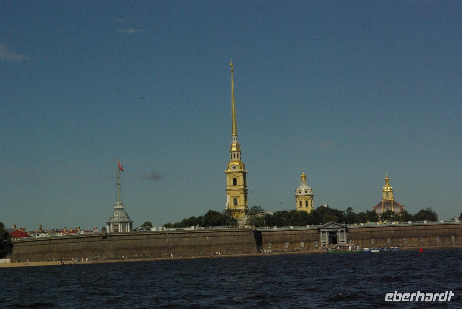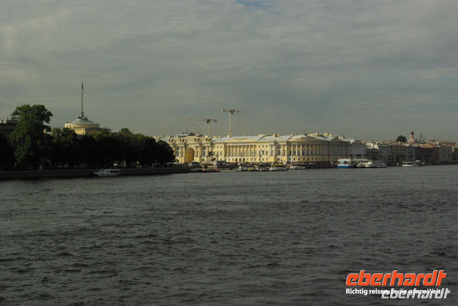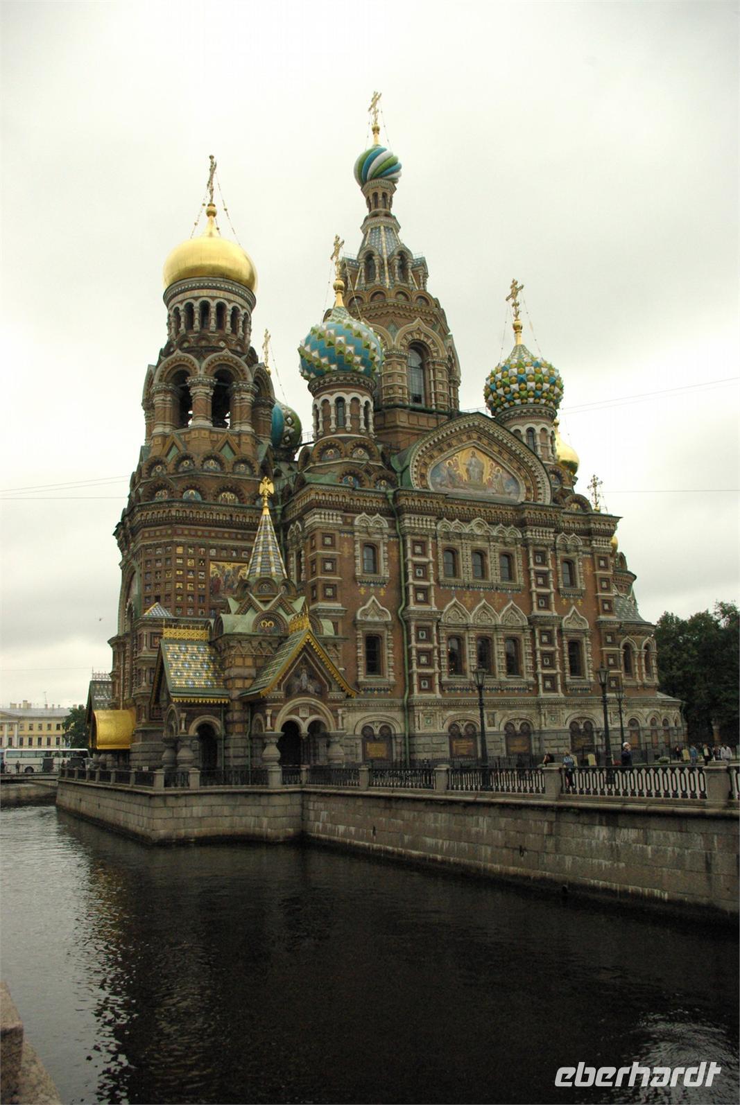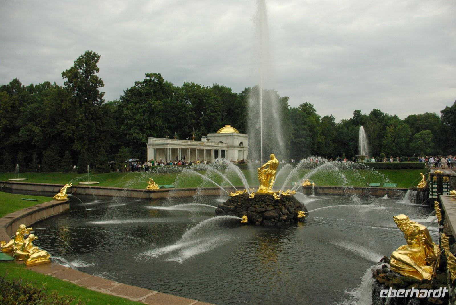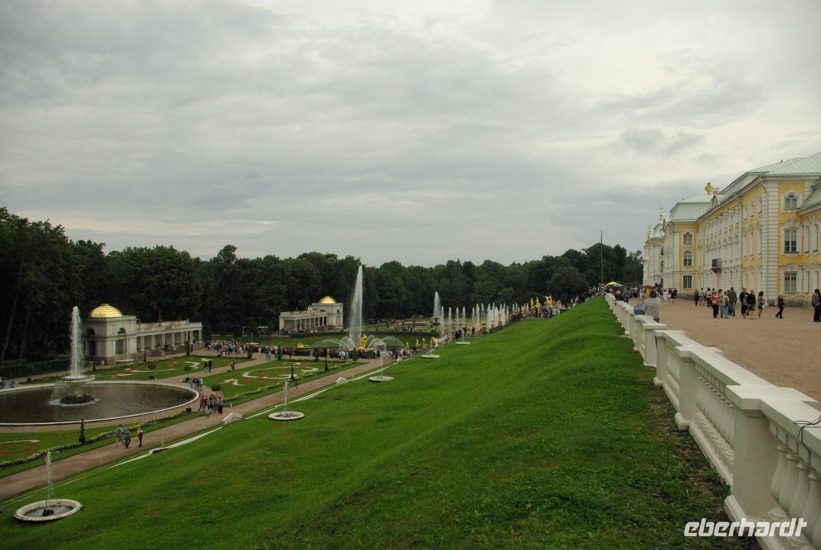 Das Besichtigungsprogramm begann an der Auferstehungskirche, im Volksmund Blutkirche, die zum Andenken an den ermordeten Zaren Alexander von dessen gleichnamigem Sohn in tradierter Moskauer Bauweise mit vielen bunten Zwiebeltürmen errichtet wurde. Danach kam mit dem Besuch der Eremitage der mit Abstand kunsthistorische Höhepunkt der Reise, denn schließlich ist sie eine der drei größten Kunstsammlungen überhaupt, wohl auch qualitativ. Nach der Mittagspause mit Bordverpflegung wartete mit Peterhof ein weiterer Höhepunkt. Die nach dem Vorbild von Versailles als Sommerschloss erbaute Anlage begeistert vor allem durch die imposanten Wasserspiele mit zahlreichen vergoldeten Figuren. Leider regnete es anfänglich, doch nach einer Weile war wieder trockenes und halbwegs helles Wetter, so dass auch die Fotografen auf ihre Kosten kamen.