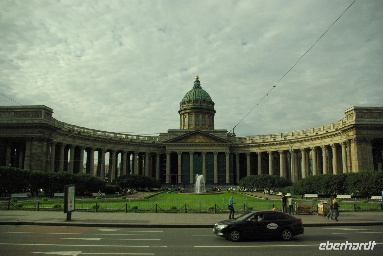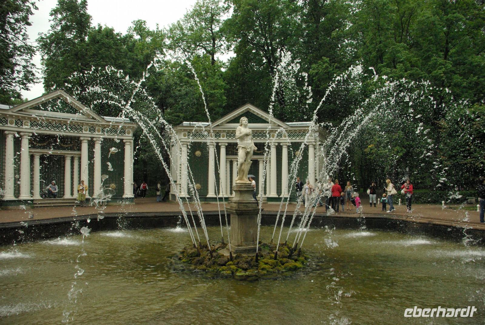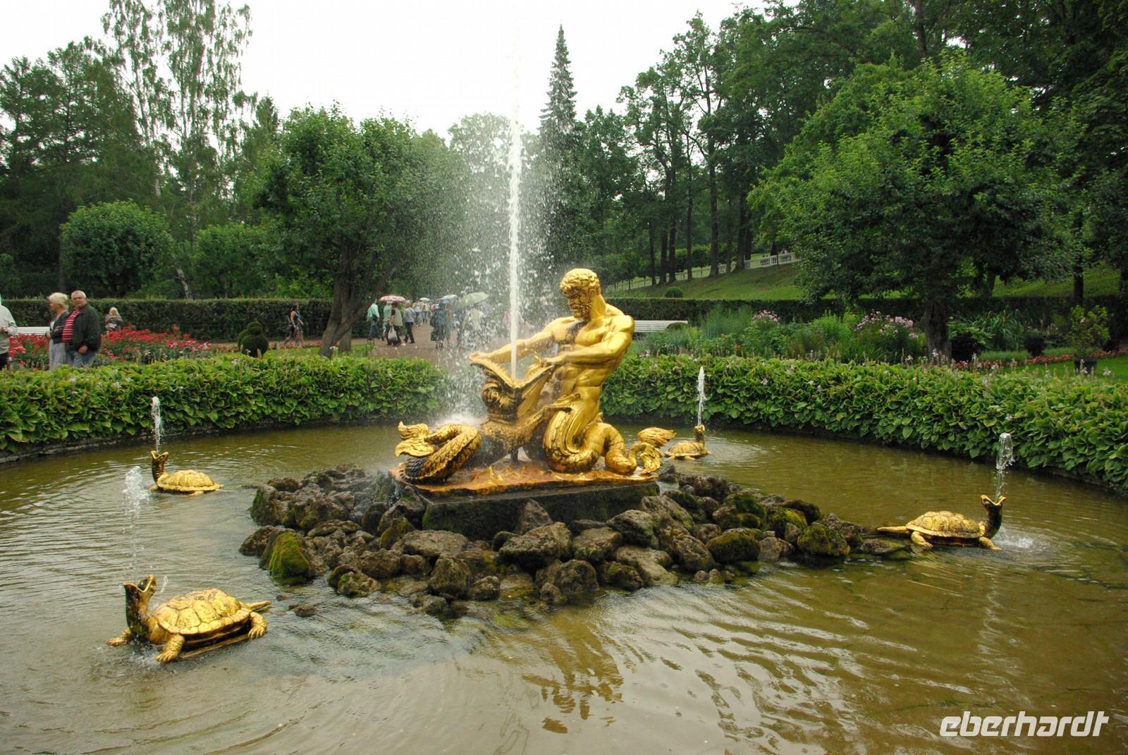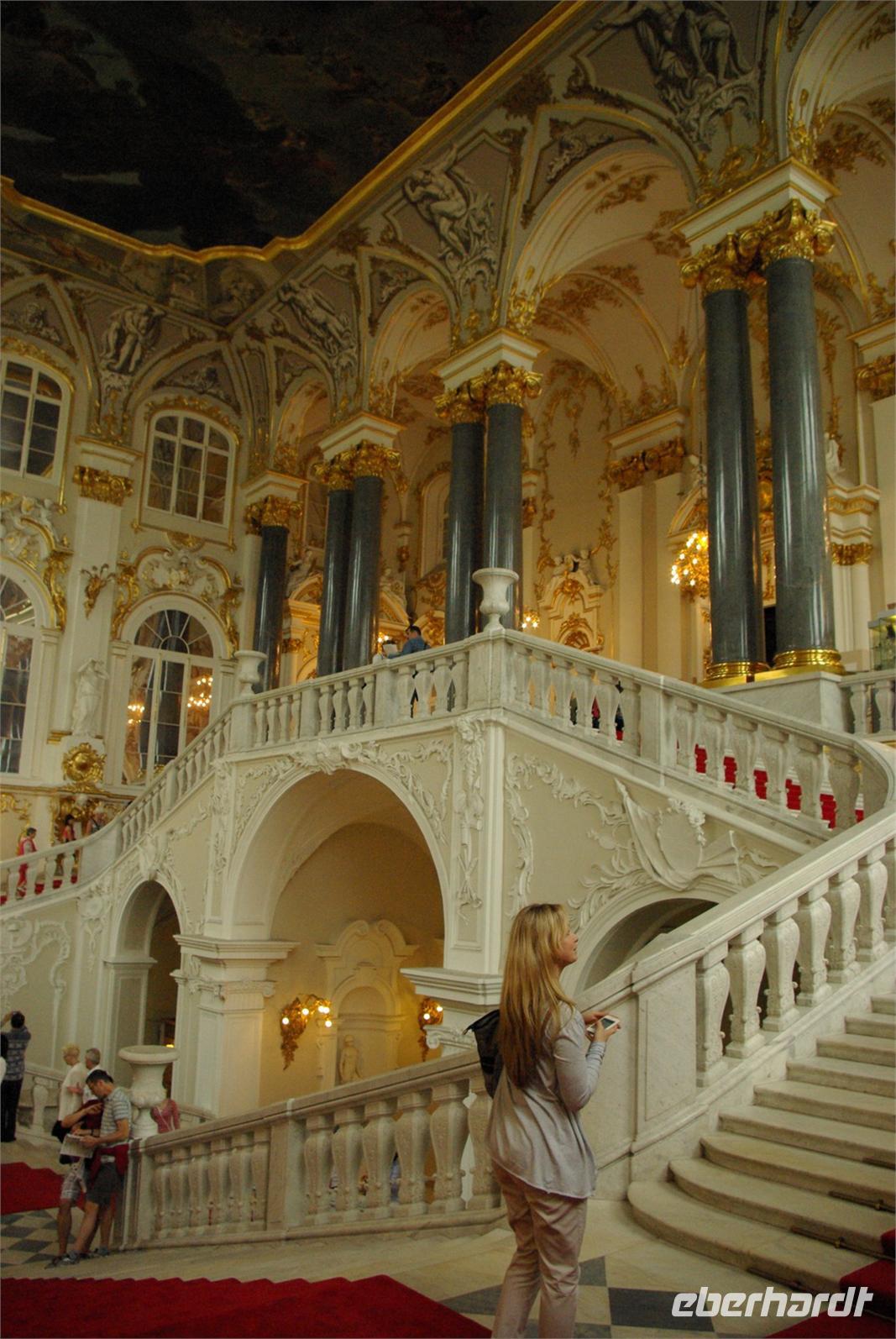 Das Besichtigungsprogramm begann an der Auferstehungskirche, im Volksmund Blutkirche, die zum Andenken an den ermordeten Zaren Alexander von dessen gleichnamigem Sohn in tradierter Moskauer Bauweise mit vielen bunten Zwiebeltürmen errichtet wurde. Danach kam mit dem Besuch der Eremitage der mit Abstand kunsthistorische Höhepunkt der Reise, denn schließlich ist sie eine der drei größten Kunstsammlungen überhaupt, wohl auch qualitativ. Nach der Mittagspause mit Bordverpflegung wartete mit Peterhof ein weiterer Höhepunkt. Die nach dem Vorbild von Versailles als Sommerschloss erbaute Anlage begeistert vor allem durch die imposanten Wasserspiele mit zahlreichen vergoldeten Figuren. Leider regnete es anfänglich, doch nach einer Weile war wieder trockenes und halbwegs helles Wetter, so dass auch die Fotografen auf ihre Kosten kamen.