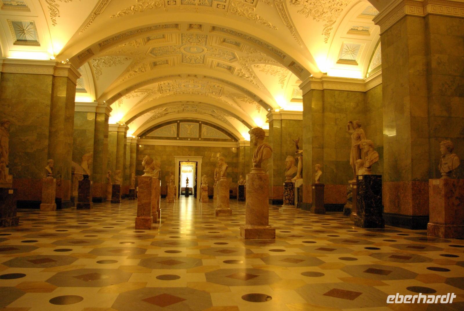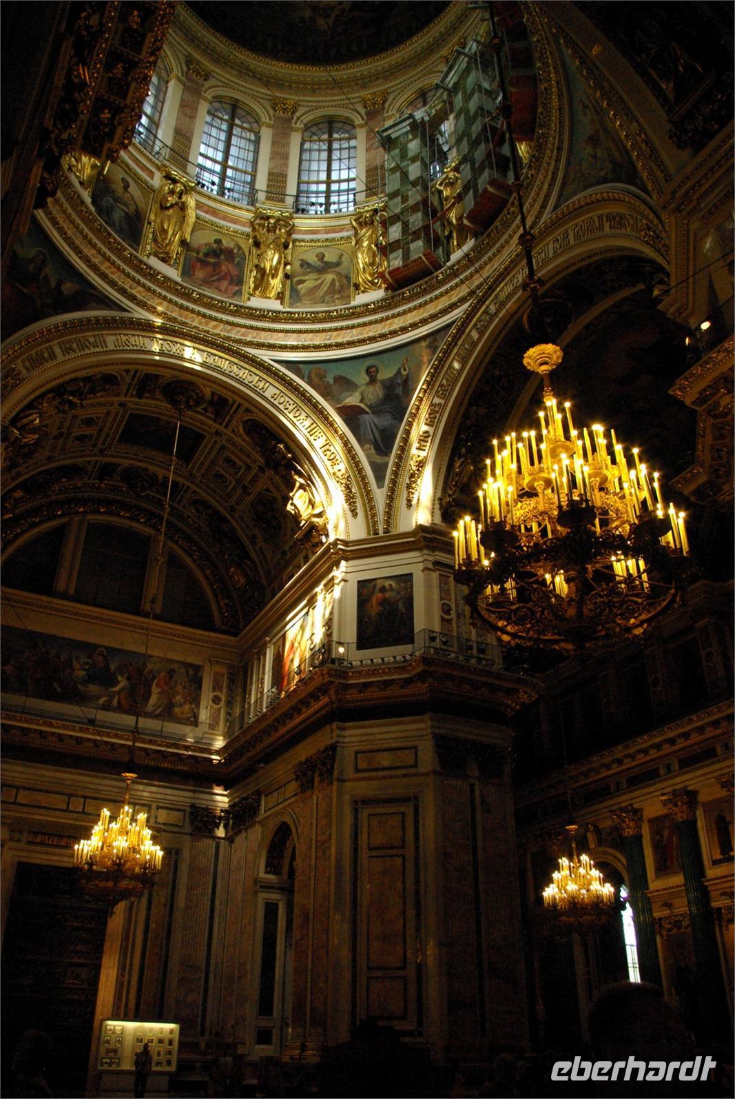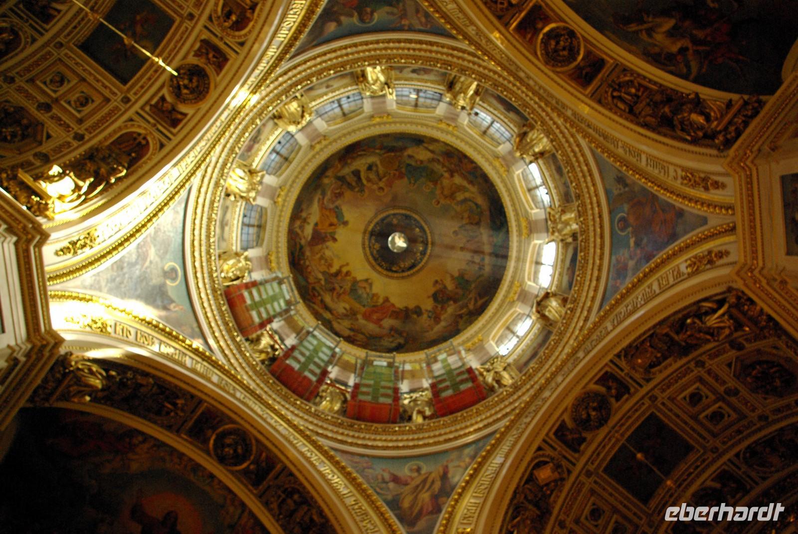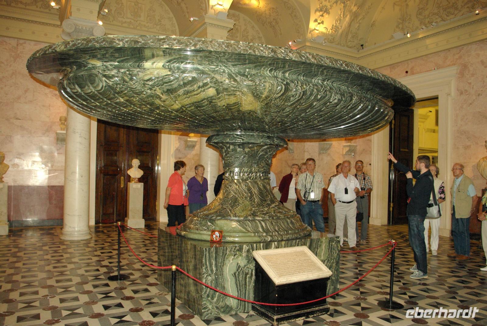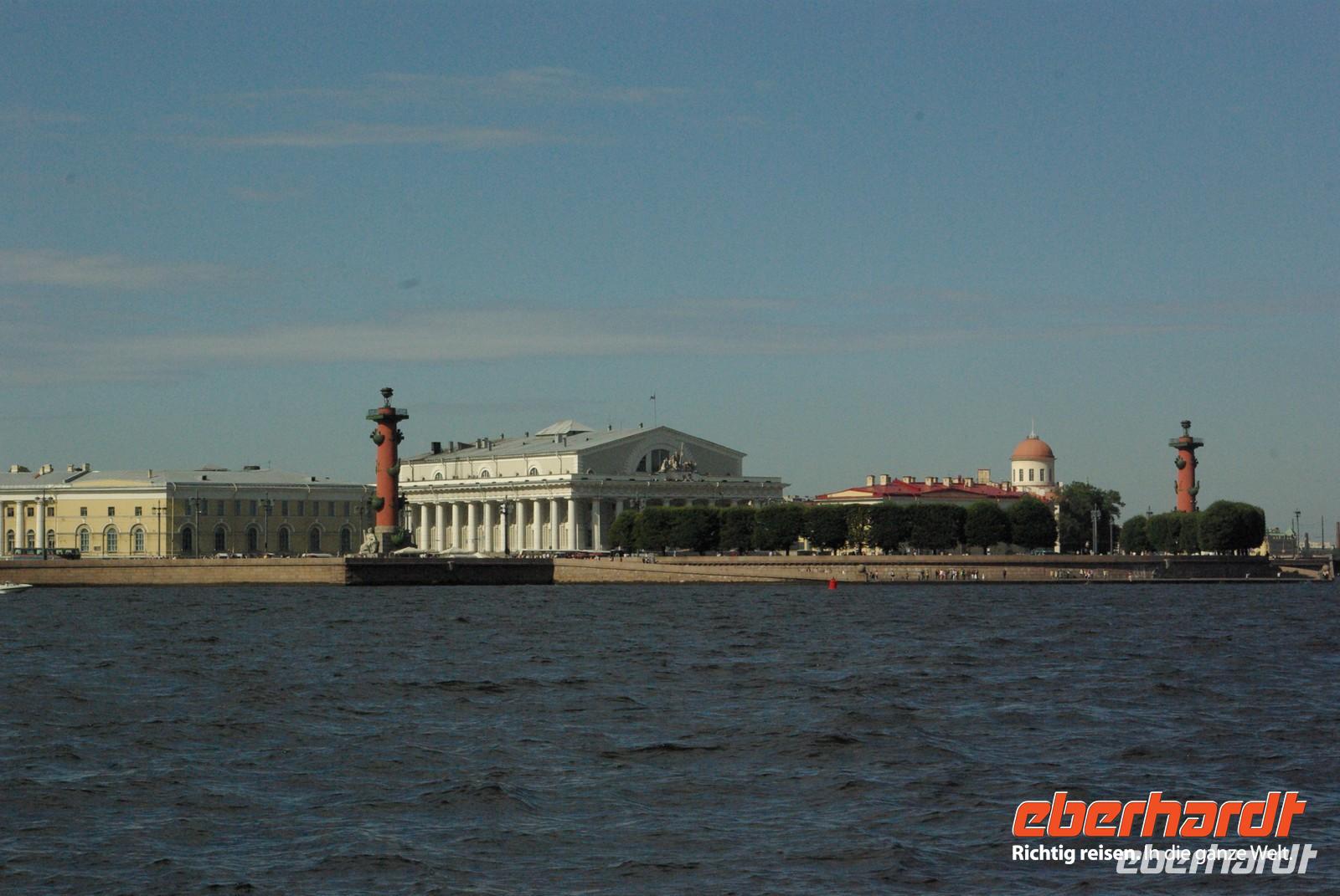 Das Besichtigungsprogramm begann an der Auferstehungskirche, im Volksmund Blutkirche, die zum Andenken an den ermordeten Zaren Alexander von dessen gleichnamigem Sohn in tradierter Moskauer Bauweise mit vielen bunten Zwiebeltürmen errichtet wurde. Danach kam mit dem Besuch der Eremitage der mit Abstand kunsthistorische Höhepunkt der Reise, denn schließlich ist sie eine der drei größten Kunstsammlungen überhaupt, wohl auch qualitativ. Nach der Mittagspause mit Bordverpflegung wartete mit Peterhof ein weiterer Höhepunkt. Die nach dem Vorbild von Versailles als Sommerschloss erbaute Anlage begeistert vor allem durch die imposanten Wasserspiele mit zahlreichen vergoldeten Figuren. Leider regnete es anfänglich, doch nach einer Weile war wieder trockenes und halbwegs helles Wetter, so dass auch die Fotografen auf ihre Kosten kamen.