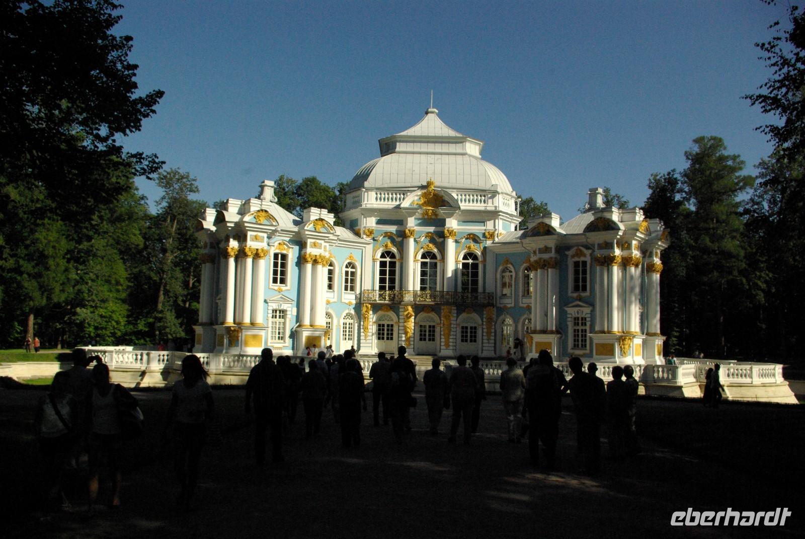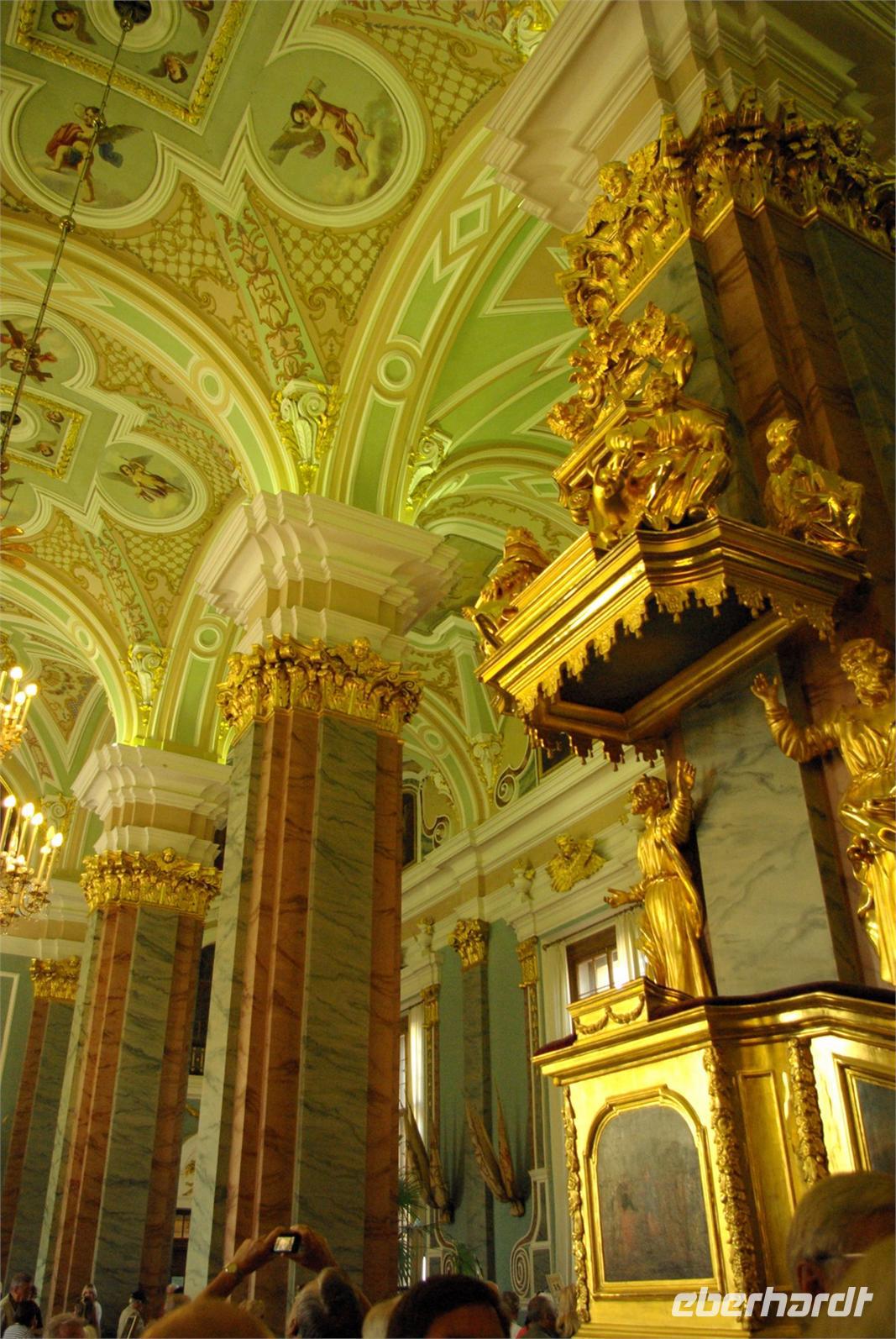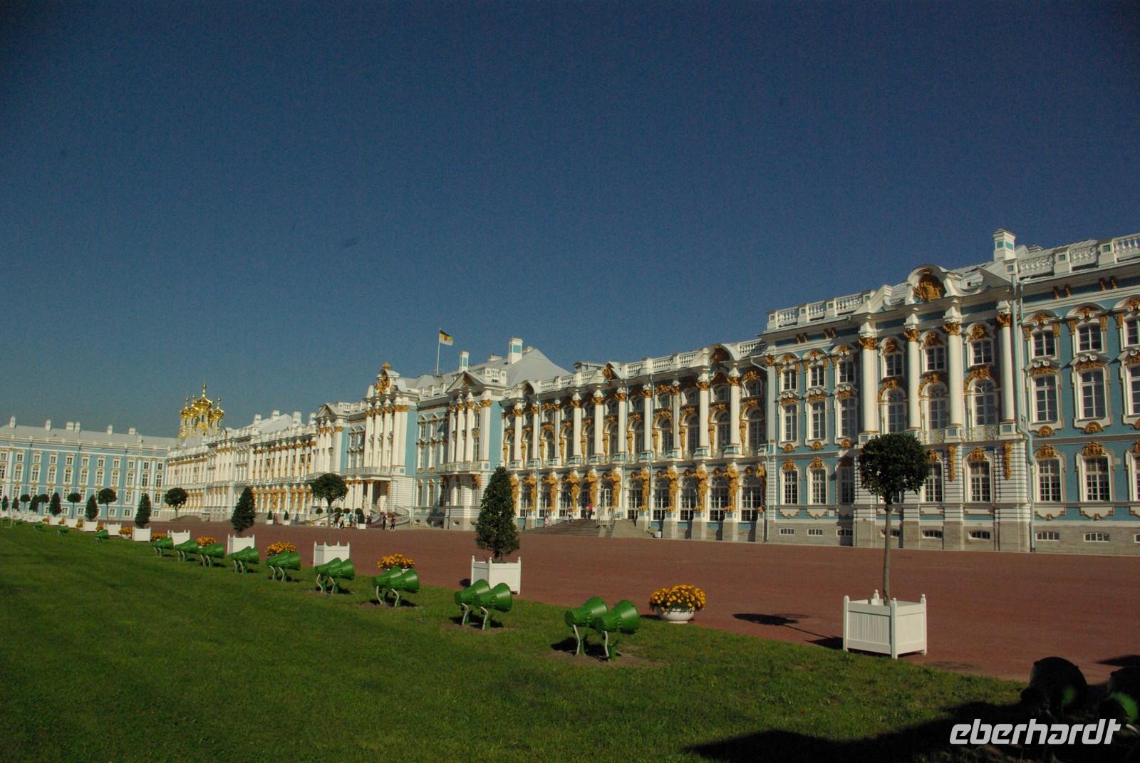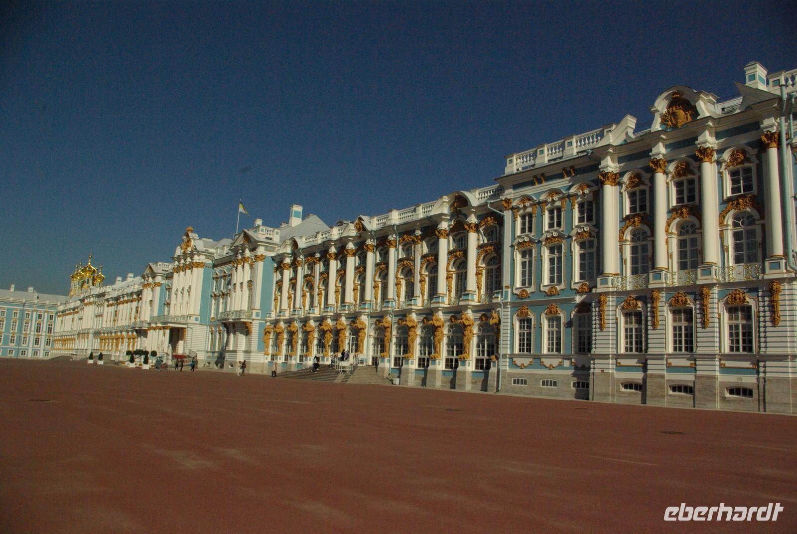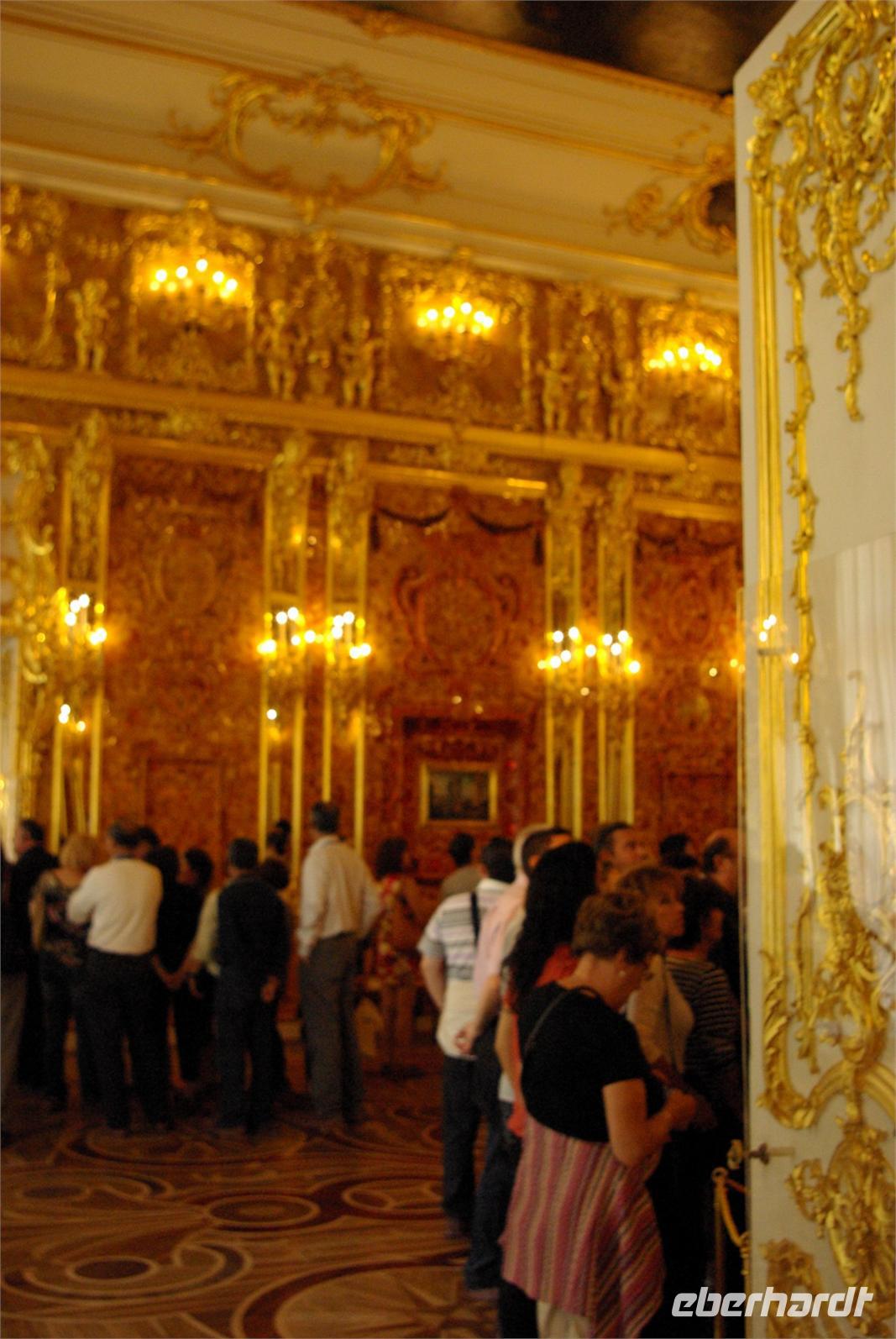 Nach dem Frühstück traf sich die Gruppe um 09.30 Uhr am Bus zur Stadtbesichtigung, die mit einem Ausstieg am barocken Smolnykloster, einer Lehranstalt für adlige Hofdamen und erste Machtzentrale Lenins, begann. Anschließend fuhren wir auf die Insel mit der Peter- und Paul- Festung und besichtigten die gleichnamige Kathedrale mit den Gräbern der wichtigsten einst in Petersburg residierenden Zaren aus der Romanow- Dynastie, einschließlich der Familie Nikolaus II, die von den Bolschewiki ermordet und deren Leichen erst in den Neunzigern umgebettet wurden. Den langen Newskiprospekt entlang, vorbei an der Kasaner Kathedrale, pausierten wir auf der Rostrabrücke unweit der Börse, um dann die russisch- orthodoxe Hauptkirche, die Isaakkathedrale zu besichtigen, die sich wie die Kasaner Kathedrale architektonisch an den Petersdom in Rom anlehnt. Die anschließende Mittagspause nutzten alle zu einer einstündigen Bootsrundfahrt auf der Newa und zwei Nebenflüssen, die beste Blicke auf den Marmorpalast des Fürsten Orlow und den Panzerkreuzer Aurora, sowie diverse Paläste und Kirchen bot. Am Nachmittag fuhren wir nach Zarskoe Selo, heute Puschkin, um den Katharinenpalast mit dem legendenumwobenen Bernsteinzimmer anzusehen. Hier war einiger Andrang, der letztendlich eine knappe Stunde Anstehzeit an mehreren Stationen erzeugte, doch gestählt durch die Tücken russischer Grenzwillkür fiel diese Zeit kaum ins Gewicht und das grandiose Ensemble belohnte die Geduld überreichlich. Bei der Führung durch schier endlose Gänge verloren sich die Massen auch wieder, nur im Bernsteinzimmer ballte sich das Publikum, allerdings war zügiger Durchlauf organisiert. Danach fuhren wir zum nahe gelegenen Restaurant „Podvorie", einem zwar nagelneu, doch in traditioneller Holzblockbauweise errichteten Komplex, der ein wenig an Baba Jagas Hexenhaus erinnerte. Hier erwartete uns an langer Tafel ein zünftig rustikal- russisches Mahl mit Borschtsch und diversen weiteren Gängen, denen guter Wodka Platz im Magen schaffte, der auch die allgemeine Kommunikation beförderte, die danach im Hotel ihre Fortsetzung fand.