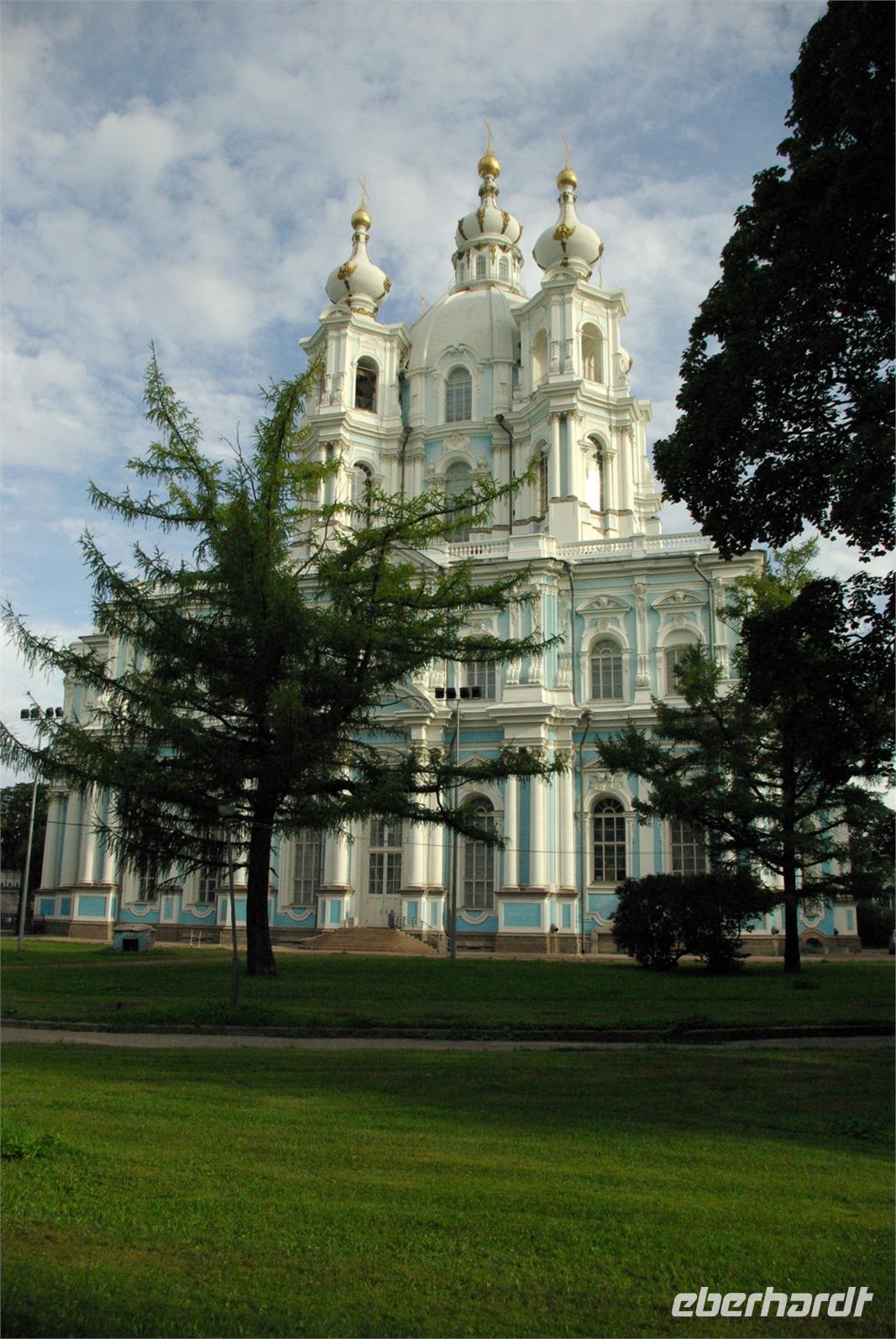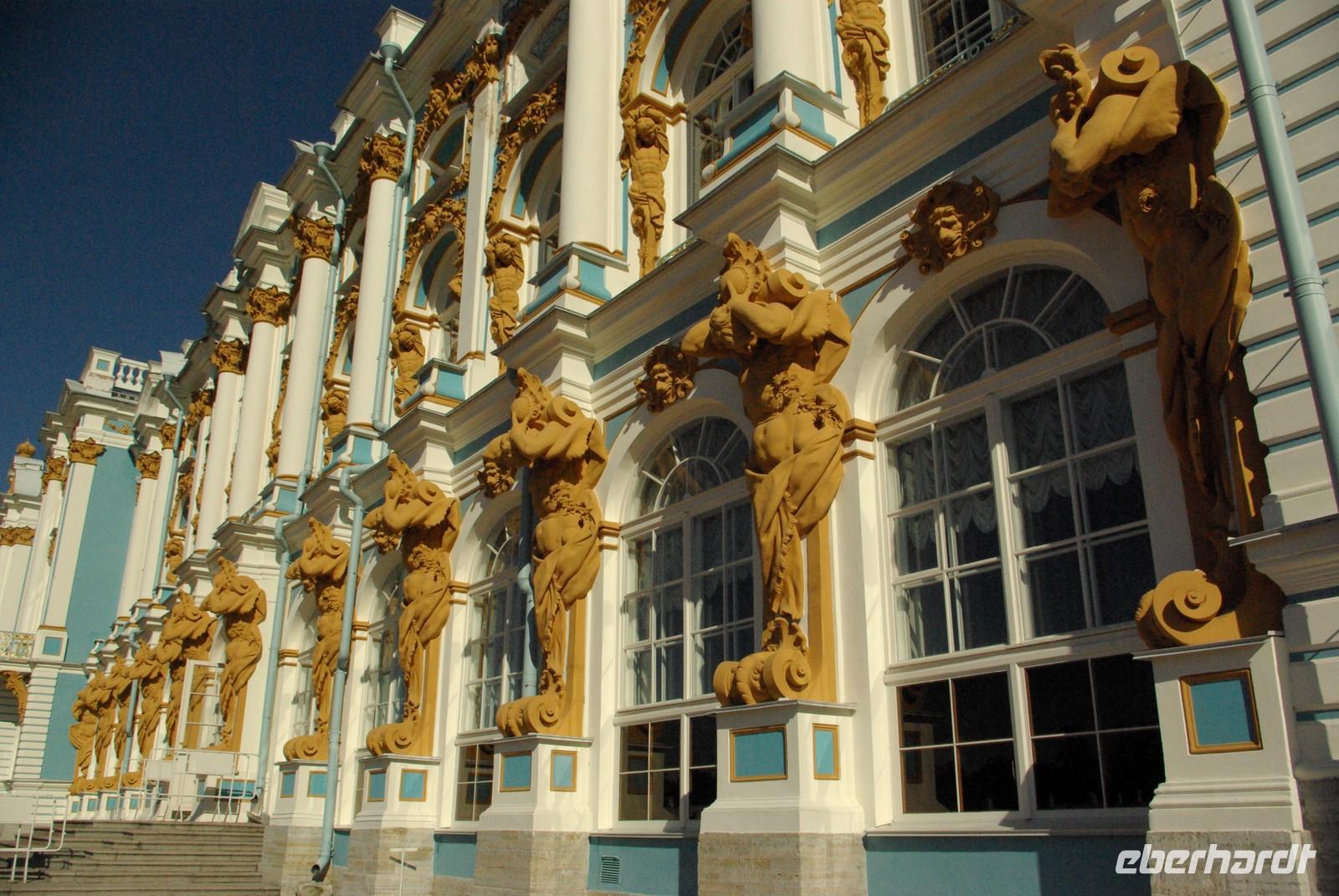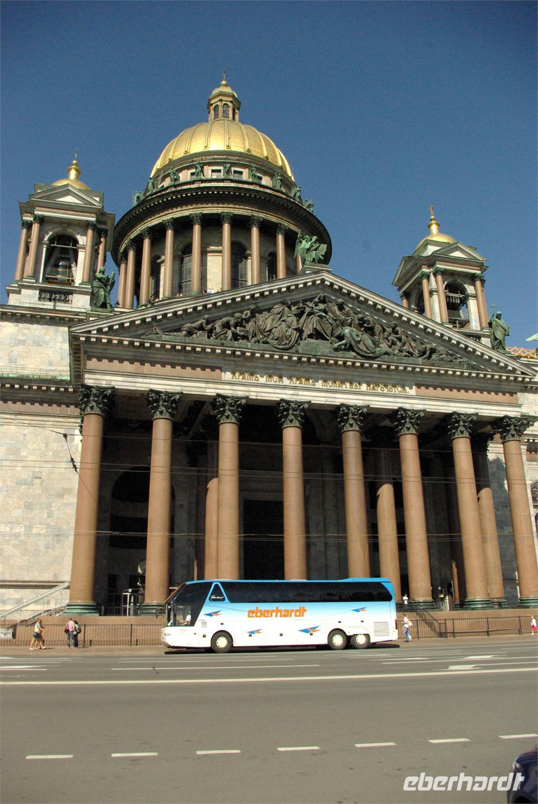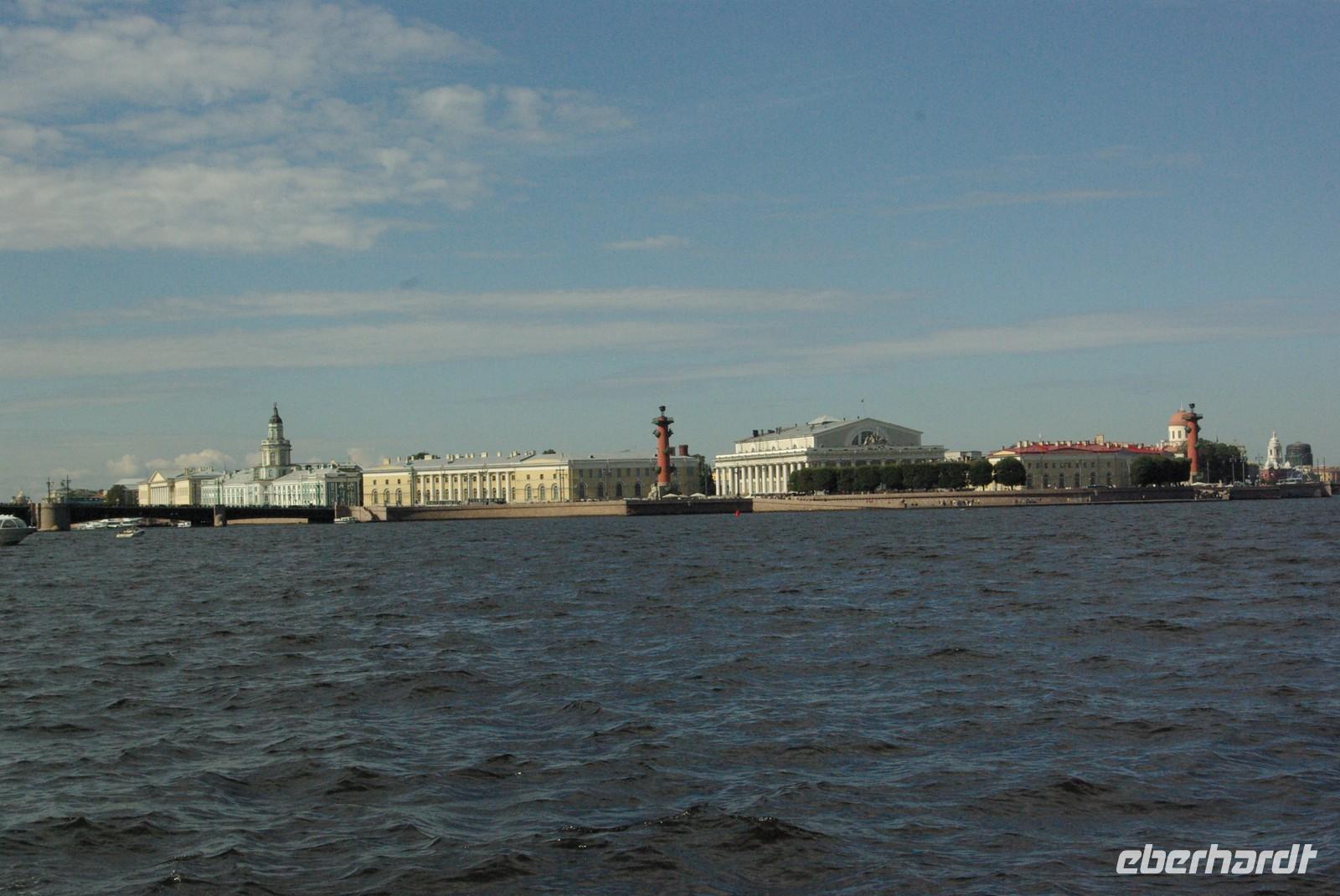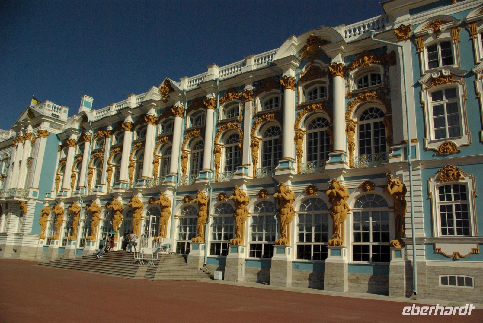 Nach dem Frühstück traf sich die Gruppe um 09.30 Uhr am Bus zur Stadtbesichtigung, die mit einem Ausstieg am barocken Smolnykloster, einer Lehranstalt für adlige Hofdamen und erste Machtzentrale Lenins, begann. Anschließend fuhren wir auf die Insel mit der Peter- und Paul- Festung und besichtigten die gleichnamige Kathedrale mit den Gräbern der wichtigsten einst in Petersburg residierenden Zaren aus der Romanow- Dynastie, einschließlich der Familie Nikolaus II, die von den Bolschewiki ermordet und deren Leichen erst in den Neunzigern umgebettet wurden. Den langen Newskiprospekt entlang, vorbei an der Kasaner Kathedrale, pausierten wir auf der Rostrabrücke unweit der Börse, um dann die russisch- orthodoxe Hauptkirche, die Isaakkathedrale zu besichtigen, die sich wie die Kasaner Kathedrale architektonisch an den Petersdom in Rom anlehnt. Die anschließende Mittagspause nutzten alle zu einer einstündigen Bootsrundfahrt auf der Newa und zwei Nebenflüssen, die beste Blicke auf den Marmorpalast des Fürsten Orlow und den Panzerkreuzer Aurora, sowie diverse Paläste und Kirchen bot. Am Nachmittag fuhren wir nach Zarskoe Selo, heute Puschkin, um den Katharinenpalast mit dem legendenumwobenen Bernsteinzimmer anzusehen. Hier war einiger Andrang, der letztendlich eine knappe Stunde Anstehzeit an mehreren Stationen erzeugte, doch gestählt durch die Tücken russischer Grenzwillkür fiel diese Zeit kaum ins Gewicht und das grandiose Ensemble belohnte die Geduld überreichlich. Bei der Führung durch schier endlose Gänge verloren sich die Massen auch wieder, nur im Bernsteinzimmer ballte sich das Publikum, allerdings war zügiger Durchlauf organisiert. Danach fuhren wir zum nahe gelegenen Restaurant „Podvorie", einem zwar nagelneu, doch in traditioneller Holzblockbauweise errichteten Komplex, der ein wenig an Baba Jagas Hexenhaus erinnerte. Hier erwartete uns an langer Tafel ein zünftig rustikal- russisches Mahl mit Borschtsch und diversen weiteren Gängen, denen guter Wodka Platz im Magen schaffte, der auch die allgemeine Kommunikation beförderte, die danach im Hotel ihre Fortsetzung fand.