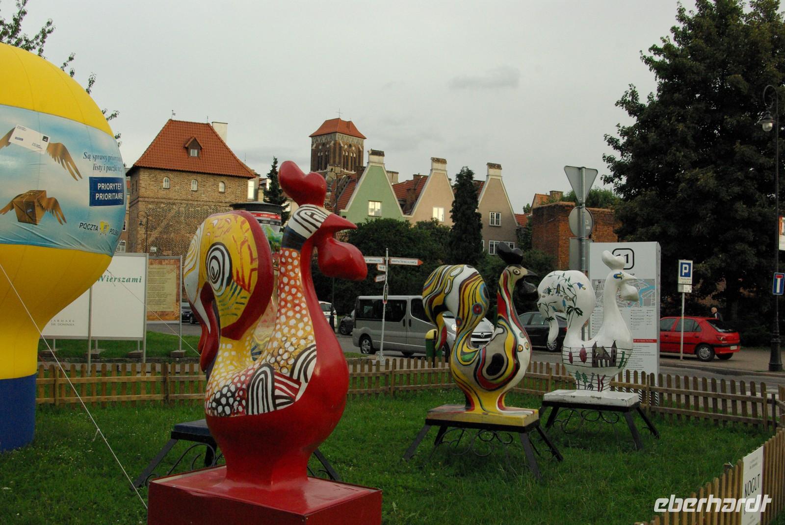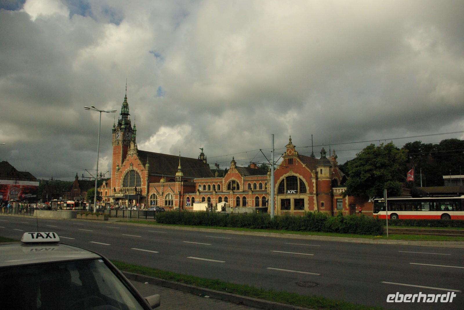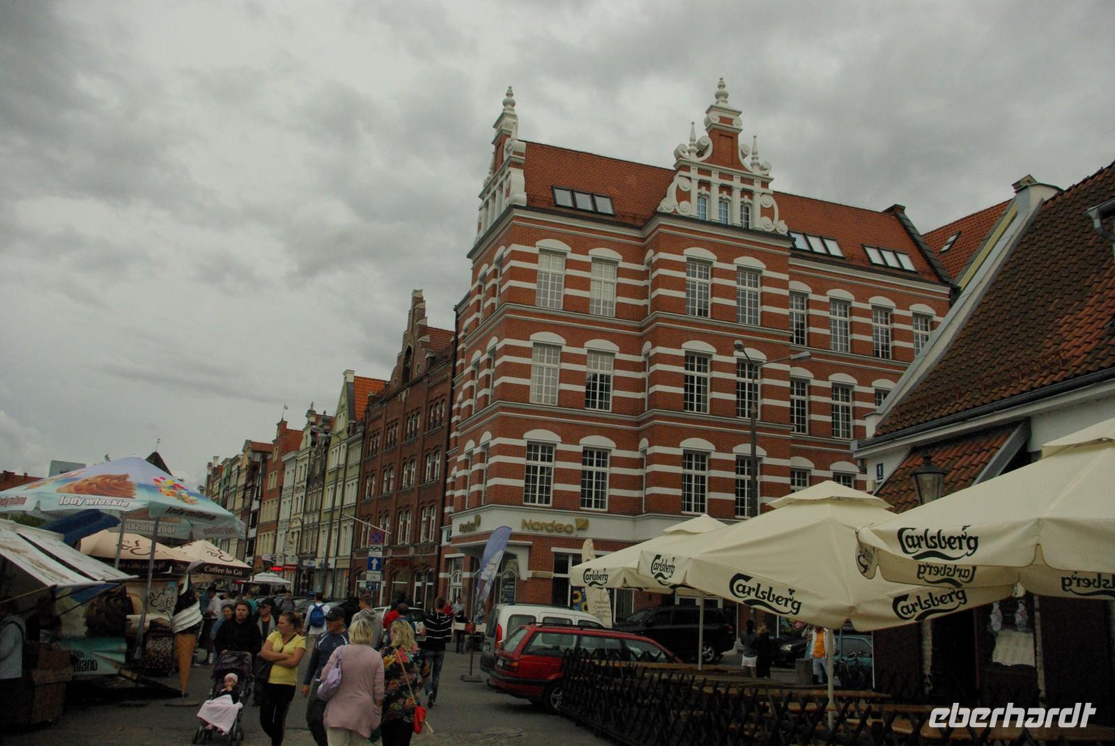 Um diese und die regnerisch- trüben Ausblicke zu überbrücken, erzählte ich allerhand Unterhaltsames aus Danzigs reicher Historie und zeigte anschließend den Klassiker „Die Blechtrommel" nach dem Roman des Nobelpreisträgers Günter Grass, die ja komplett dort spielt. Die Einfahrt in Danzig zum hervorragend zentral gelegenen Hotel lief wie geschmiert. Dort ging alles äußerst professionell vor sich. Binnen 5 Minuten um kurz nach fünf hatten alle ihren Zimmerschlüssel. Da die Gäste gesehen hatten, dass wir praktisch fast in der Altstadt logieren würden, waren alle erpicht auf dieselbe. Also bot ich noch vor dem Abendessen einen Stadtspaziergang an. Vorbei an Josefs- und Elisabethkirche und am altstädtischen Rathaus ging es zur alten Mühle und weiter zu St. Katharinen. Vom Dominikanerplatz schlenderten wir dann zum Langen Markt, sahen die schönsten Stadttore, den Artushof, das große Rathaus mit der riesigen Marienkirche im Hintergrund und durch das Goldene Tor erkundeten alle den mit Kneipen gepflasterten Weg die Mottlau entlang zum alten Hafenkran.