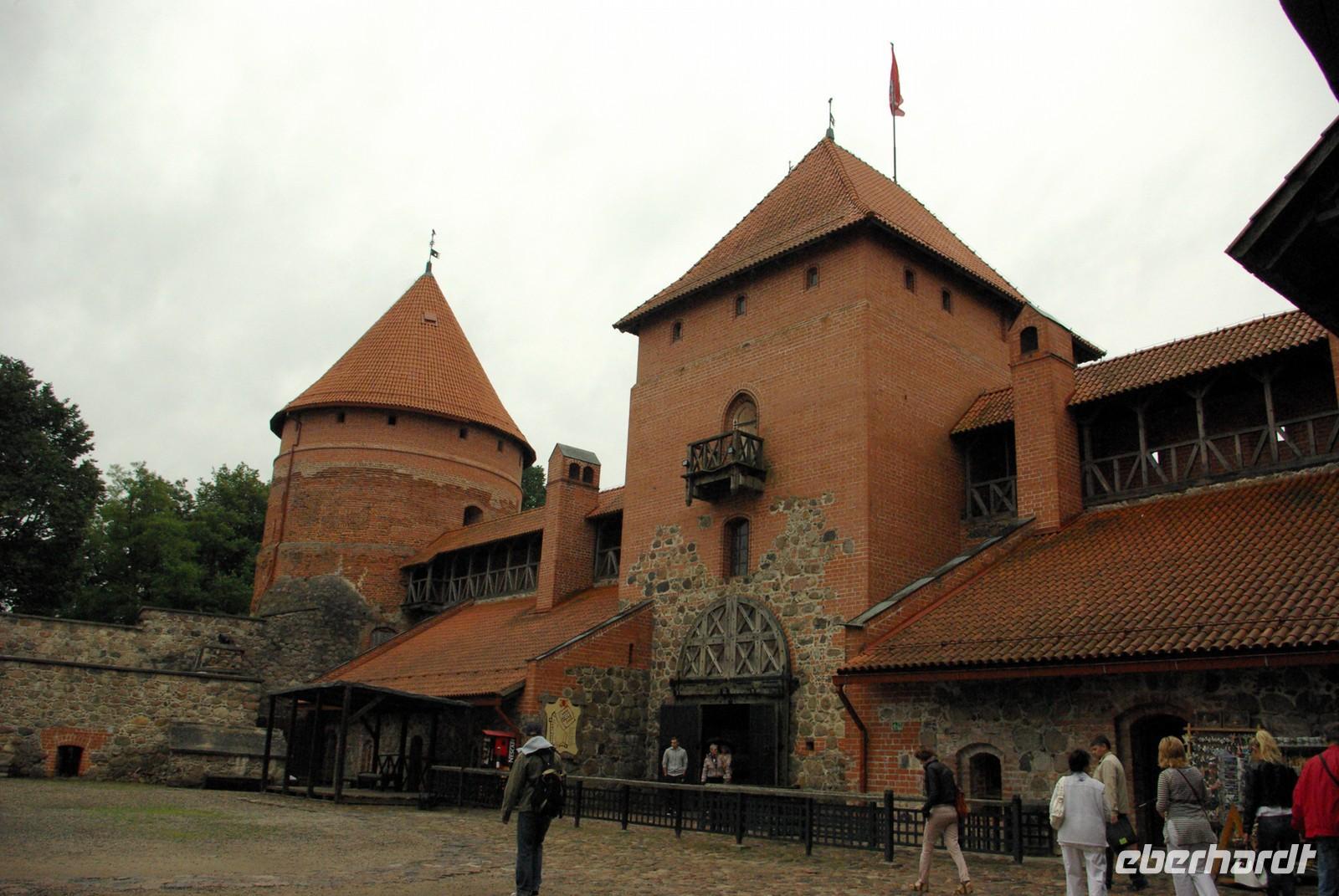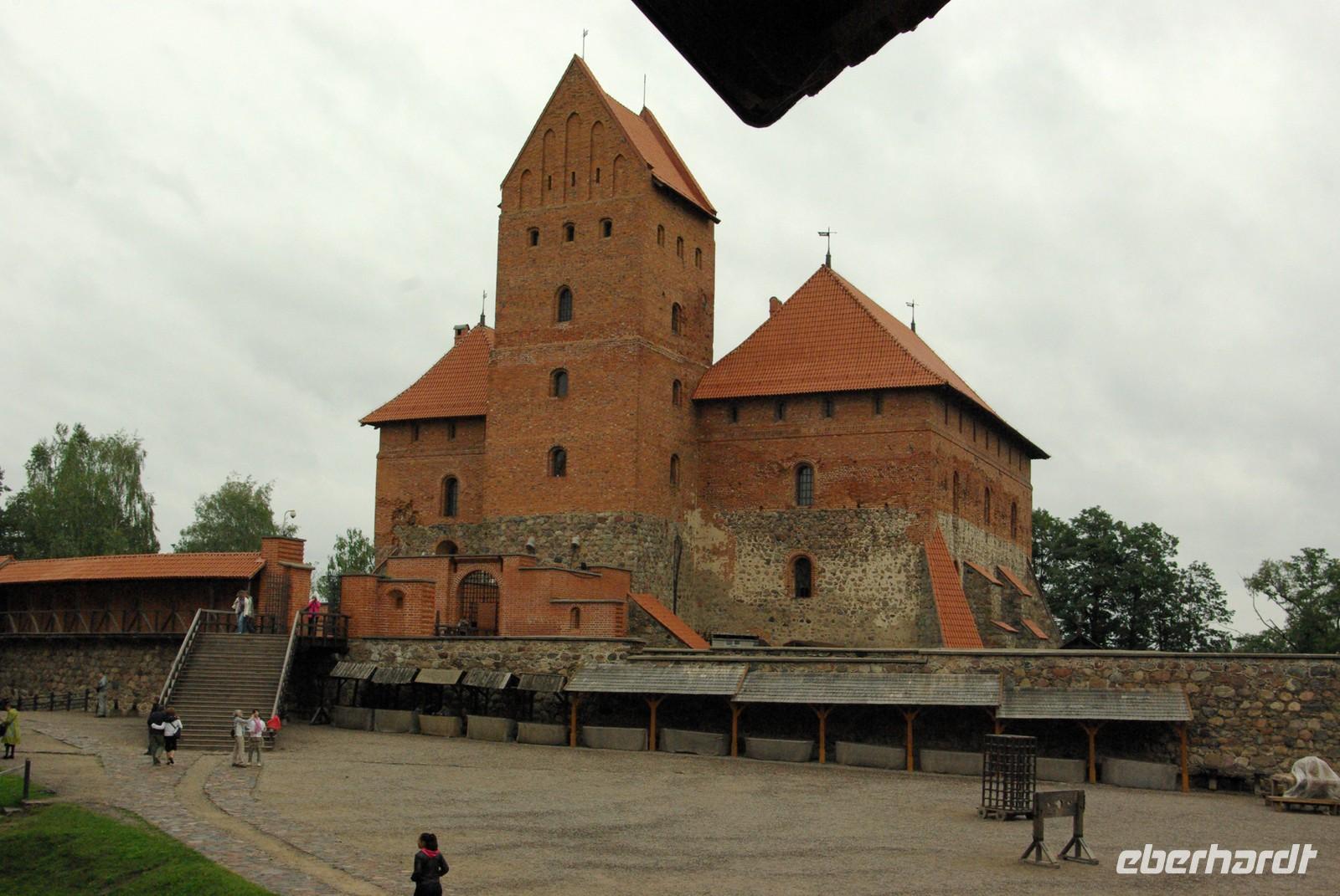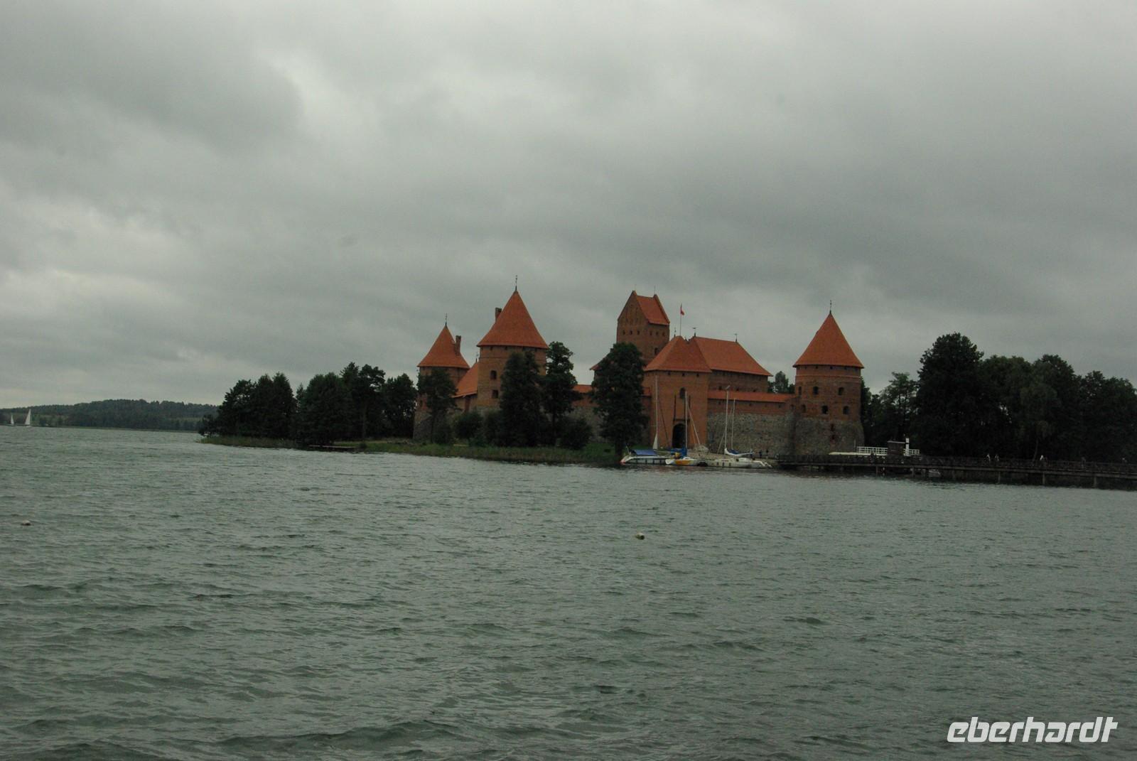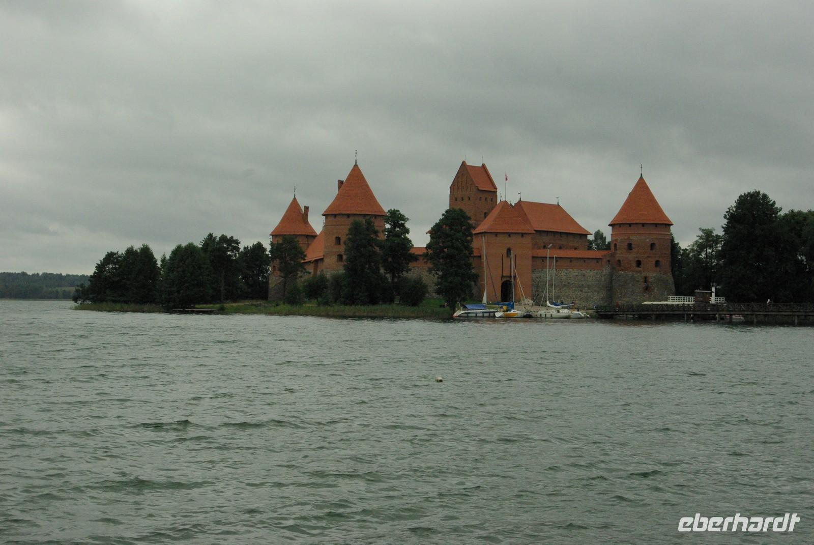 Nach der Mittagspause fuhren wir knapp 30 Kilometer zur Wasserburg Trakai, dem Wahrzeichen des unabhängigen Litauen und einem Höhepunkt der Reise. Die nur über einen Steg erreichbare Burg wurde der Legende nach schon von Fürst Gediminas als Holzfestung errichtet, die mehrfach abbrannte. Ende des 14. Jahrhunderts errichtete Vytautas der Große die steinerne Burg mit diversen Anleihen beim Deutschen Orden in Stil und Fortifikation, so dass man sich in einer kleinen Ausgabe der Marienburg wähnt. Der durch leidvolle Erfahrungen misstrauische Vytautas rekrutierte sich von der Krim, denn so weit ging sein Herrschaftsbereich, etwa 400 Familien der Karäer, ein Turkvolk, das im 7. Jahrhundert eine jüdische Sekte gebildet hatte, die sich zwar an der Thora, nicht aber an den Folgeschriften orientierte. Ganz nach dem Vorbild Kaiser Friedrich II. von Hohenstauffen, dessen Leibgarde aus sizilianischen Bergmuselmanen bestand, stellten diese Karäer die Leibwache für Vytautas. Auf dem festländischen Ortsteil sieht man noch ihre giebelständigen Holzhäuser mit den drei Fenstern: eins für Vater im Himmel, eins für den auf Erden und eines für Vytautas. Auch die Kerene, wie ihre Synagoge genannt wird, steht noch und in mehreren Gaststätten kann man ihr Nationalgericht, die typisch gefüllten Teigtaschen kosten.