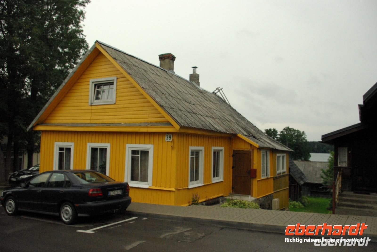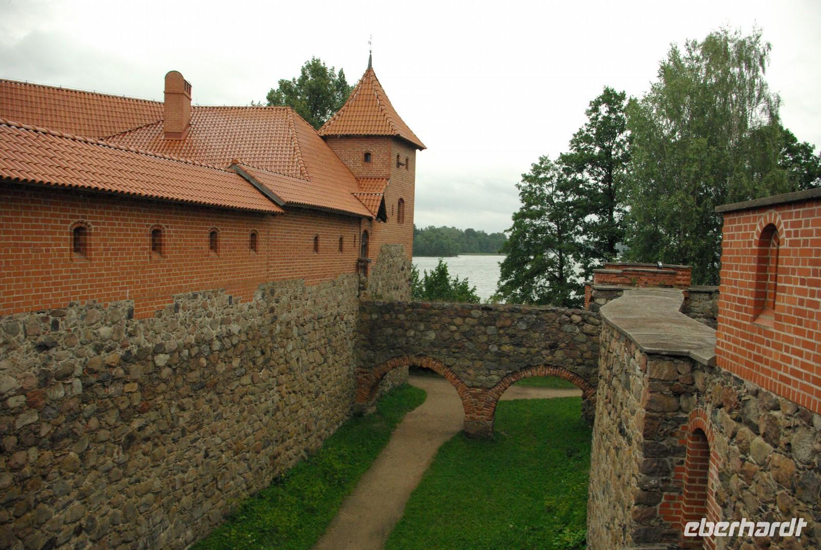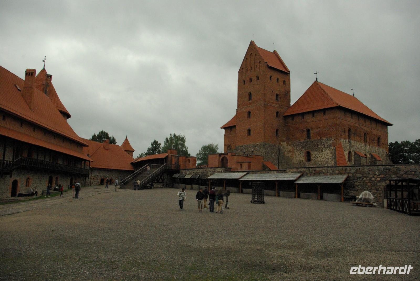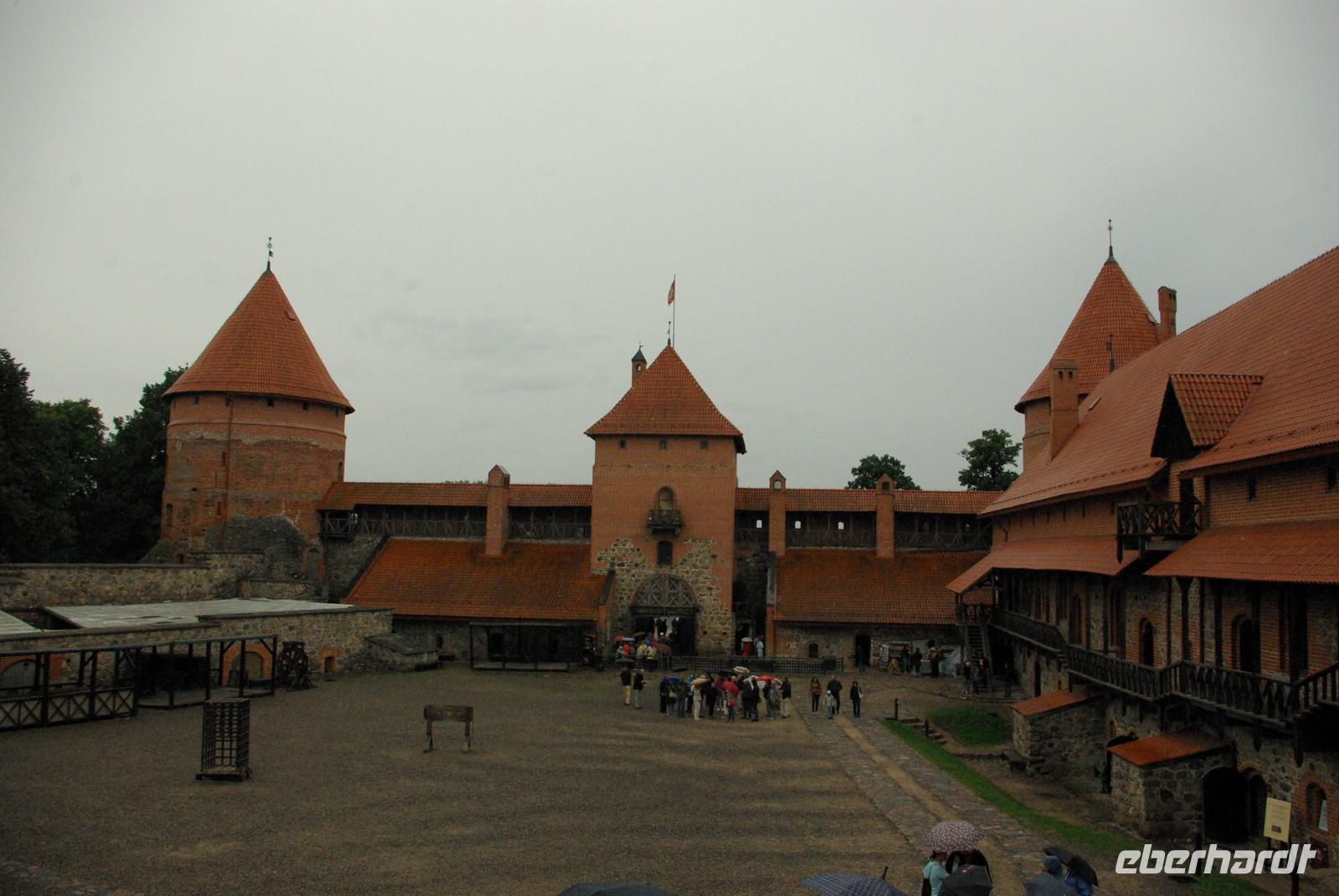 Nach der Mittagspause fuhren wir knapp 30 Kilometer zur Wasserburg Trakai, dem Wahrzeichen des unabhängigen Litauen und einem Höhepunkt der Reise. Die nur über einen Steg erreichbare Burg wurde der Legende nach schon von Fürst Gediminas als Holzfestung errichtet, die mehrfach abbrannte. Ende des 14. Jahrhunderts errichtete Vytautas der Große die steinerne Burg mit diversen Anleihen beim Deutschen Orden in Stil und Fortifikation, so dass man sich in einer kleinen Ausgabe der Marienburg wähnt. Der durch leidvolle Erfahrungen misstrauische Vytautas rekrutierte sich von der Krim, denn so weit ging sein Herrschaftsbereich, etwa 400 Familien der Karäer, ein Turkvolk, das im 7. Jahrhundert eine jüdische Sekte gebildet hatte, die sich zwar an der Thora, nicht aber an den Folgeschriften orientierte. Ganz nach dem Vorbild Kaiser Friedrich II. von Hohenstauffen, dessen Leibgarde aus sizilianischen Bergmuselmanen bestand, stellten diese Karäer die Leibwache für Vytautas. Auf dem festländischen Ortsteil sieht man noch ihre giebelständigen Holzhäuser mit den drei Fenstern: eins für Vater im Himmel, eins für den auf Erden und eines für Vytautas. Auch die Kerene, wie ihre Synagoge genannt wird, steht noch und in mehreren Gaststätten kann man ihr Nationalgericht, die typisch gefüllten Teigtaschen kosten.