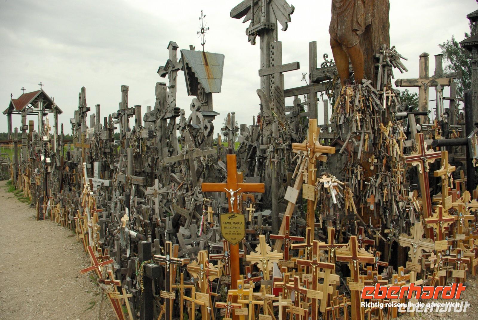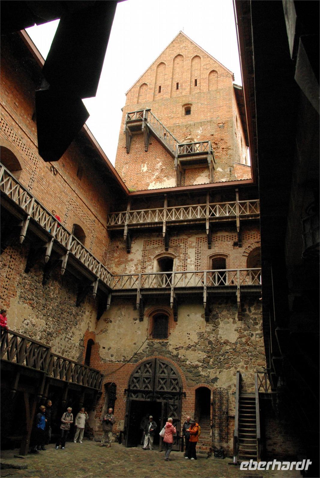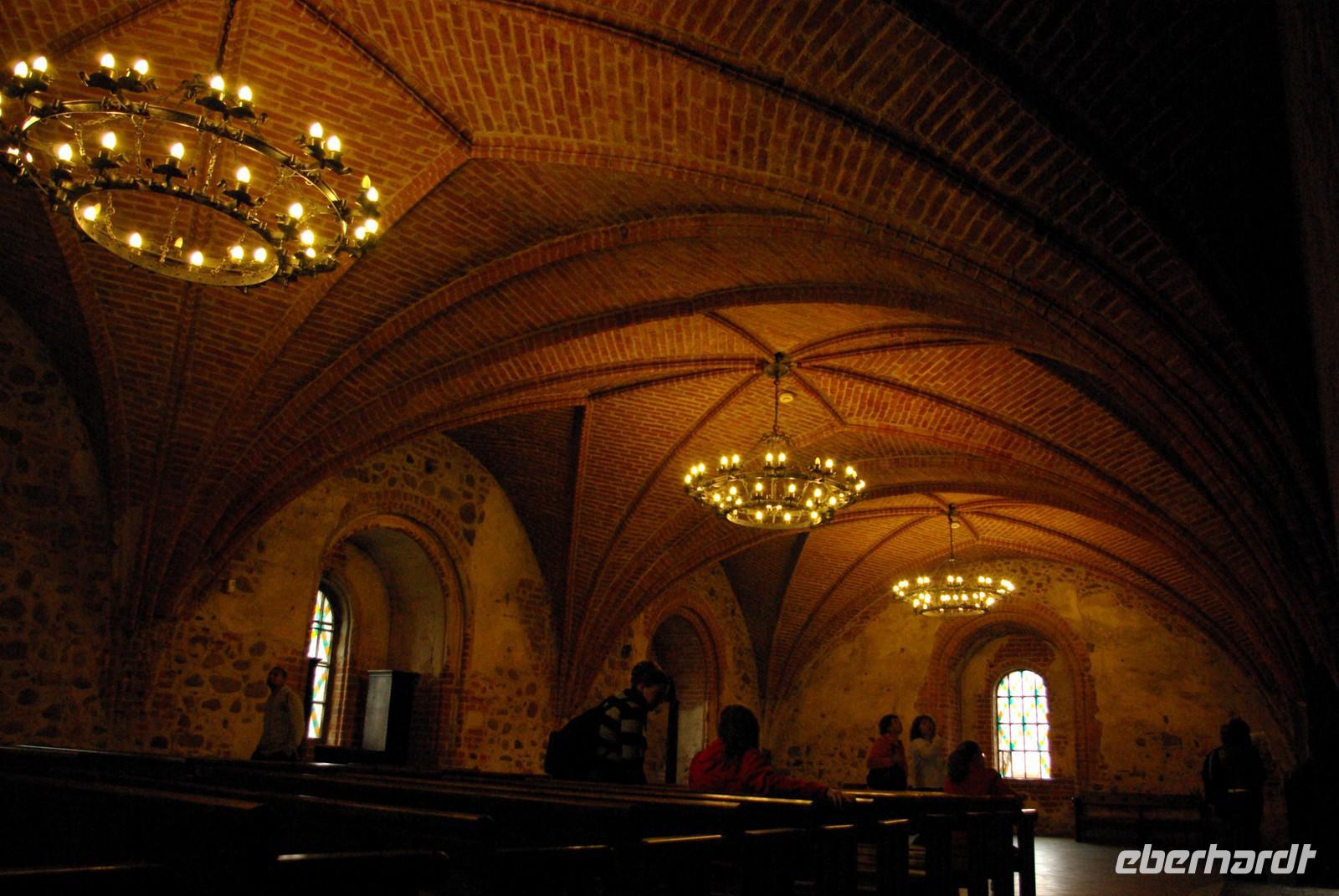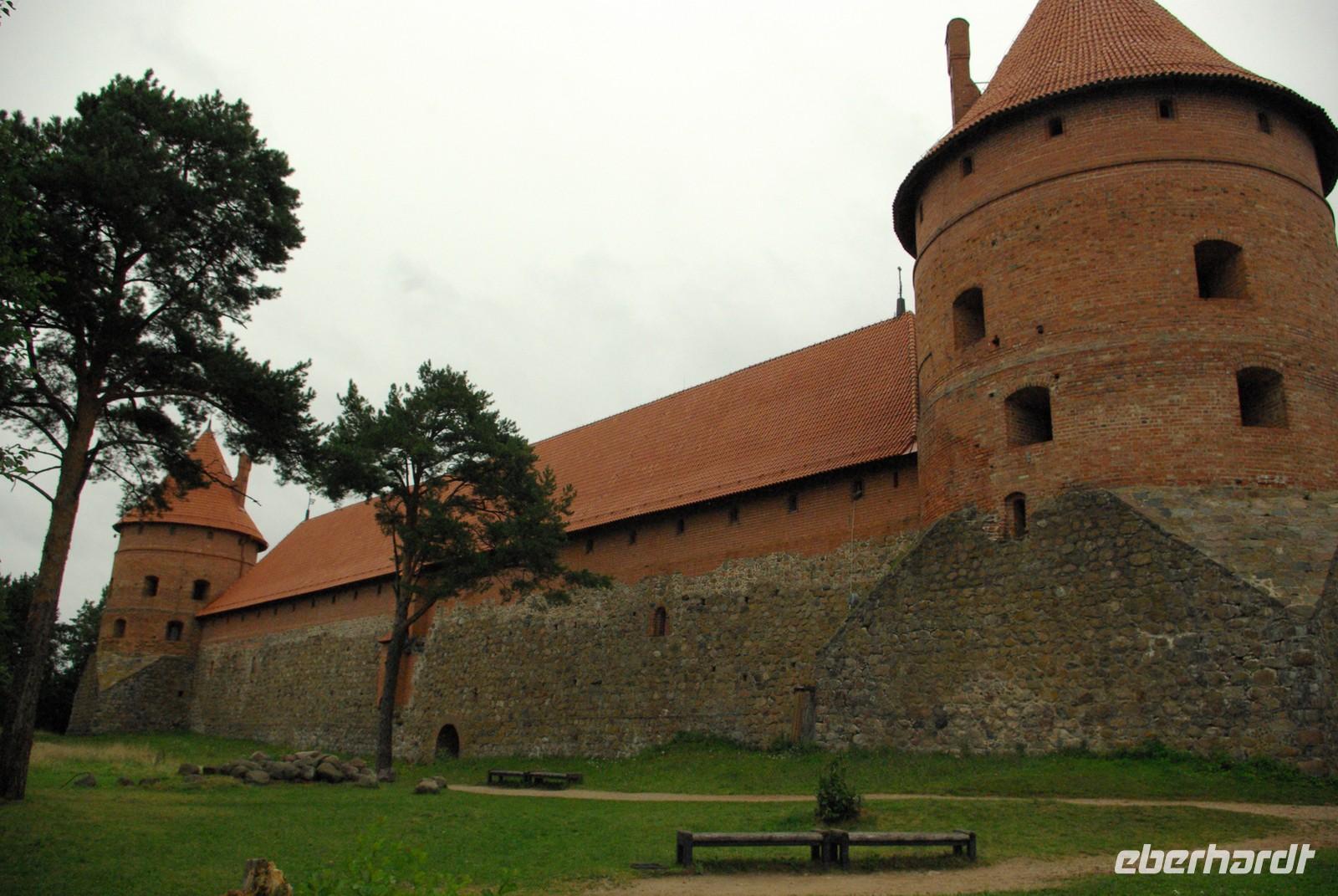 Nach der Mittagspause fuhren wir knapp 30 Kilometer zur Wasserburg Trakai, dem Wahrzeichen des unabhängigen Litauen und einem Höhepunkt der Reise. Die nur über einen Steg erreichbare Burg wurde der Legende nach schon von Fürst Gediminas als Holzfestung errichtet, die mehrfach abbrannte. Ende des 14. Jahrhunderts errichtete Vytautas der Große die steinerne Burg mit diversen Anleihen beim Deutschen Orden in Stil und Fortifikation, so dass man sich in einer kleinen Ausgabe der Marienburg wähnt. Der durch leidvolle Erfahrungen misstrauische Vytautas rekrutierte sich von der Krim, denn so weit ging sein Herrschaftsbereich, etwa 400 Familien der Karäer, ein Turkvolk, das im 7. Jahrhundert eine jüdische Sekte gebildet hatte, die sich zwar an der Thora, nicht aber an den Folgeschriften orientierte. Ganz nach dem Vorbild Kaiser Friedrich II. von Hohenstauffen, dessen Leibgarde aus sizilianischen Bergmuselmanen bestand, stellten diese Karäer die Leibwache für Vytautas. Auf dem festländischen Ortsteil sieht man noch ihre giebelständigen Holzhäuser mit den drei Fenstern: eins für Vater im Himmel, eins für den auf Erden und eines für Vytautas. Auch die Kerene, wie ihre Synagoge genannt wird, steht noch und in mehreren Gaststätten kann man ihr Nationalgericht, die typisch gefüllten Teigtaschen kosten.