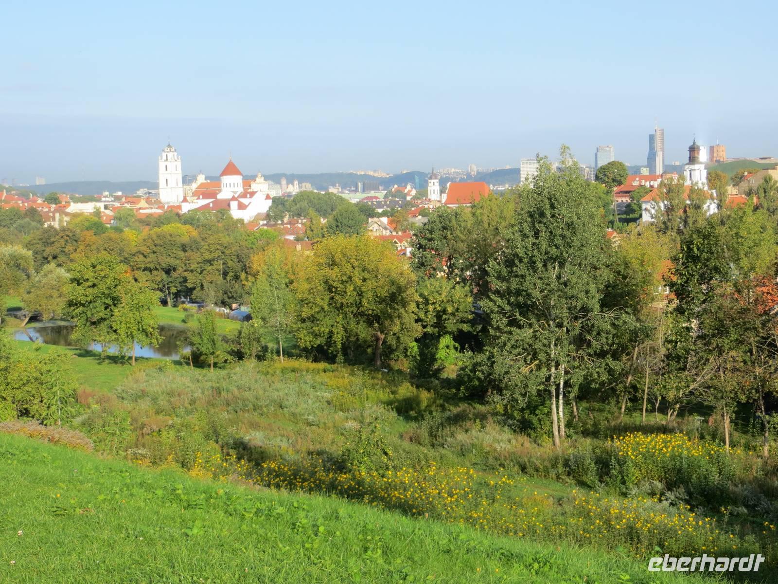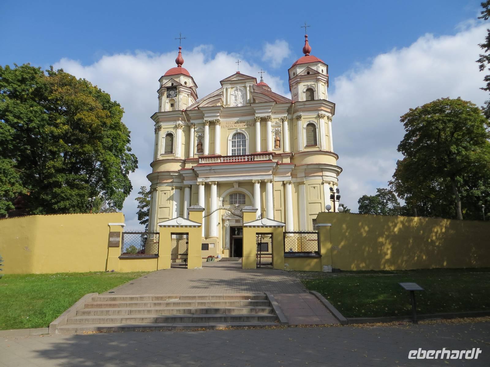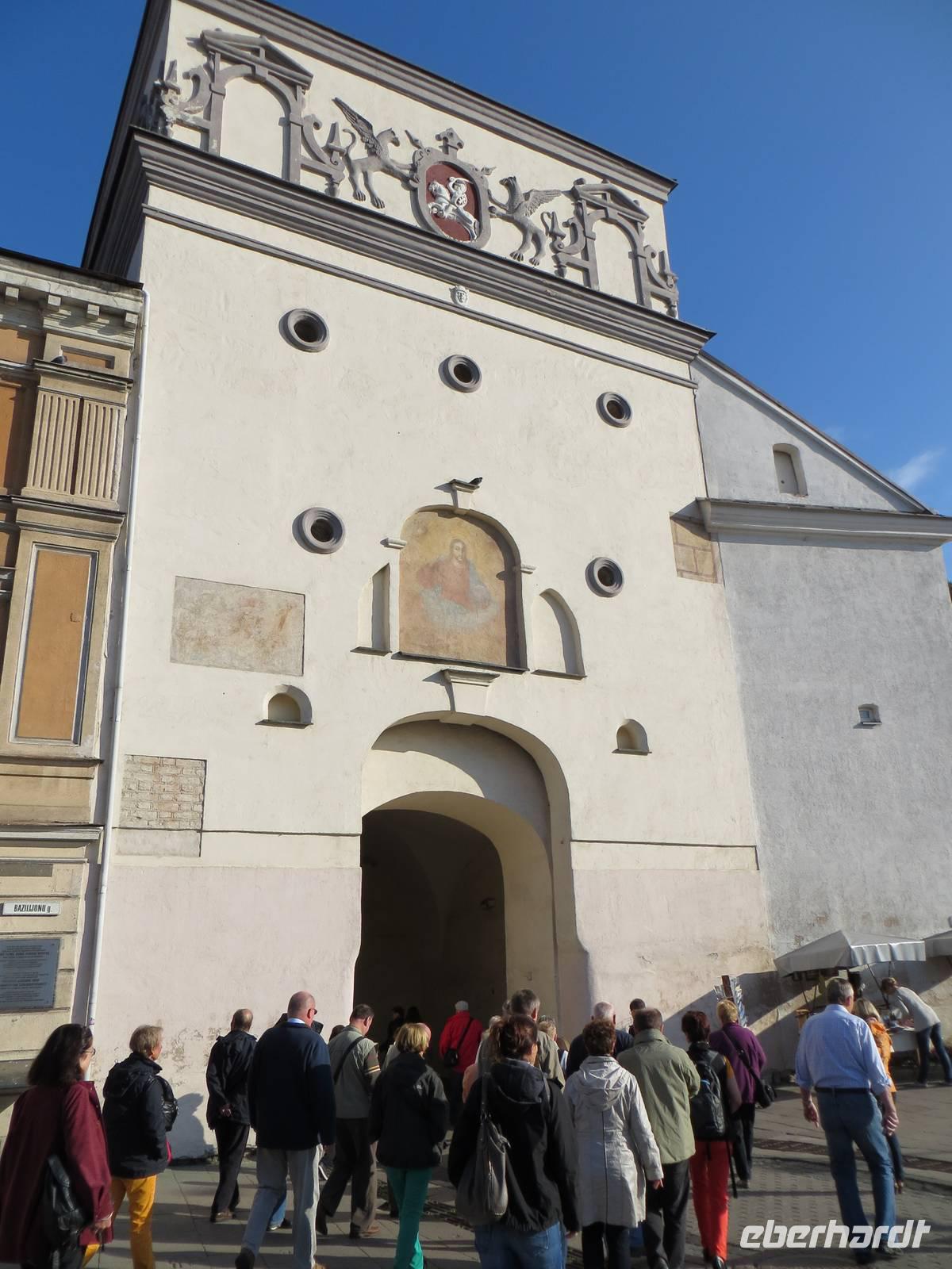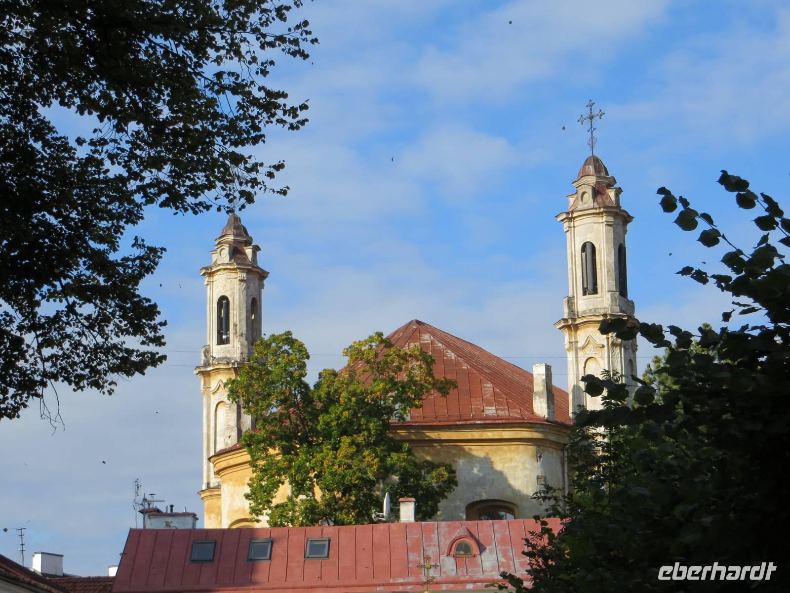 Barockstadt und UNESCO-Weltkulturerbe bei lockerer Bewölkung und Sonne; später sich etwas zuziehend: aber einige der Türme und Kuppeln strahlten recht fotogen.aber noch trocken. Mit dem Bus drehten wir eine erste Runde, vorbei an der Unabhängigen Republik von Vilnius zu einer schönen Panoramaaussicht: Jerusalem des Nordens?. Unser Stadtbummel führte uns dann vom Tor der Morgenröte zur russisch-orthodoxen Kirche, zum ehemaligen Rathaus und vorbei an der Universität und dem Präsidentenpalast bis zum Kathedralenplatz mit Unter- und Blick zur Oberburg. Fürst Gediminas wies uns bereits den Weg nach Trakai, aber zunächst bummelten wir noch zu St. Anna, einer Kirche, die auch Napoleon gefiel. Nach der individuellen Mittagspause rund um den Rathausplatz und die Burgstraße fuhren wir zur Rokoko-Kirche St. Peter und Paul mit abertausenden Stuckelementen mit mannigfaltigen Erklärungsansätzen ihrer Bedeutung und Aussage.