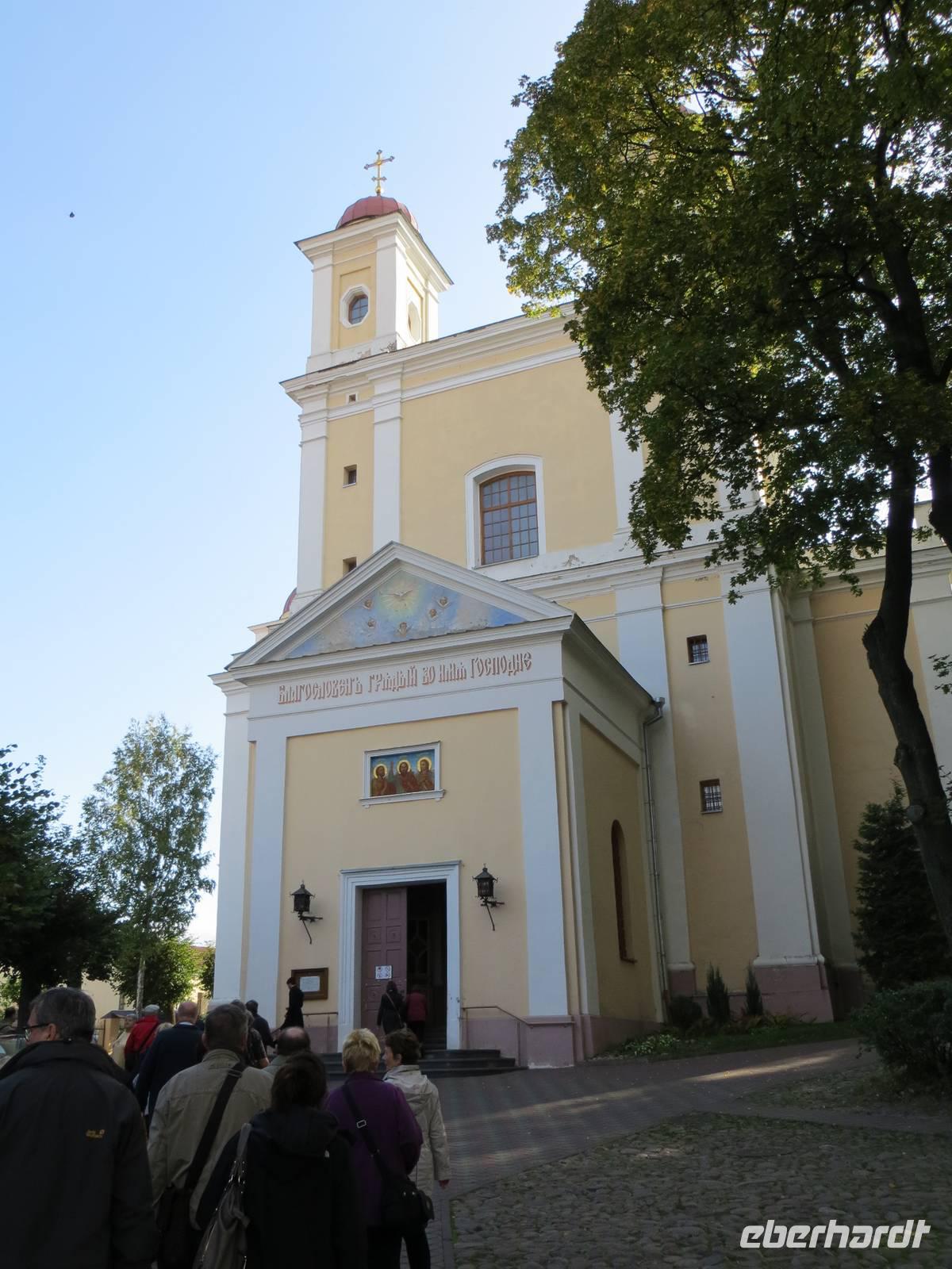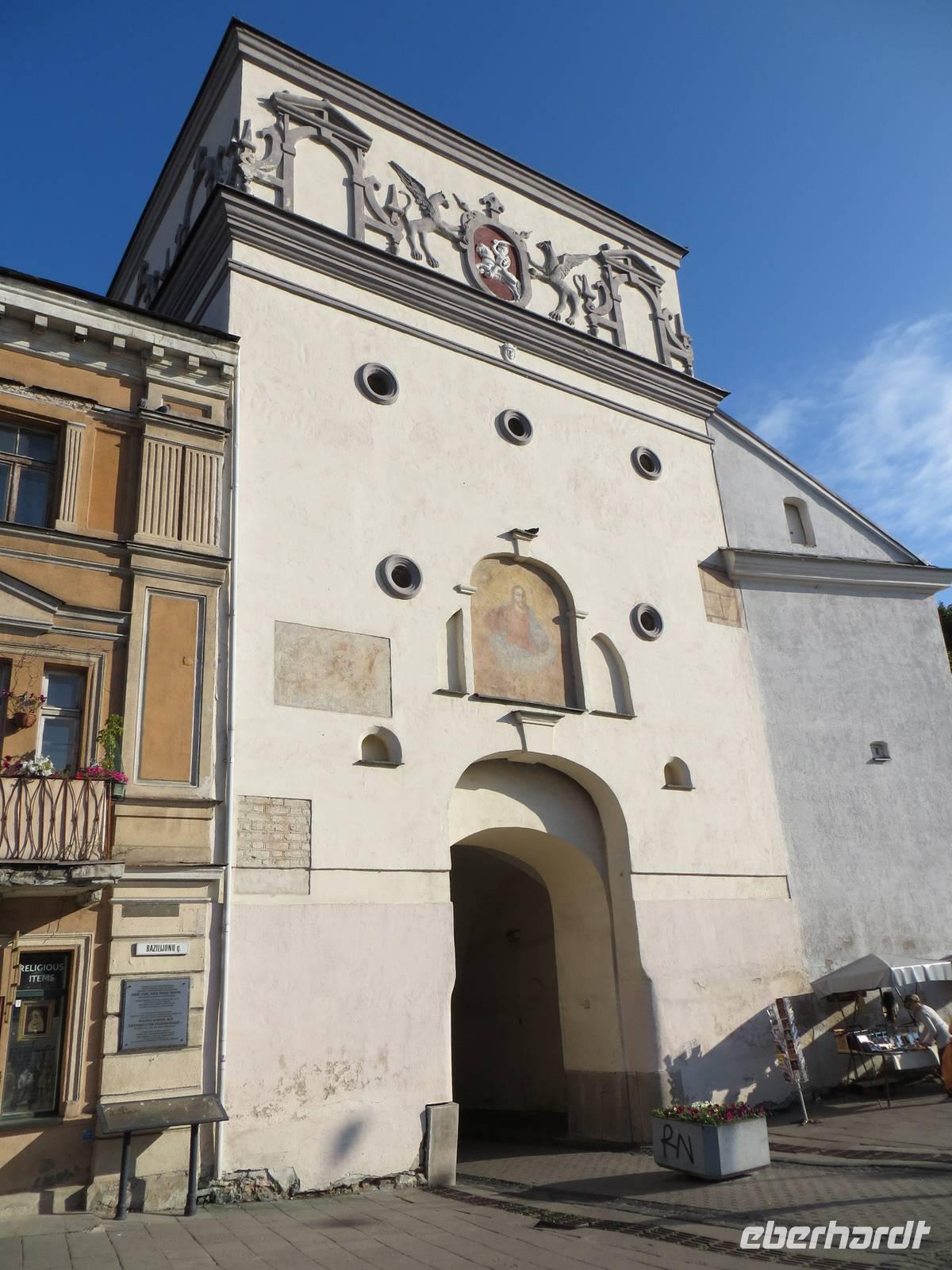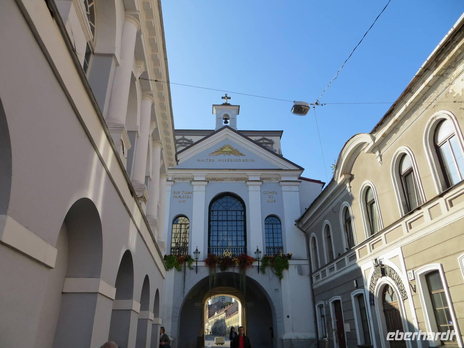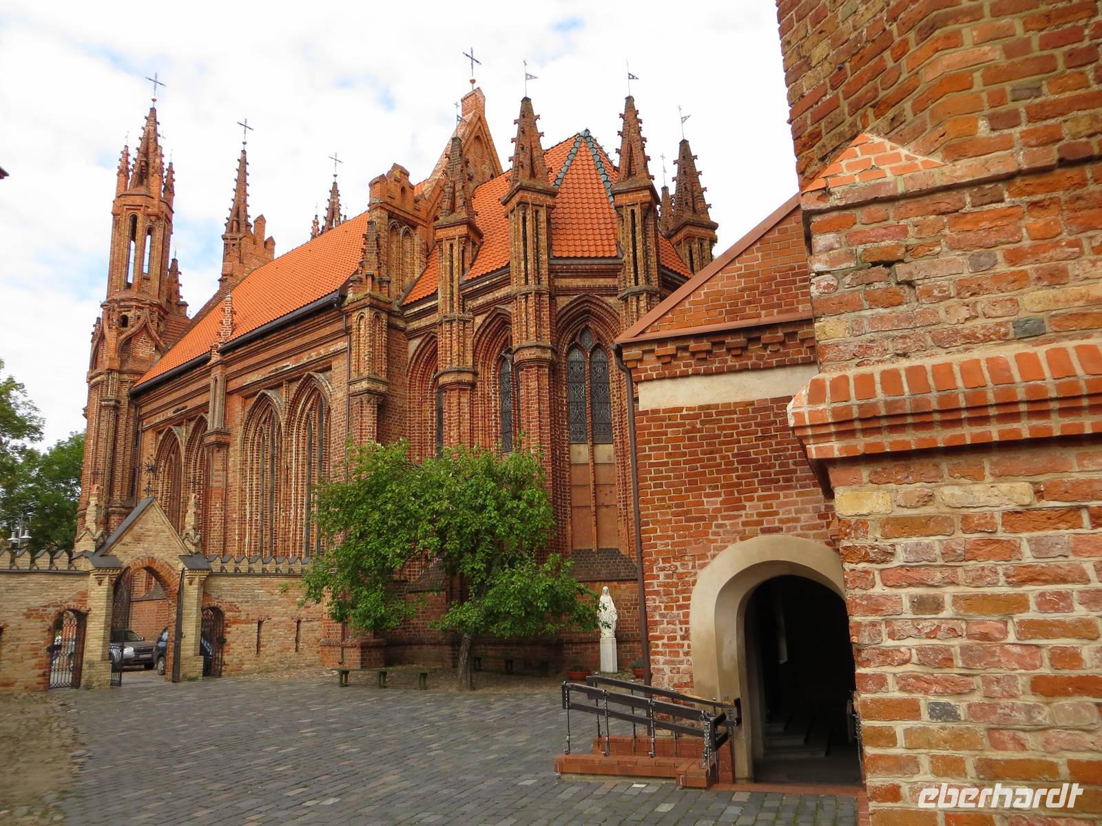 Barockstadt und UNESCO-Weltkulturerbe bei lockerer Bewölkung und Sonne; später sich etwas zuziehend: aber einige der Türme und Kuppeln strahlten recht fotogen.aber noch trocken. Mit dem Bus drehten wir eine erste Runde, vorbei an der Unabhängigen Republik von Vilnius zu einer schönen Panoramaaussicht: Jerusalem des Nordens?. Unser Stadtbummel führte uns dann vom Tor der Morgenröte zur russisch-orthodoxen Kirche, zum ehemaligen Rathaus und vorbei an der Universität und dem Präsidentenpalast bis zum Kathedralenplatz mit Unter- und Blick zur Oberburg. Fürst Gediminas wies uns bereits den Weg nach Trakai, aber zunächst bummelten wir noch zu St. Anna, einer Kirche, die auch Napoleon gefiel. Nach der individuellen Mittagspause rund um den Rathausplatz und die Burgstraße fuhren wir zur Rokoko-Kirche St. Peter und Paul mit abertausenden Stuckelementen mit mannigfaltigen Erklärungsansätzen ihrer Bedeutung und Aussage.