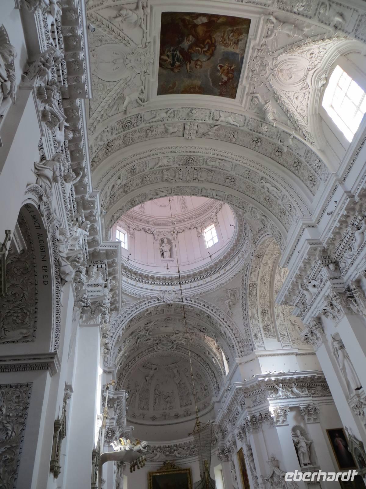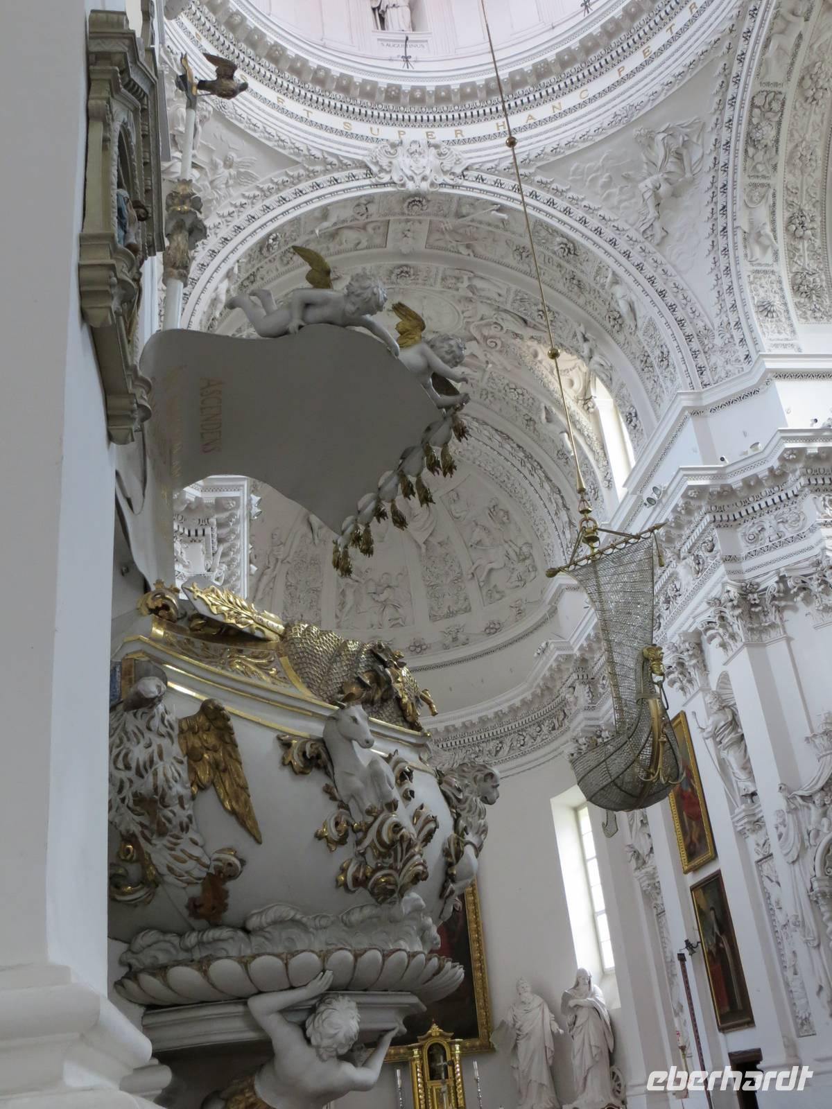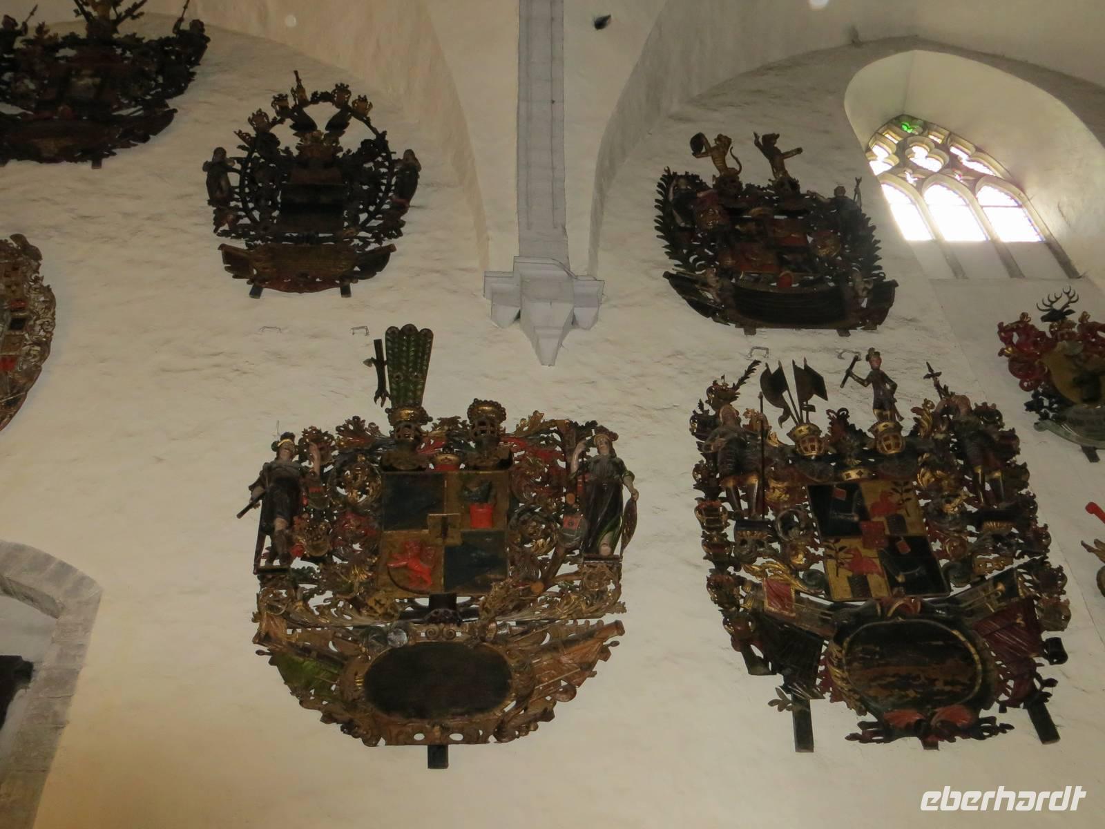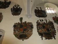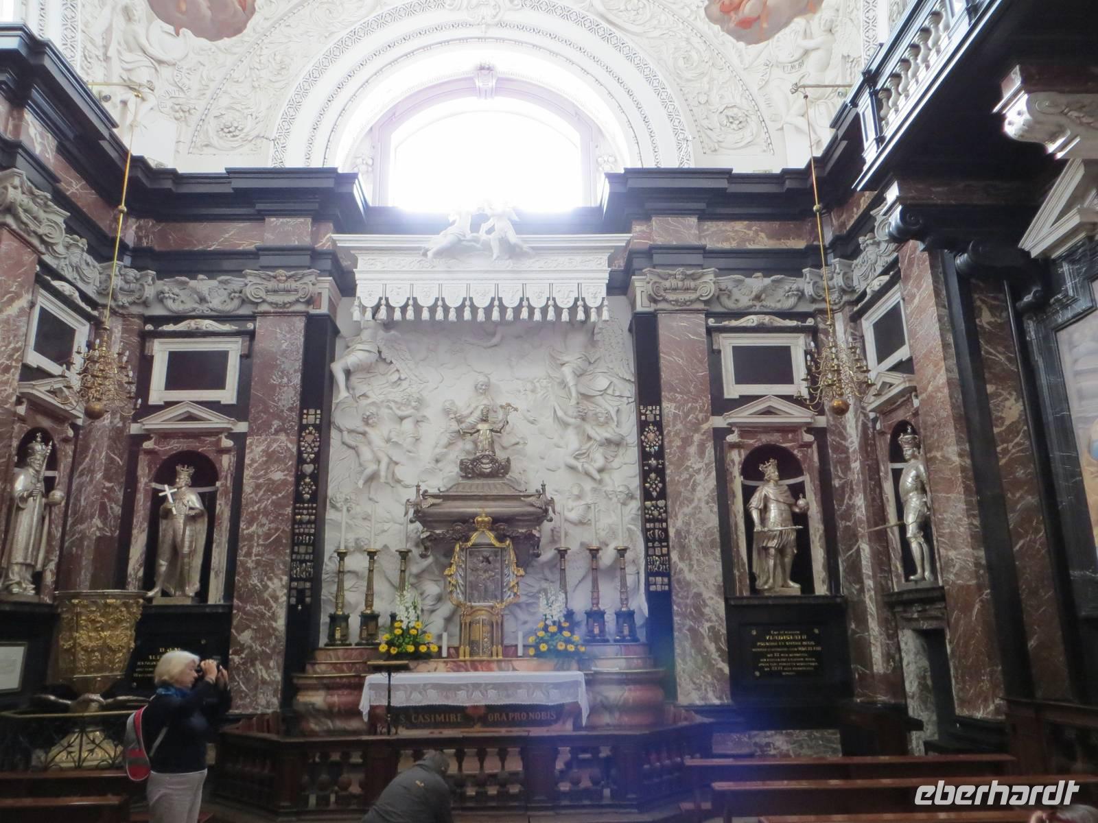 Barockstadt und UNESCO-Weltkulturerbe bei lockerer Bewölkung und Sonne; später sich etwas zuziehend: aber einige der Türme und Kuppeln strahlten recht fotogen.aber noch trocken. Mit dem Bus drehten wir eine erste Runde, vorbei an der Unabhängigen Republik von Vilnius zu einer schönen Panoramaaussicht: Jerusalem des Nordens?. Unser Stadtbummel führte uns dann vom Tor der Morgenröte zur russisch-orthodoxen Kirche, zum ehemaligen Rathaus und vorbei an der Universität und dem Präsidentenpalast bis zum Kathedralenplatz mit Unter- und Blick zur Oberburg. Fürst Gediminas wies uns bereits den Weg nach Trakai, aber zunächst bummelten wir noch zu St. Anna, einer Kirche, die auch Napoleon gefiel. Nach der individuellen Mittagspause rund um den Rathausplatz und die Burgstraße fuhren wir zur Rokoko-Kirche St. Peter und Paul mit abertausenden Stuckelementen mit mannigfaltigen Erklärungsansätzen ihrer Bedeutung und Aussage.
