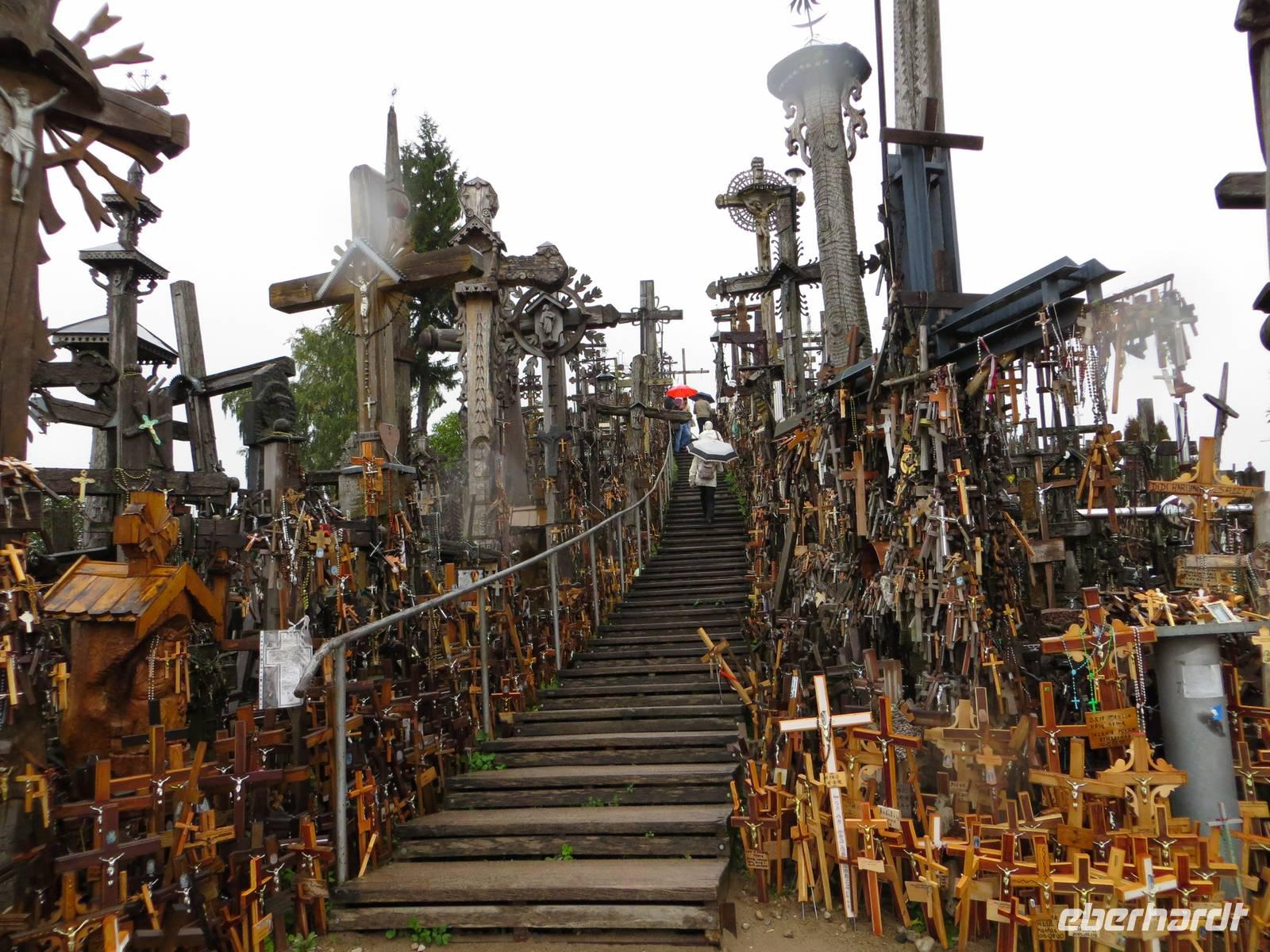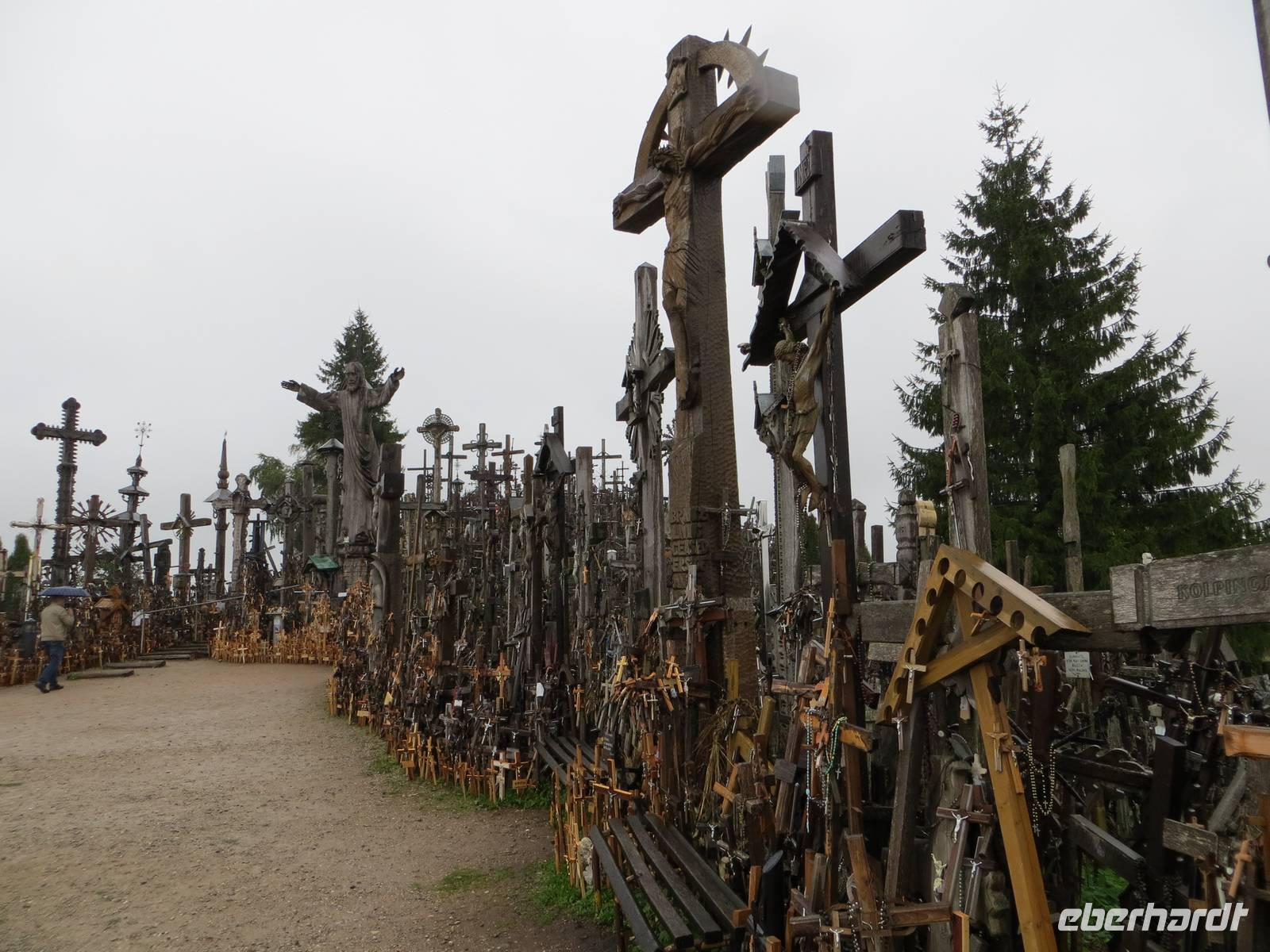Es sollte den ganzen Tag grau und regnerisch bleiben. Gegen Mittag erreichten wir den Berg der Kreuze. Einst Symbol des litauischen Widerstandes gegen russisches Zarentum und sowjetische Okkupation ist es nun noch mehr Wallfahrtsort; droht aber zu kippen in eine sinnentlehrte Ablegestelle für käuflich vor Ort zu erwerbende Billigkreuze zwischen Business und Touristenevent.