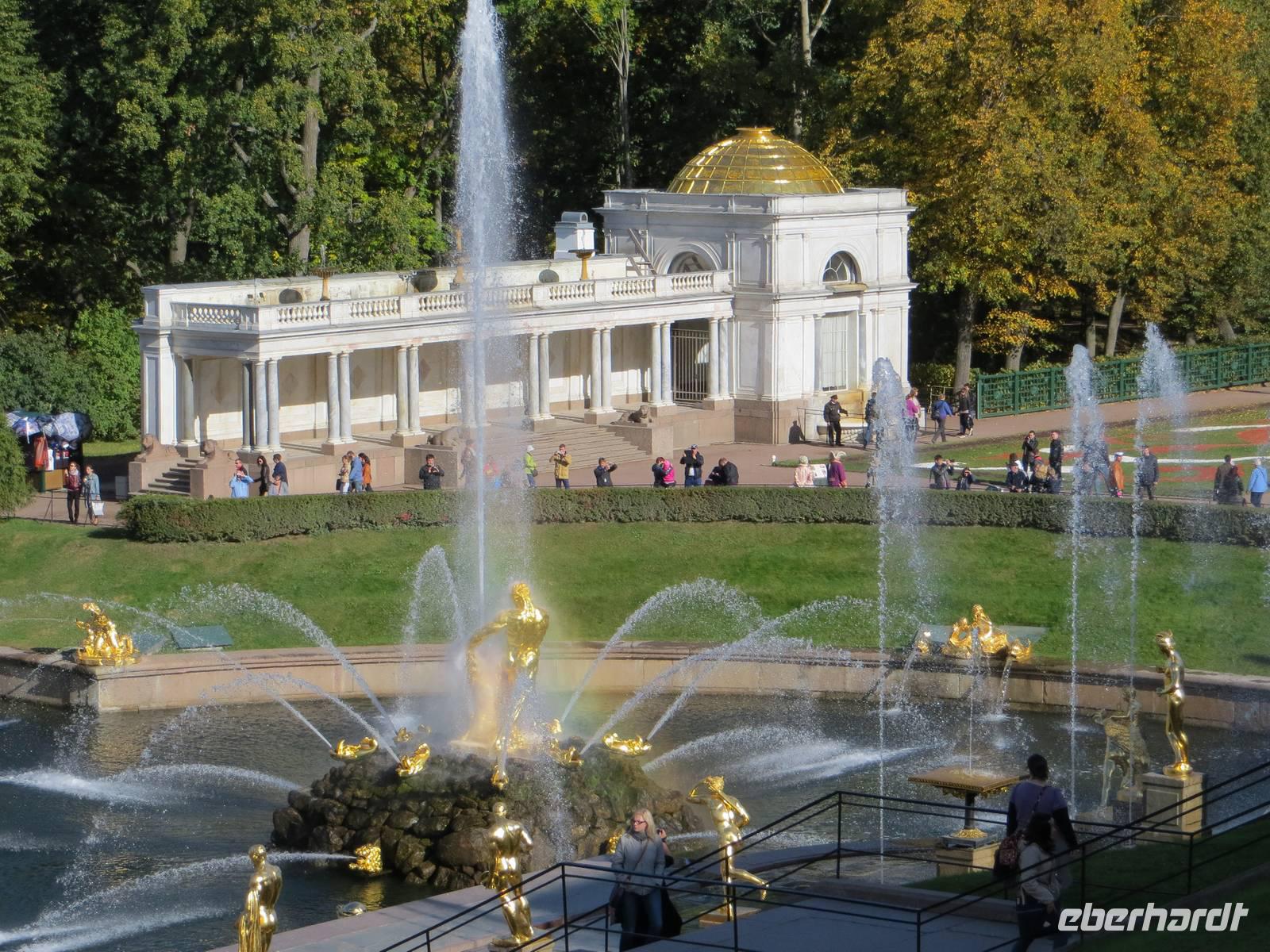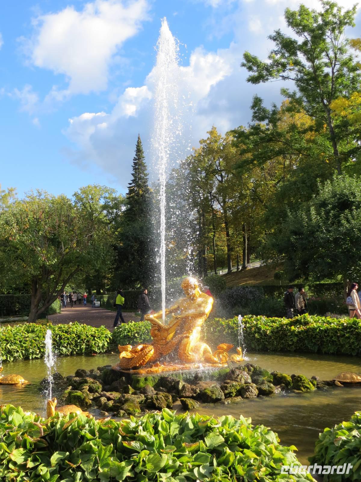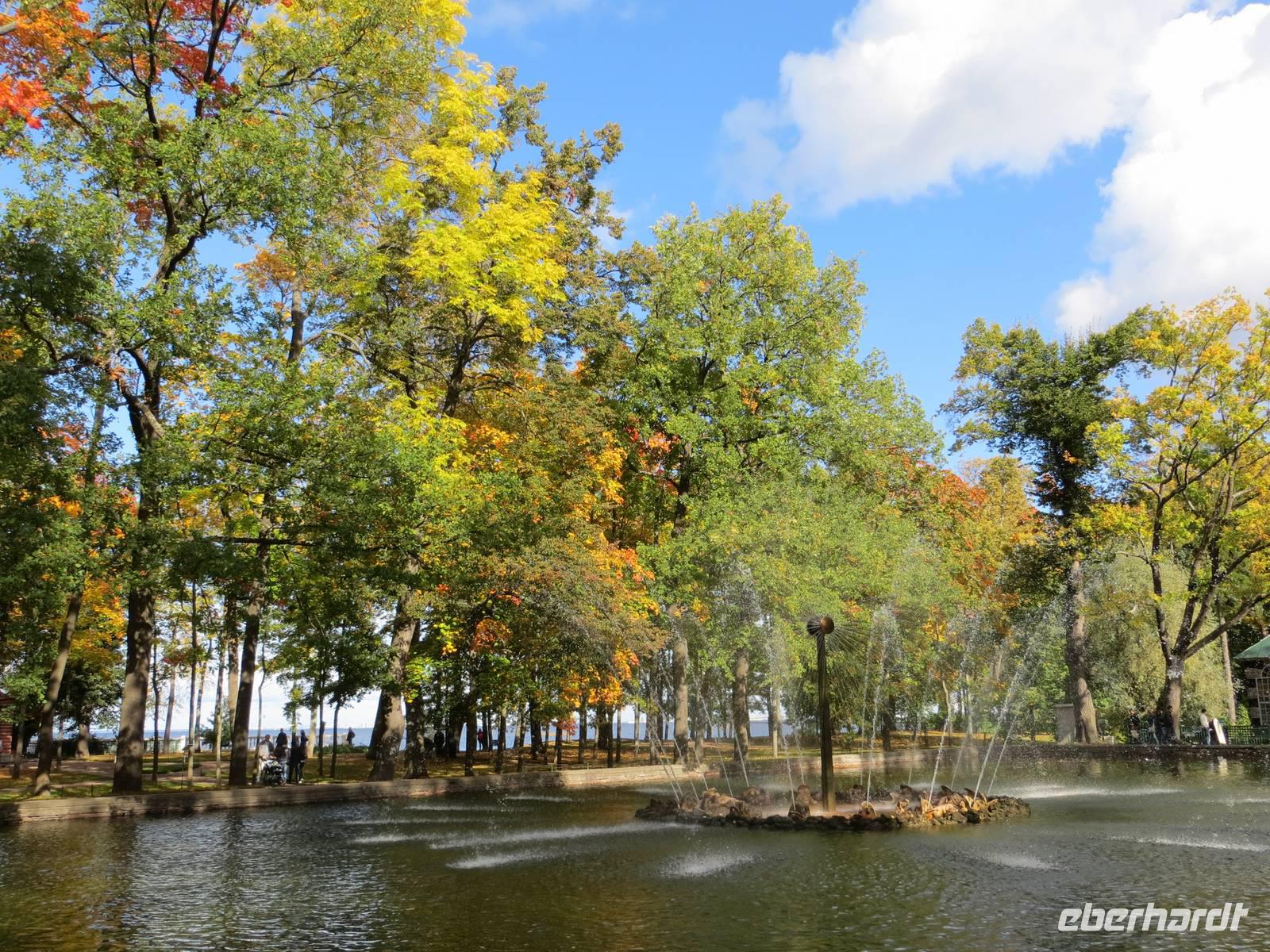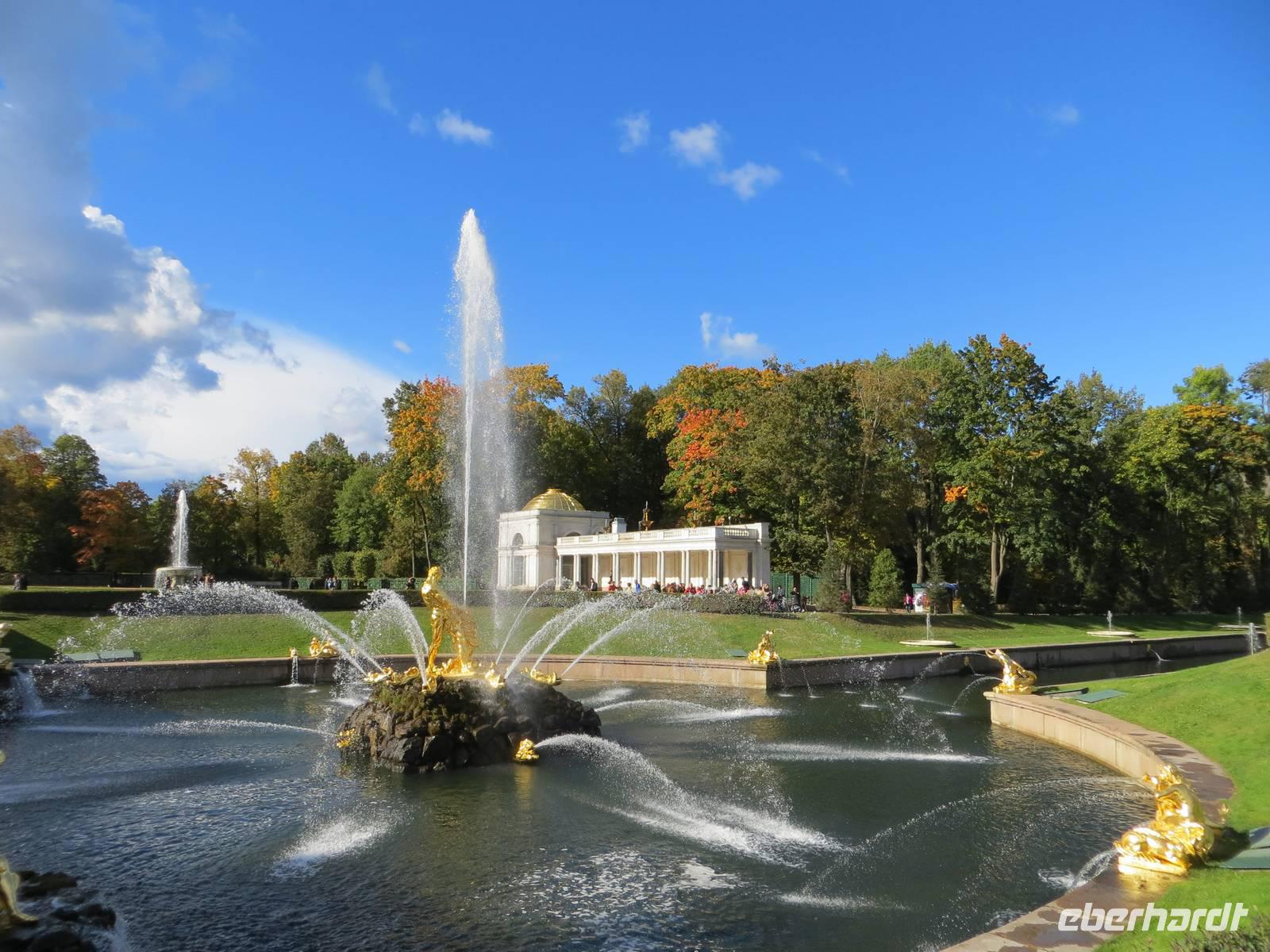Diese Frage stellt sich mancher auf unsere Fahrt nach Petershof. Nach einem verregneten Vormittag lugte immer wieder die Sonne recht kräftig hervor. Im Wechsel zwischen herrlichem Sonnenherbstlicht und käftigen Wolken wetteiferten wir mit Touristen und Einheimischen um die beste Fotogelegenheit auf die wasserspeienden Goldfiguren im Park. Langsam zogen kräftige Wolken über den Finnischen Meerbusen auf ... ein Regenguss ließ uns schnell Zuflucht im Cafe oder im Bus finden. Ein typischer, zeitiger Herbsttag ging zu Ende und avisierte den russischen-finnischen Herbst für unsere Weiterfahrt durch Karelien...