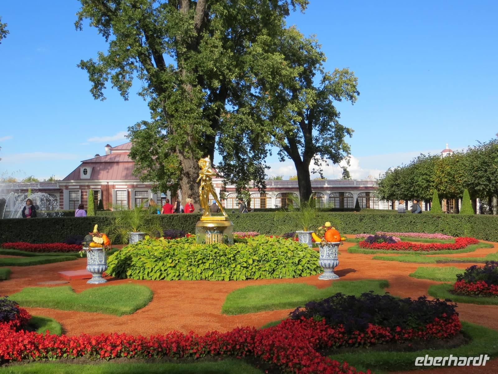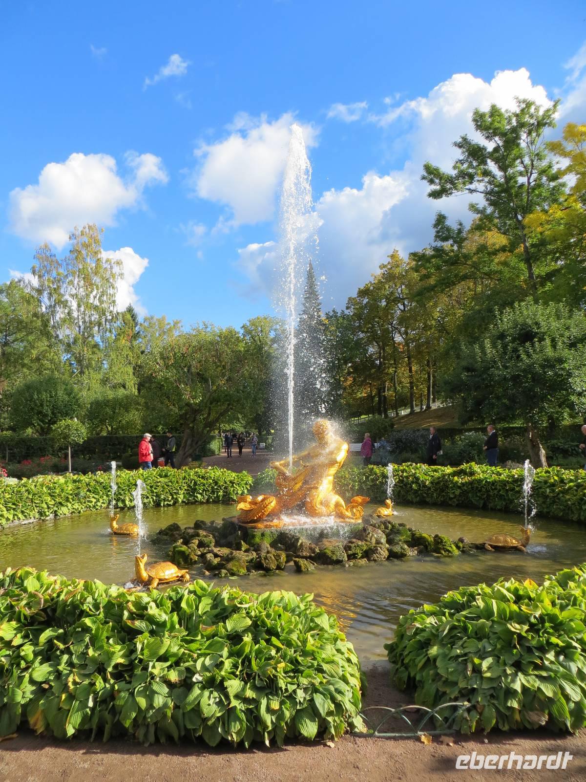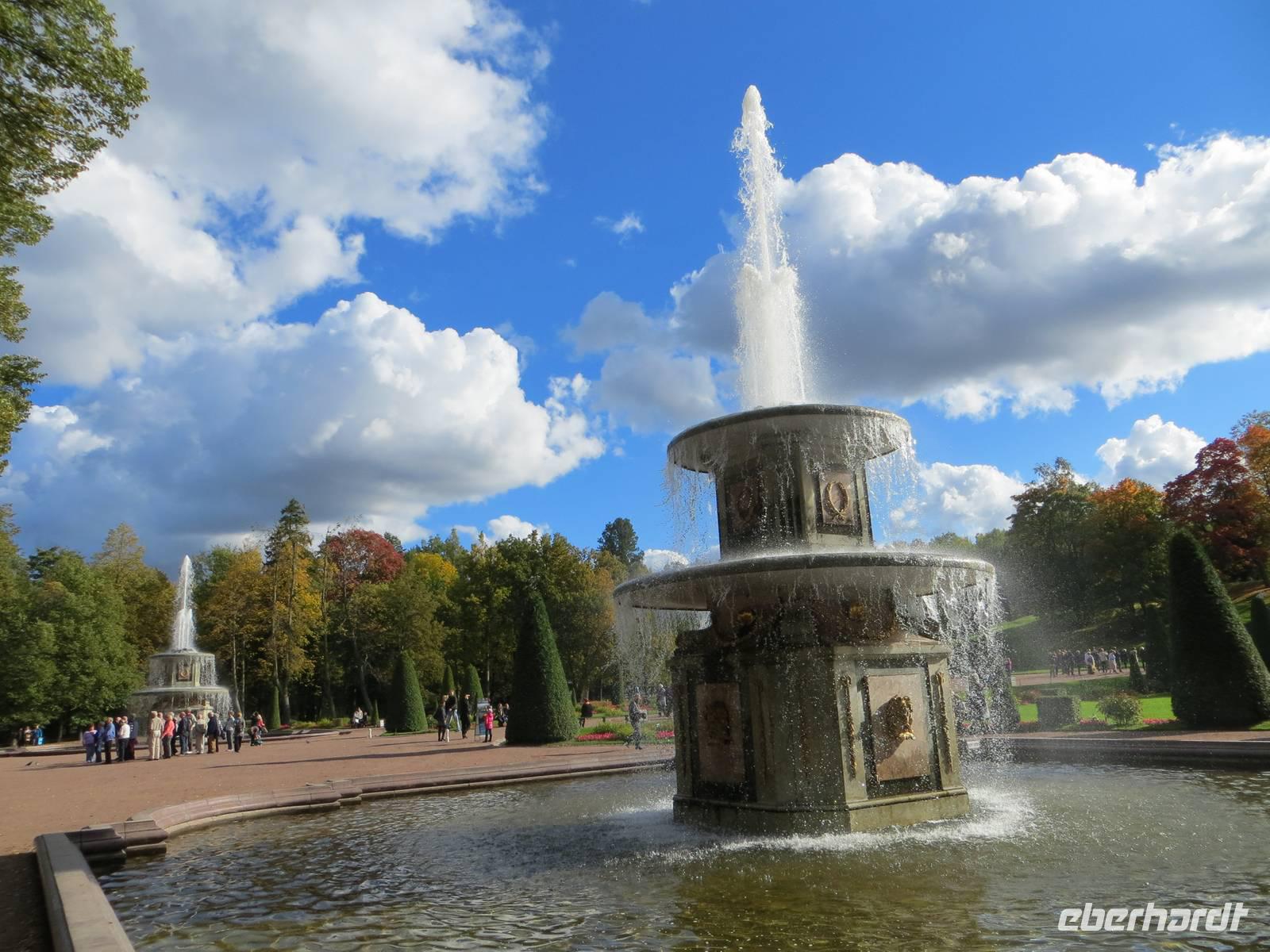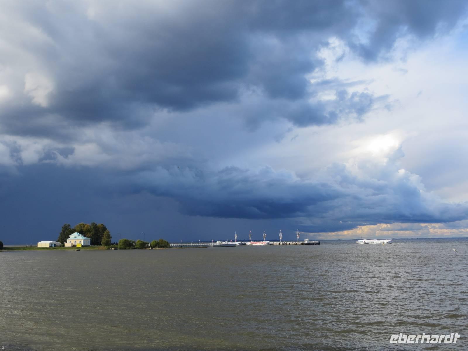 Diese Frage stellt sich mancher auf unsere Fahrt nach Petershof. Nach einem verregneten Vormittag lugte immer wieder die Sonne recht kräftig hervor. Im Wechsel zwischen herrlichem Sonnenherbstlicht und käftigen Wolken wetteiferten wir mit Touristen und Einheimischen um die beste Fotogelegenheit auf die wasserspeienden Goldfiguren im Park. Langsam zogen kräftige Wolken über den Finnischen Meerbusen auf ... ein Regenguss ließ uns schnell Zuflucht im Cafe oder im Bus finden. Ein typischer, zeitiger Herbsttag ging zu Ende und avisierte den russischen-finnischen Herbst für unsere Weiterfahrt durch Karelien...