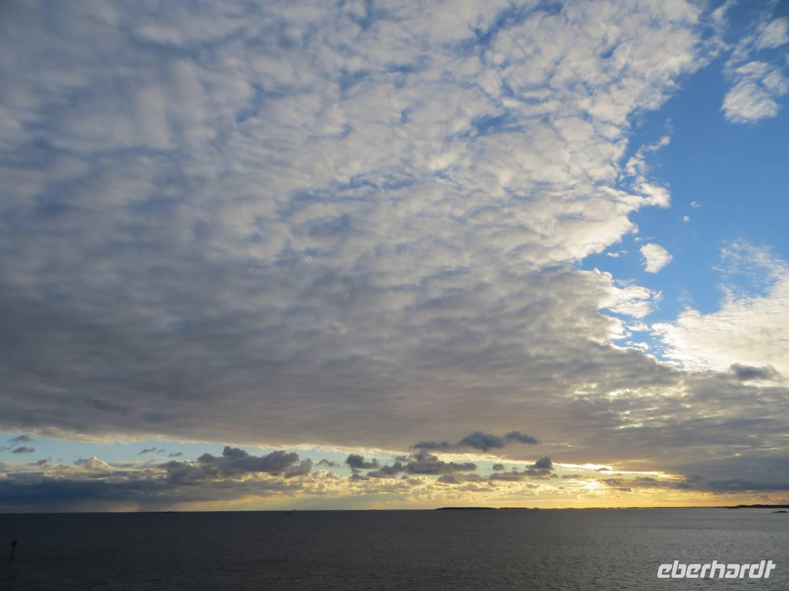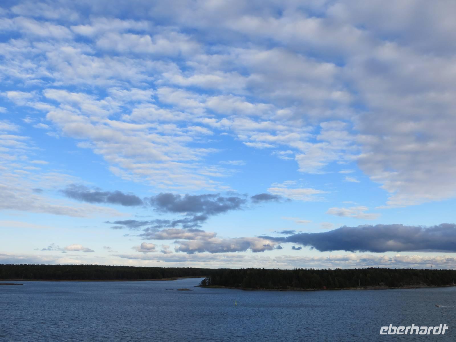 Auf Mannerheim und seine Bedeutung für die finnische Unabhängigkeit waren wir schon beim Durchfahren Kareliens eingegangen. Also heute vorbei an seinem Denkmal und Erklärungen für den massiven Wohnungsbau für Vertriebene aus Karelien Ende der vierziger Jahre. Während der Stadtrundfahrt aber auch immer wieder Bezug auf schwedische und russische Zugehörigkeit Finnlands . Zahlreiche historische Bauten Helsinkis entstanden im 19. Jahrhundert und tragen so spätklassizistisches Antlitz. Hiesige Jugendstilbauten sind eher zurückhaltend im national-romantischen Stil. Besonders hübsch aber sind die Inselchen mit einigen herbstlichen Bäumen und Holzhäusern in den Buchten. Olympiastadion von 1952 mit Paavo Nurmi, Sibelus-Denkmal, der weiße Dom, besonders aber die moderne Felsenkirche waren wichtige Stopps unserer dreistündigen Stadtrundfahrt. Nach individueller Freizeit waren wir rechtzeitig an Bord von Finnlady, um dem Hafengeschehen zuzuschauen. Ein leckeres Buffet krönte den Abend. Offene See ... Gute Nacht.