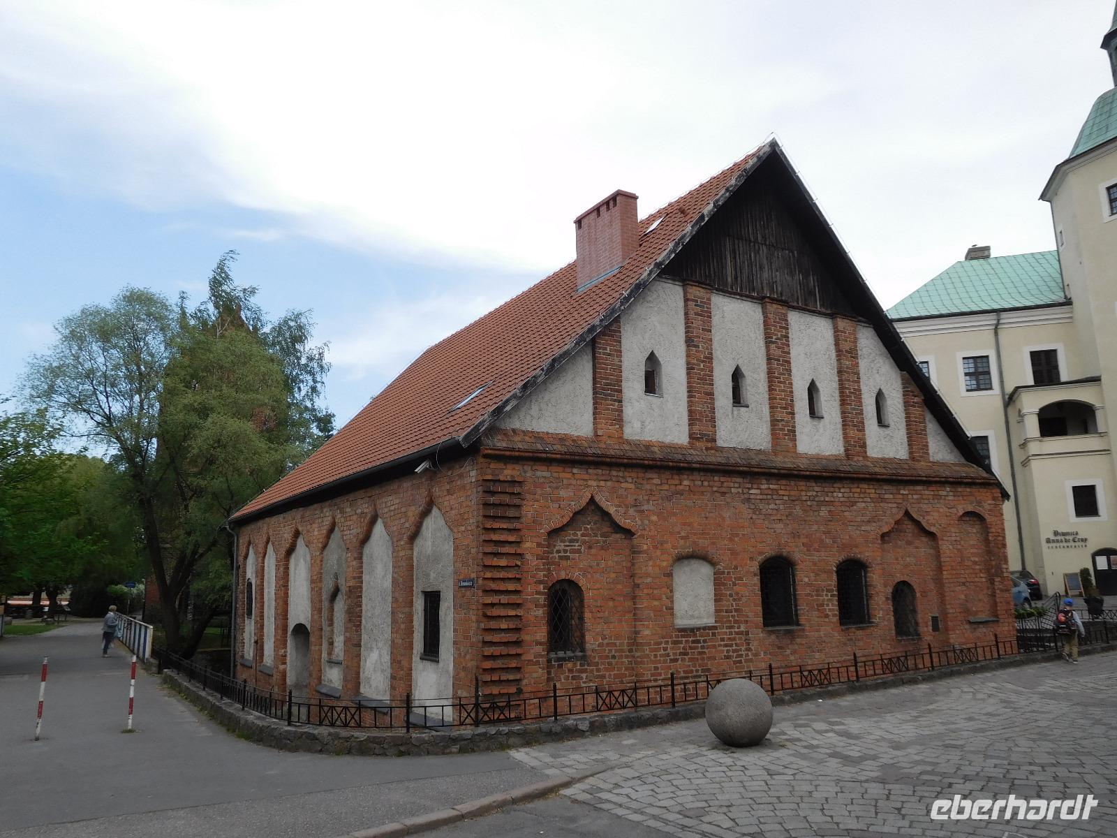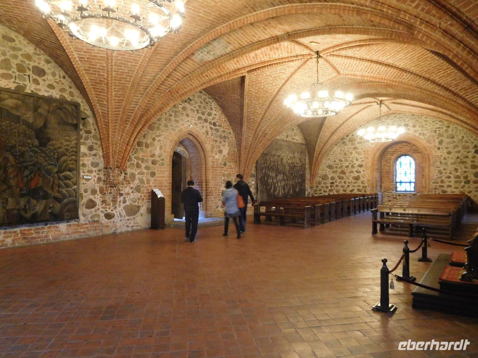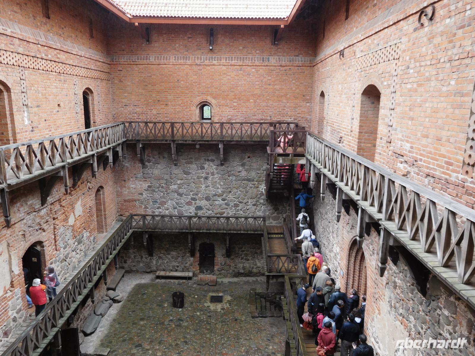 Nach einem guten Frühstück fuhren alle Gäste mit unserem Bus zur Wasserburg Trakai. Sie ist das Wahrzeichen des unabhängigen Litauen und einem Höhepunkt der Reise. Die nur über einen Steg erreichbare Burg wurde der Legende nach schon von Fürst Gediminas als Holzfestung errichtet, die mehrfach abbrannte. Ende des 14. Jahrhunderts errichtete Vytautas der Große die steinerne Burg mit diversen Anleihen beim Deutschen Orden in Stil und Fortifikation, so dass man sich in einer kleinen Ausgabe der Marienburg wähnt. Von hier regierten die Großfürsten ein Land, das von der Ostsee bis zum Schwarzen Meer reichte. Der durch leidvolle Erfahrungen misstrauisch gewordene Vytautas rekrutierte sich von der Krim, denn so weit ging sein Herrschaftsbereich, etwa 400 Familien der Karäer, ein Turkvolk, das im 7. Jahrhundert eine jüdische Sekte gebildet hatte, die sich zwar an der Thora, nicht aber an den Folgeschriften orientierte. Ganz nach dem Vorbild Kaiser Friedrich II. von Hohenstauffen, dessen Leibgarde aus sizilianischen Bergmuselmanen bestand, stellten diese Karäer die Leibwache für Vytautas. Auf dem festländischen Ortsteil sieht man noch ihre giebelständigen Holzhäuser mit den drei Fenstern: eins für Vater im Himmel, eins für den auf Erden und eines für Vytautas. Auch die Kerene, wie ihre Synagoge genannt wird, steht noch.