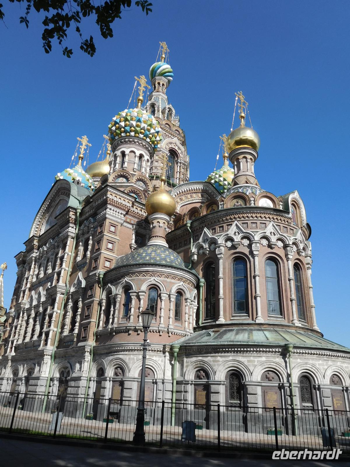 Das Besichtigungsprogramm begann mit dem Besuch der Eremitage, dem kunsthistorischen Höhepunkt der Reise, denn schließlich ist sie eine der drei größten Kunstsammlungen überhaupt, auch qualitativ. Die anschließende Mittagspause am Bus diente auch dem Verdauen der Unzahl von Eindrücken. Anschließend wartete mit Peterhof die nach dem Vorbild von Versailles als Sommerschloss erbaute Palastanlage. Sie begeistert vor allem durch die imposanten Wasserspiele mit zahlreichen vergoldeten Figuren, die die größte geschlossene Brunnenanlage der Welt bildet. Das Funkeln der Fontänen und der vergoldeten mythologischen Figuren, dazu im Hintergrund die Ostsee- einen schöneren Abschluss des Petersburg- Teils kann man sich kaum vorstellen. Leider regnete es ununterbrochen, aber das konnte der Freude keinen Abbruch tun. Nach dem Abendessen schlenderten fast alle noch in die City oder mit dem Reiseleiter auf den nahe gelegenen Künstlerfriedhof des Newskiklosters, auf dem zum Beispiel die Komponisten Tschaikowski, Mussorgski, Glinka und Strawinski, sowie der Dichter Dostojewski und begraben sind.