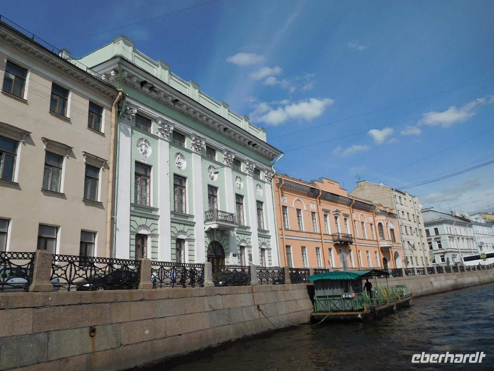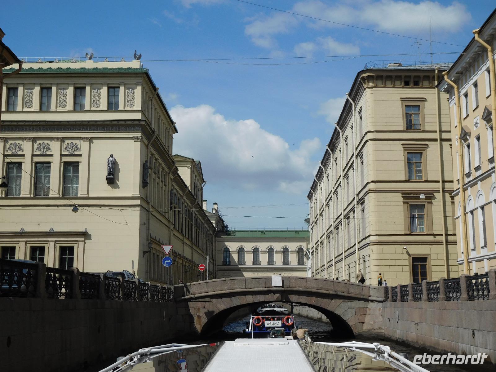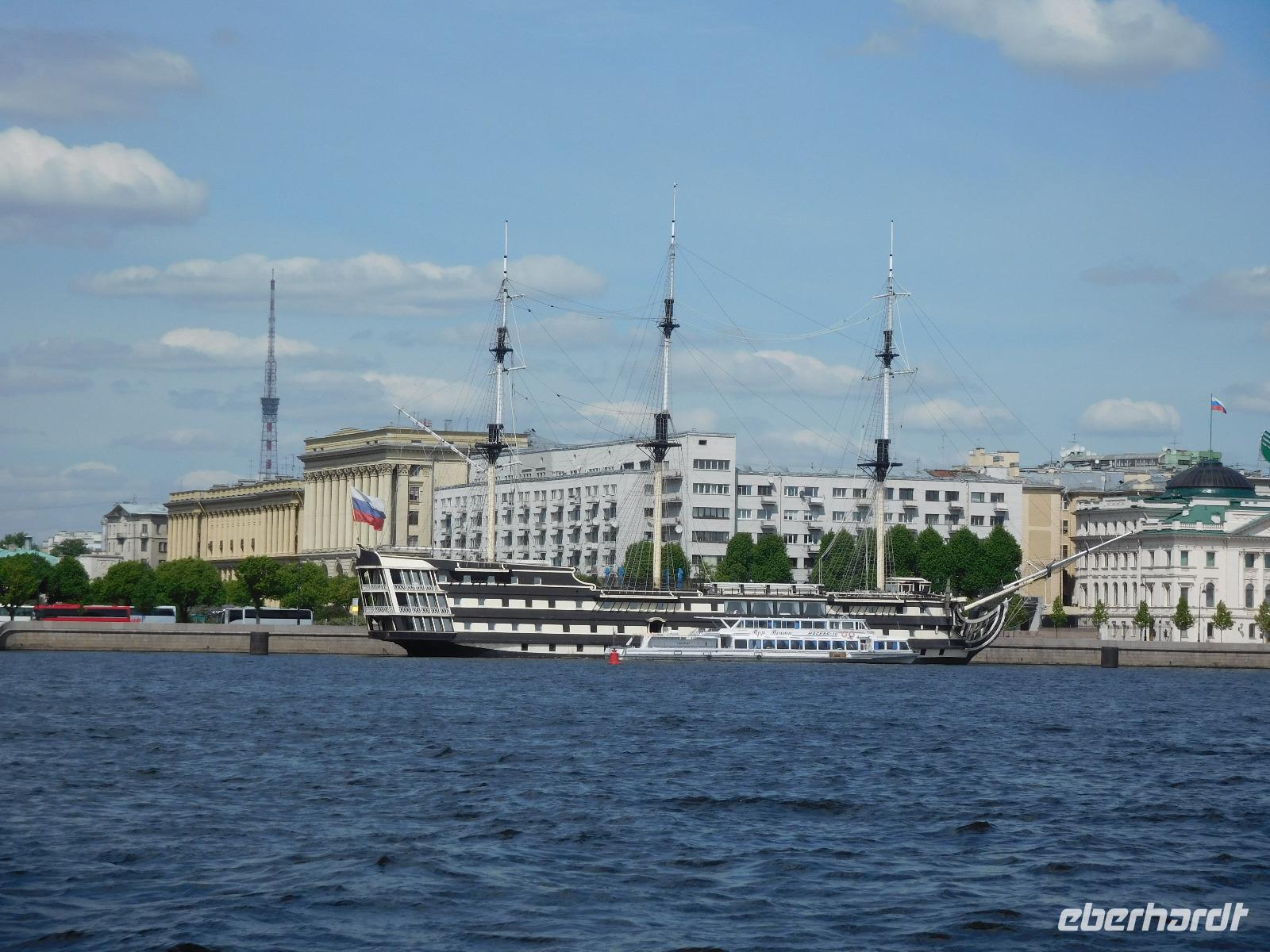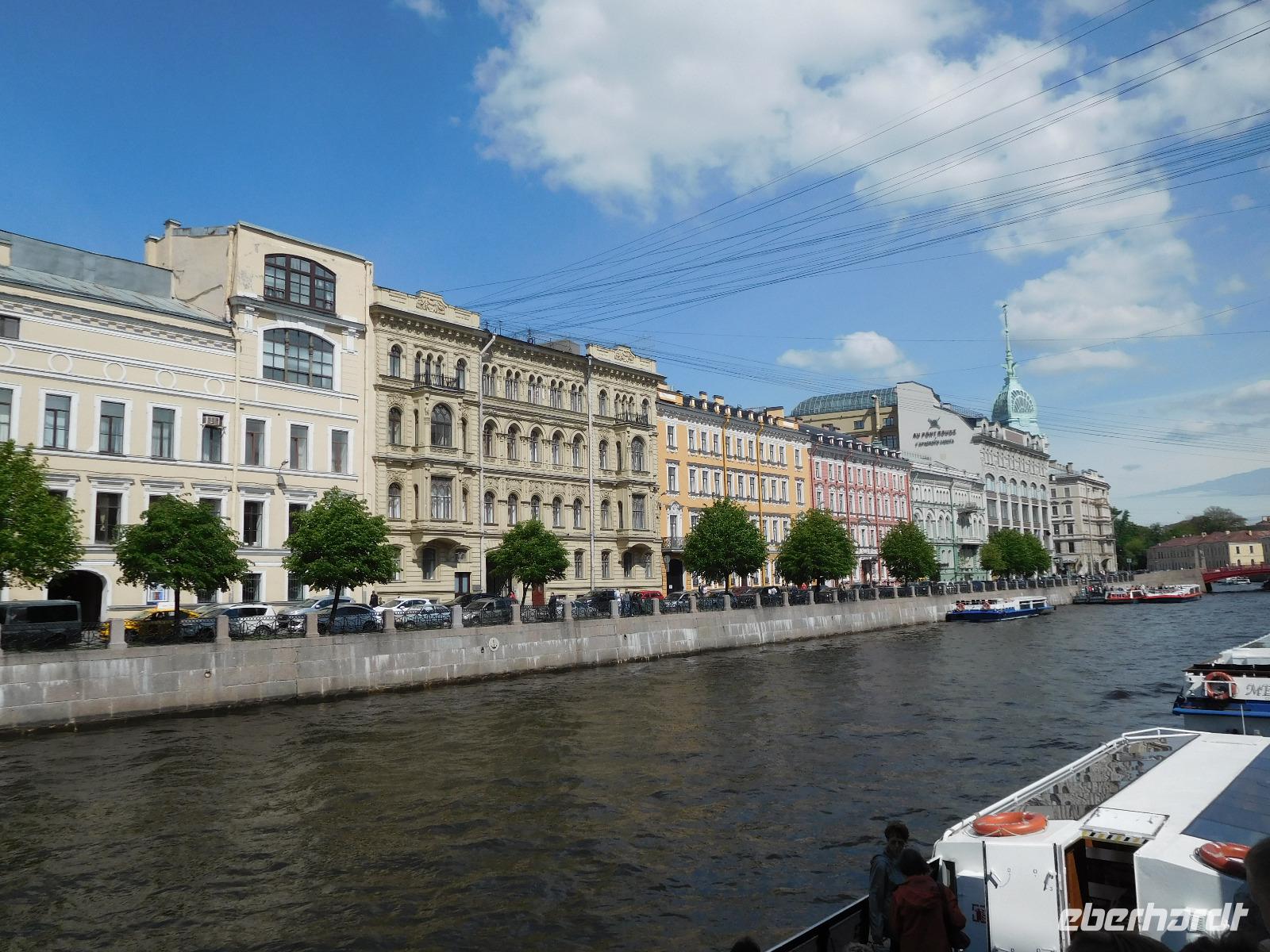 Auf den Vorschlag unseres engagierten Stadtführers Timo hin entschieden sich alle Gäste für eine kleine Bootsfahrt, die bei strahlendem Sonnenschein am Mittag startete. Durch den Zuschuß von Eberhardt-Travel hielten sich die Selbstkosten auch in Grenzen. Die Tour zeigte uns zunächst viele Villen und Paläste am Gribojedewkanal, der Moika und der Fontanka, bevor wir herrliche Ansichten auf der Newa genießen konnten. Vom Bott hatte man die denkbar besten Blicke auf den Marmorpalast des Fürsten Orlow, sowie diverse andere Paläste und Kirchen. Leider liegt der berühmte Panzerkreuzer Aurora zur Zeit auf dem Reparaturdock und war daher nicht zu besichtigen, aber auch ohne dies dürfte dies eine allen unvergessliche Stunde gewesen sein.