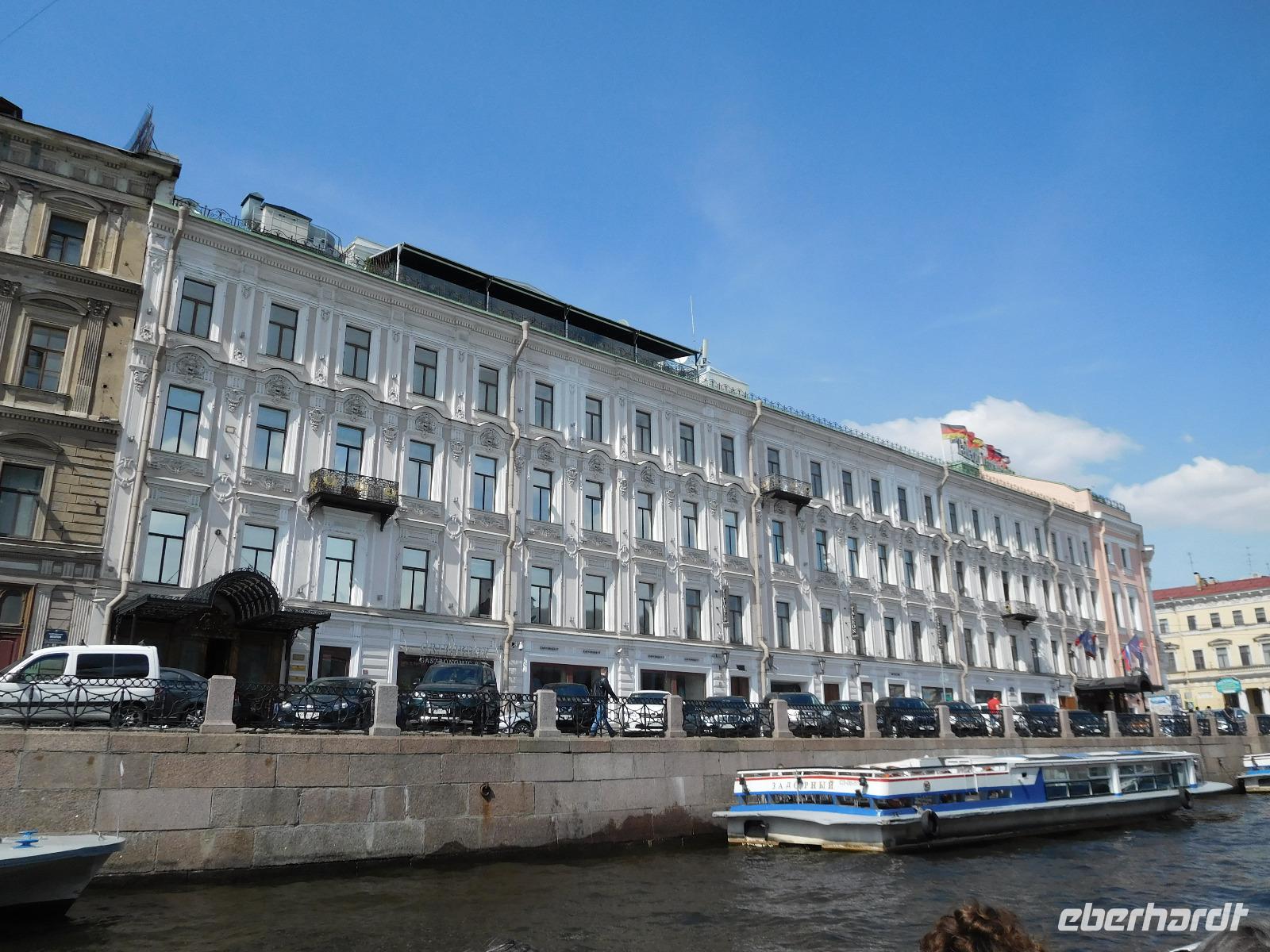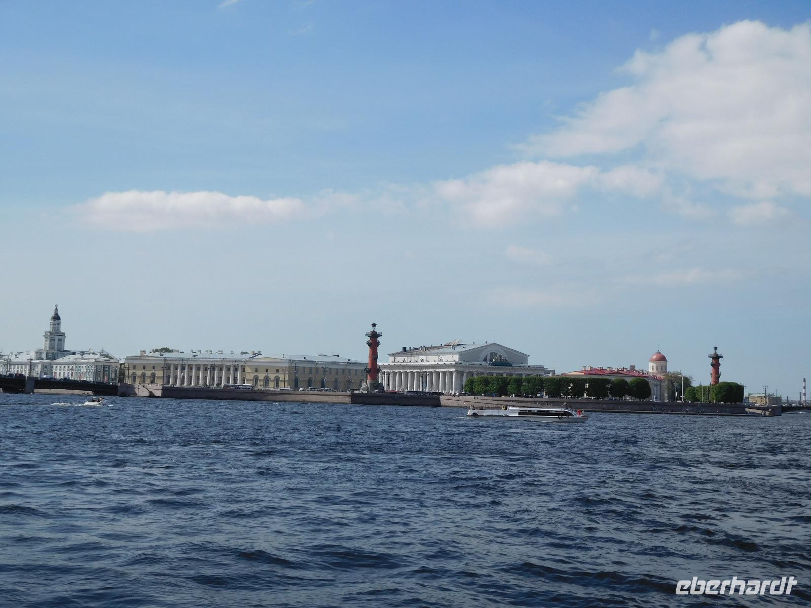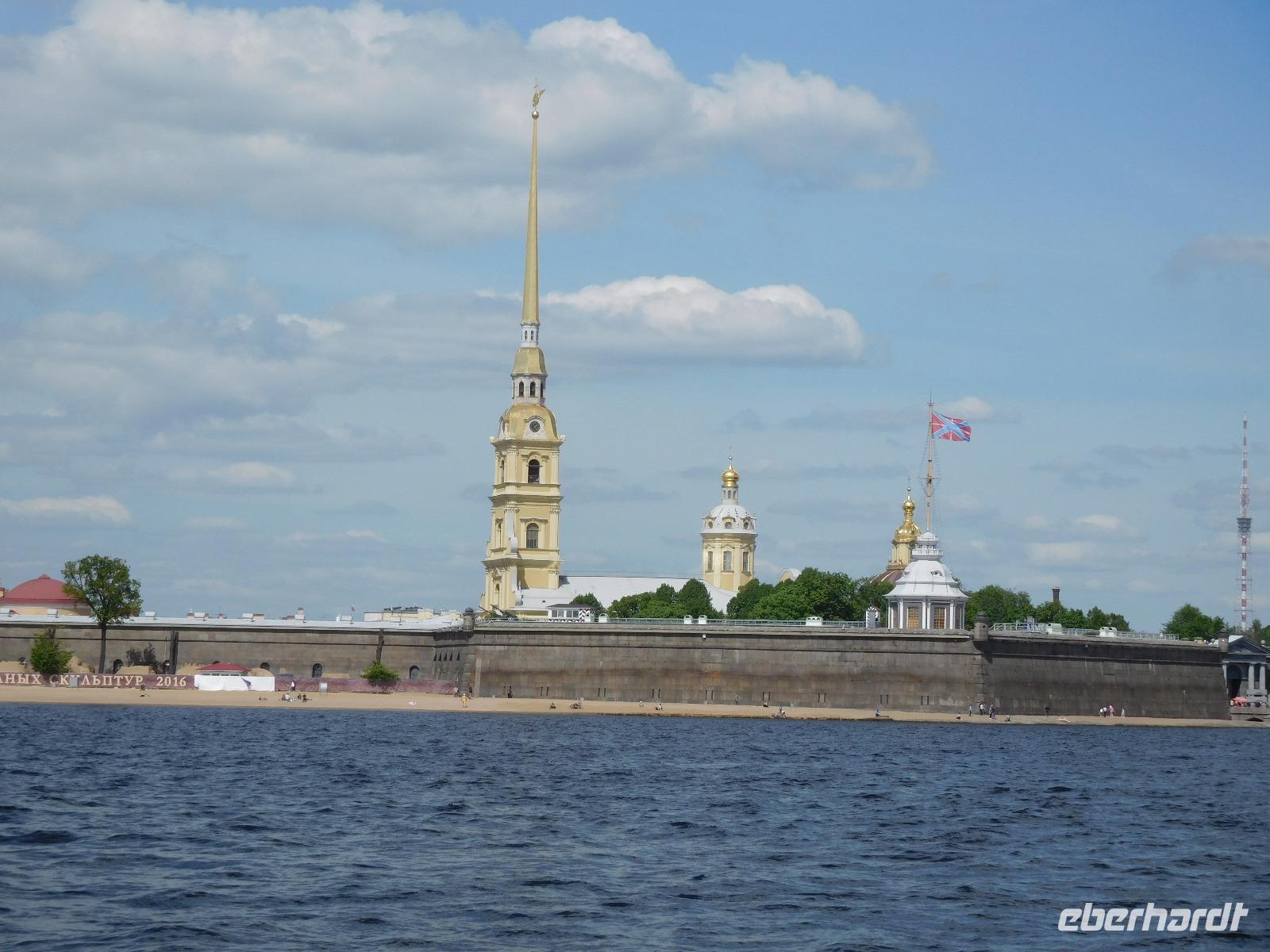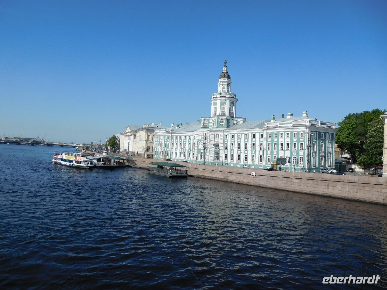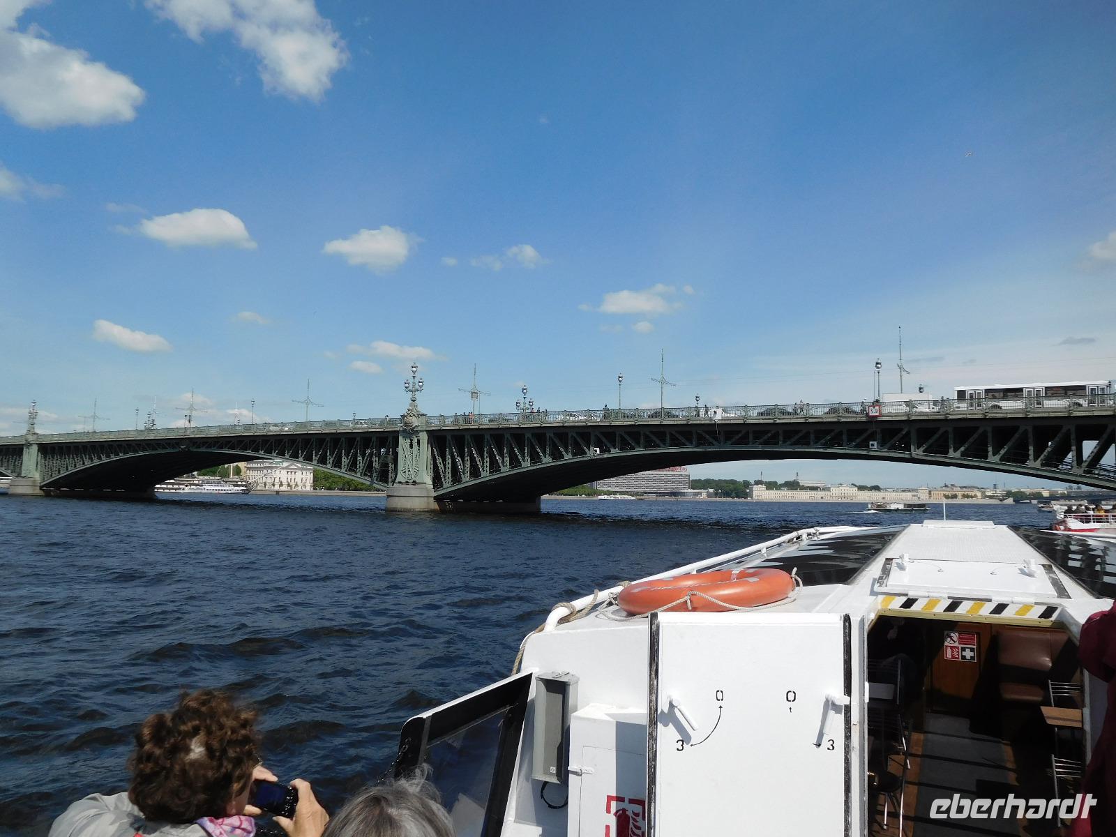 Auf den Vorschlag unseres engagierten Stadtführers Timo hin entschieden sich alle Gäste für eine kleine Bootsfahrt, die bei strahlendem Sonnenschein am Mittag startete. Durch den Zuschuß von Eberhardt-Travel hielten sich die Selbstkosten auch in Grenzen. Die Tour zeigte uns zunächst viele Villen und Paläste am Gribojedewkanal, der Moika und der Fontanka, bevor wir herrliche Ansichten auf der Newa genießen konnten. Vom Bott hatte man die denkbar besten Blicke auf den Marmorpalast des Fürsten Orlow, sowie diverse andere Paläste und Kirchen. Leider liegt der berühmte Panzerkreuzer Aurora zur Zeit auf dem Reparaturdock und war daher nicht zu besichtigen, aber auch ohne dies dürfte dies eine allen unvergessliche Stunde gewesen sein.