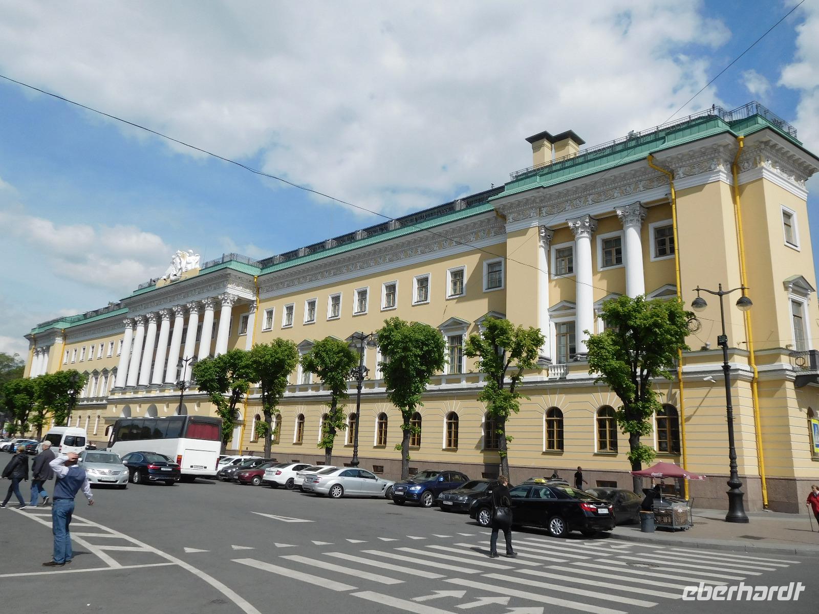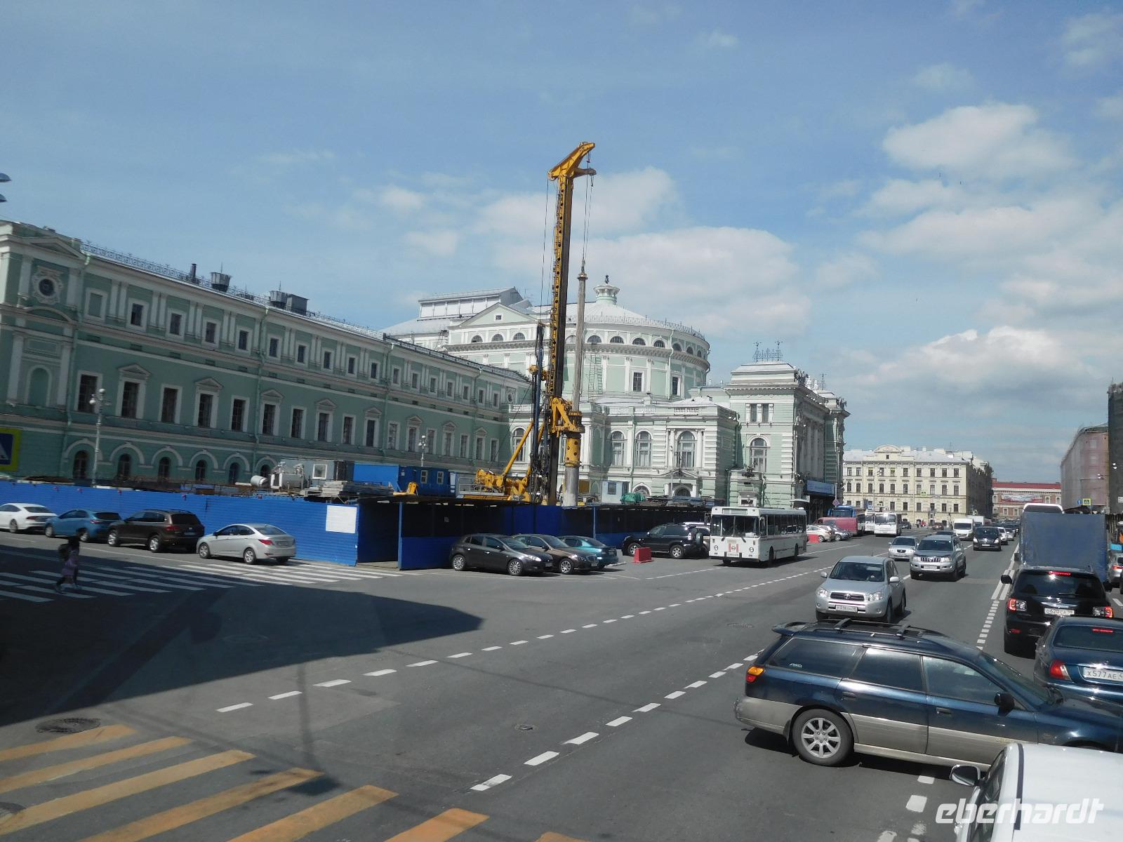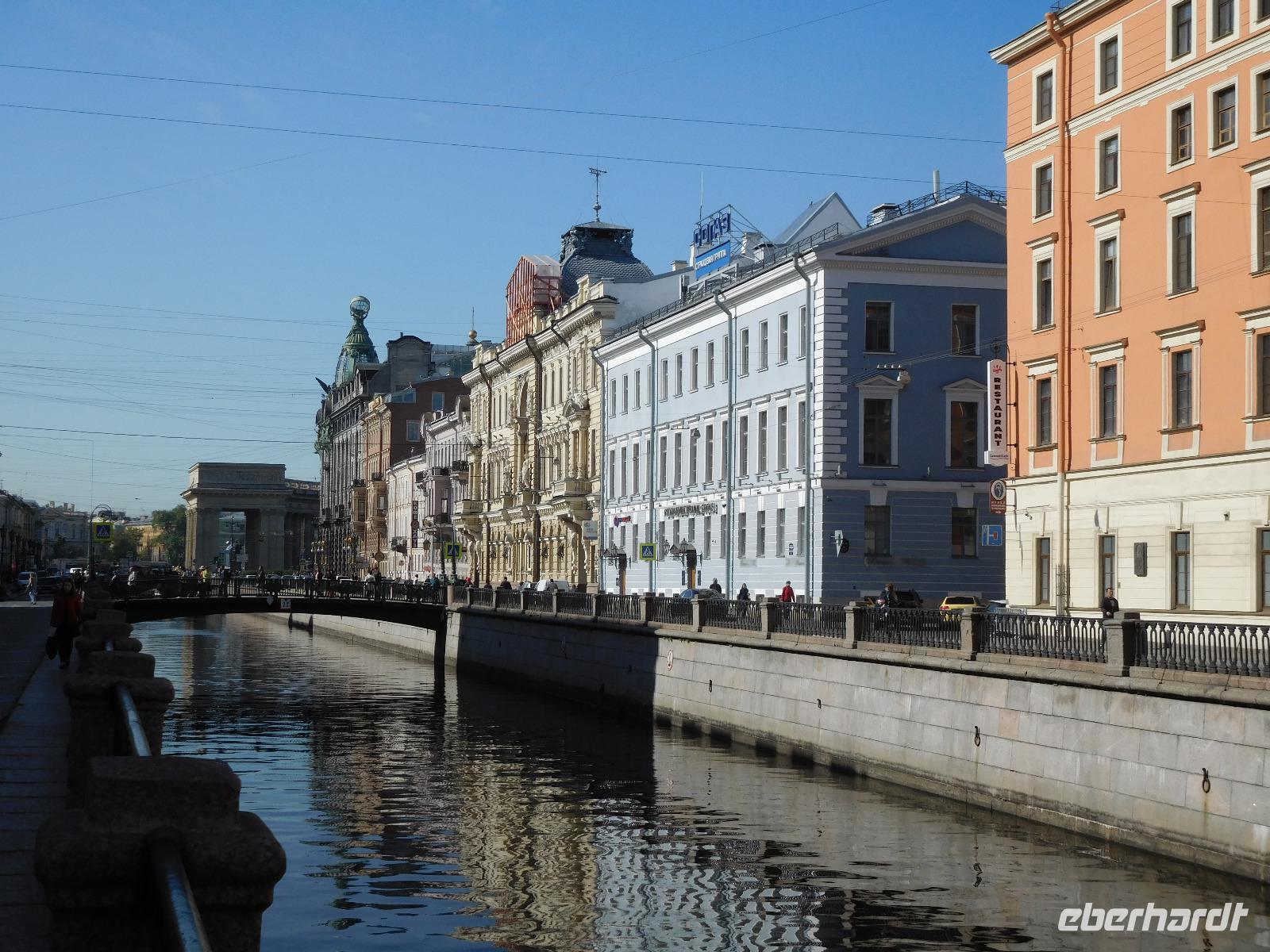 Nach dem Frühstück traten wir wegen des anspruchsvollen Tagesprogramms mit Einreise nach Russland zeitig die Weiterreise an. Schweren Herzens verabschiedeten wir die so engagierte wie kompetente Reiseleiterin Regina, die allen ans Herz gewachsen war. Den russischen Reiseführer Timofej, abgekürzt Tim, nahmen wir gleich nach der Grenze auf und fuhren nach Petersburg zum Hotel, wo wir gegen 17 Uhr einchecken und eine kleine Stunde später zum Abendessen gehen konnten. Auf Timos Anraten hin kauften sich einige Gäste Jetons für die Metro und fuhren zwei Stationen entlang am Newskiprospekt zum noblen Kaufhaus Gostinny Dwor, wo auch die Kasaner Kirche, das Singerhaus und nicht weit das Winterpalais zu finden sind. Leider schränkte ein unangenehmer Nieselregen die Spazierfreude etwas ein.