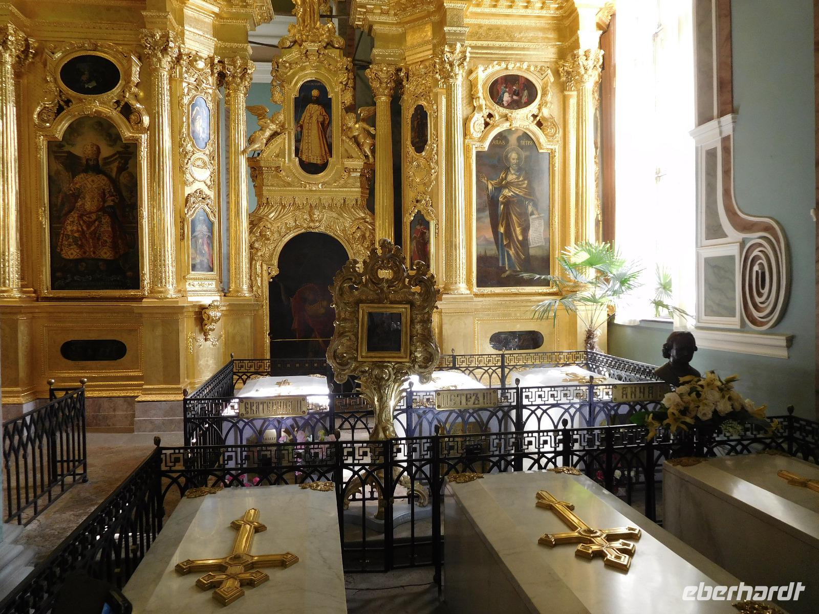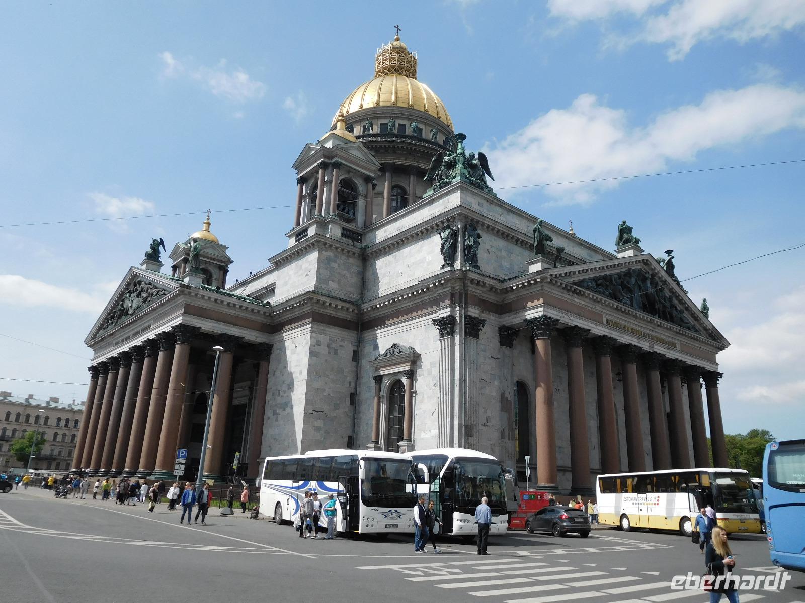 Nach dem Frühstück traf sich die Gruppe um 08.30 Uhr am Bus zur Stadtbesichtigung, die mit einem Ausstieg am barocken Smolnykloster, einer Lehranstalt für adlige Hofdamen und erste Machtzentrale Lenins, begann. Anschließend fuhren wir auf die Insel mit der Peter- und Paul- Festung und besichtigten die gleichnamige Kathedrale mit den Gräbern der wichtigsten einst in Petersburg residierenden Zaren aus der Romanow- Dynastie, einschließlich der Familie Nikolaus II., die von den Bolschewiki ermordet und deren Leichen erst in den Neunzigern umgebettet wurden. Den langen Newskiprospekt entlang, vorbei an der Kasaner Kathedrale, pausierten wir hinter der Rostrabrücke unweit der Börse, um dann die russisch- orthodoxe Hauptkirche, die Isaakkathedrale zu besichtigen, die sich wie die Kasaner Kathedrale architektonisch an den Petersdom in Rom anlehnt.