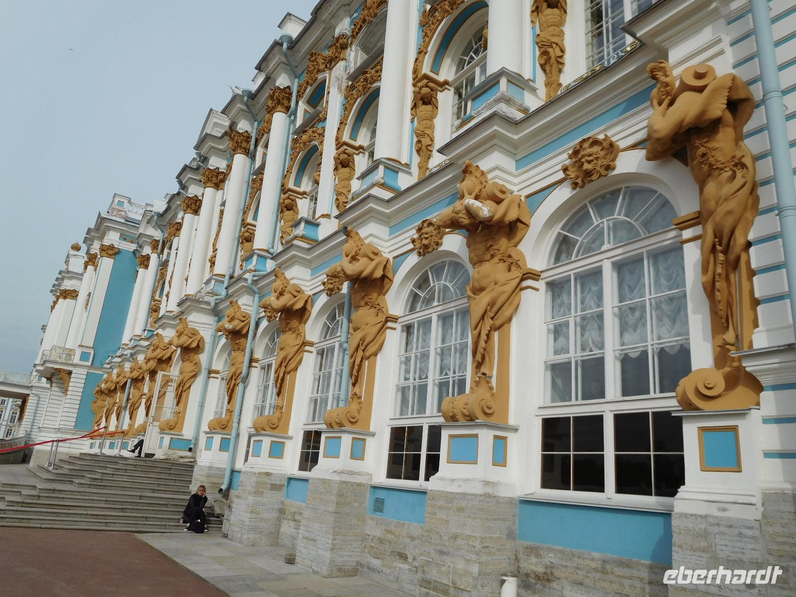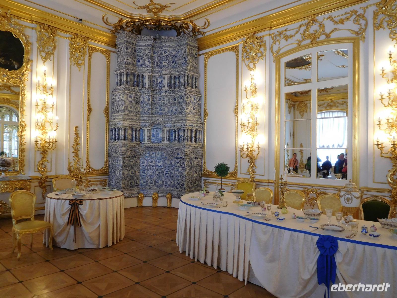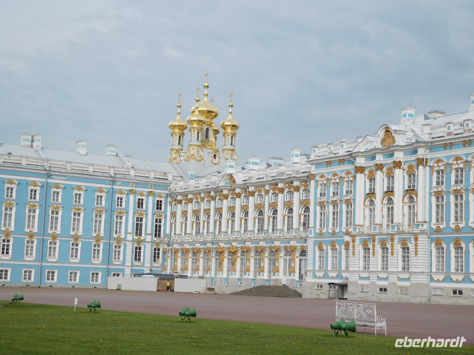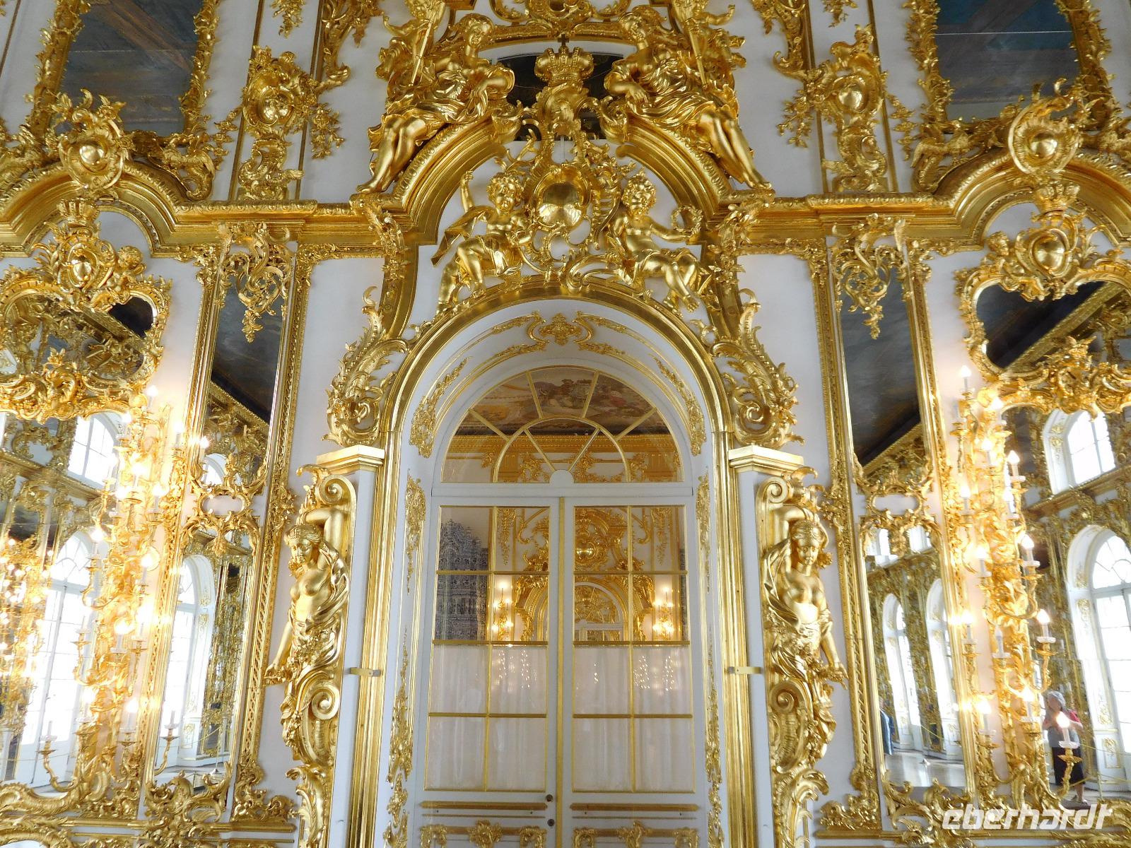 Am Nachmittag fuhren wir nach Zarskoe Selo, heute Puschkin, um den Katharinenpalast mit dem legendenumwobenen Bernsteinzimmer anzusehen. Das grandiose Ensemble belohnte die Fahrt überreichlich. Bei der Führung durch schier endlose Gänge verloren sich die Massen auch wieder, nur im Bernsteinzimmer ballte sich das Publikum, allerdings war zügiger Durchlauf organisiert. Danach fuhren wir zum nahe gelegenen Restaurant „Pod Vorie", gebaut als altrussischer Bauernhof mit Blockhäusern aus gewaltigen Holzstämmen. Hier erwartete uns ein echt russisches Mahl. Ein guter Wodka und Wein aus dem Kubangebiet schaffte Platz im Magen und beförderte die allgemeine Kommunikation, die von einem folkloristischen Programm aufgelockert wurde. Traditionell gekleidete Sänger und Instrumentalisten sangen volkstümliche Lieder. Heiter gestimmt brachte uns der Bus anschließend zum Hotel.