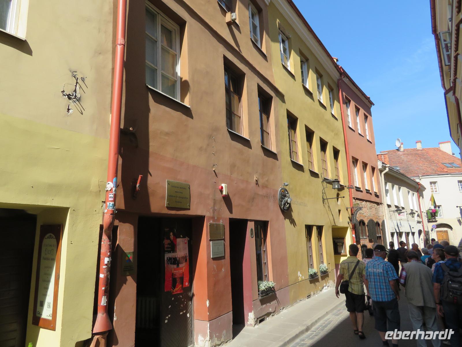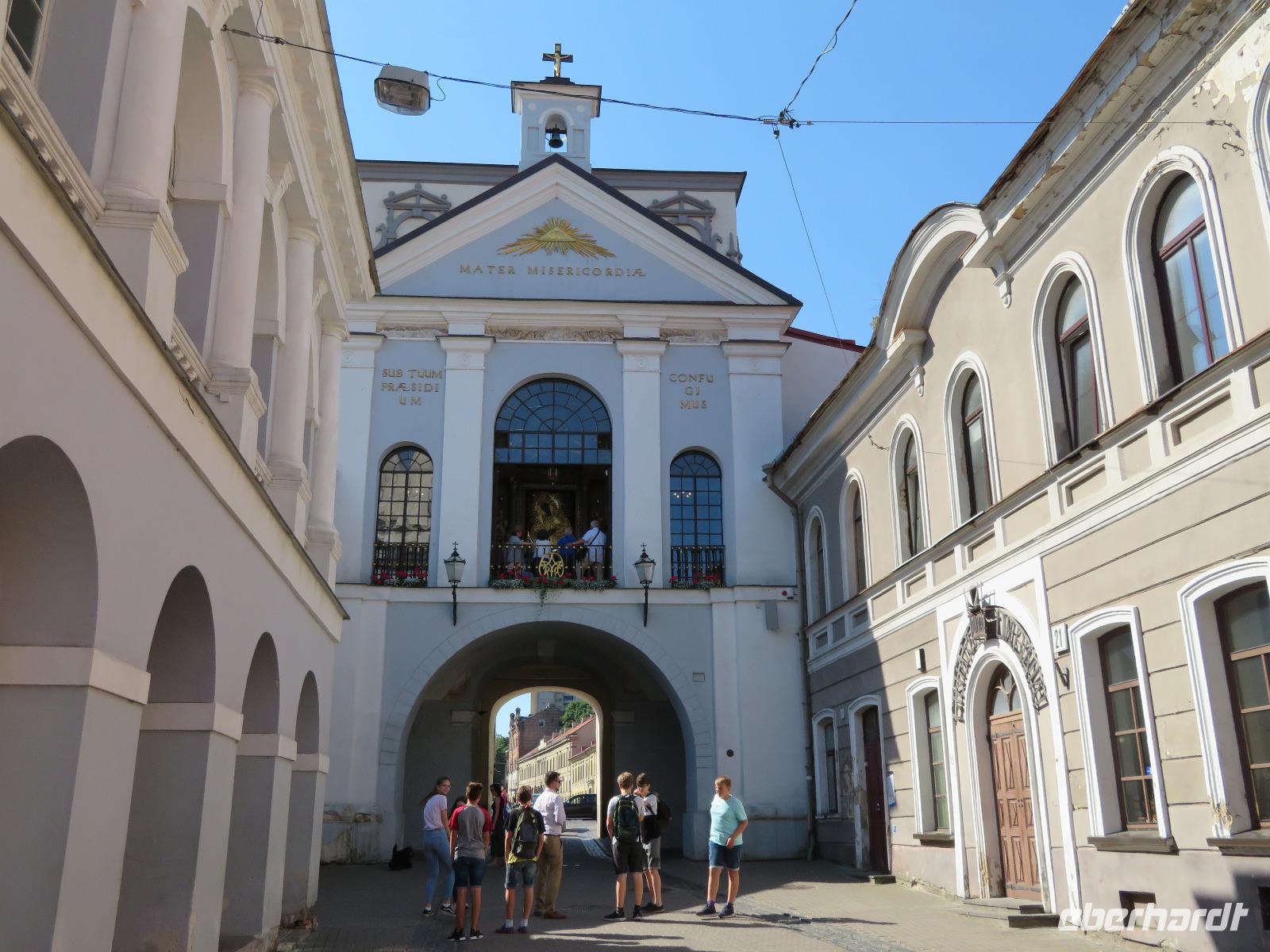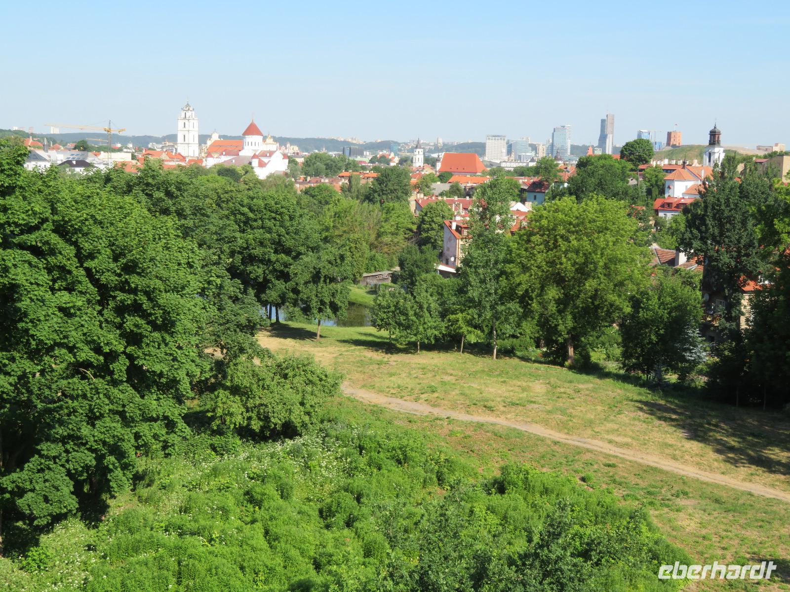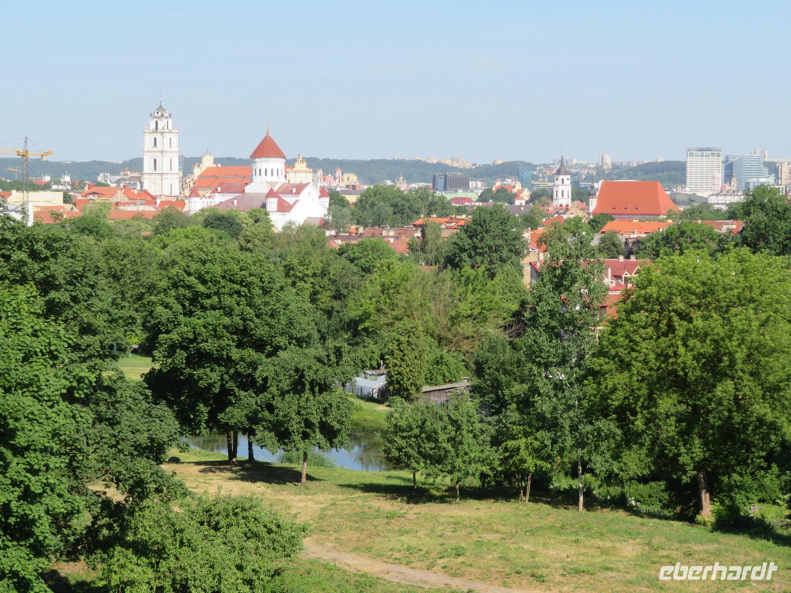 Mit dem Bus an Neris entlang, die Wilna überquerend, den Burgberg umfahrend gelangten wir zur Aussicht auf Vilnius. War Vilnius einst für seine mehr als dreißig Kirchtürme bekannt und fast ein litauisches Jerusalem, so überwiegen heute fast die Glastürme der Neustadt, die sich in deutlichem Kontrast zum Grün um die Altstadt befinden. Der Fußweg führte vom Tor der Morgenröte, sparsam an weiteren orthodoxen und insbesondere katholischen Kirchen vorbei, zum klassizistischen Rathaus, dann in die Gassen der Altstadt zum ehemaligen Jüdischen Getto, zu Gebäuden der Universität und zum Gebäude der Noch-Präsidentin Litauens. Finale des Spazierganges dann am Kathedralenplatz - einst Gediminis-Platz (war ein Fürst und musste als Namensgeber trotzdem weichen). Erfreulich, dass die Unterburg im Rennaissancestil wieder aufgebaut wurde und nunmehr zugänglich ist.
