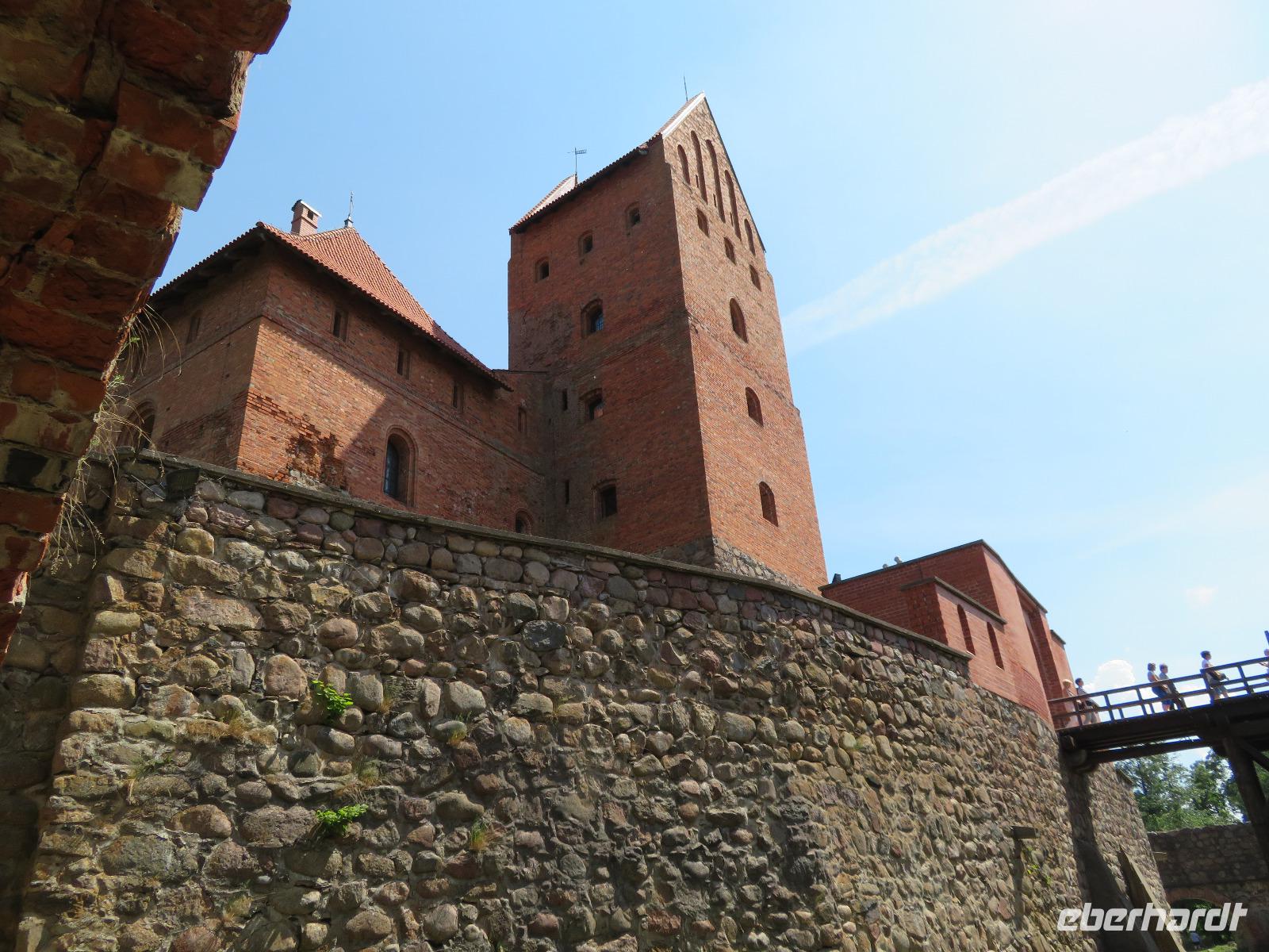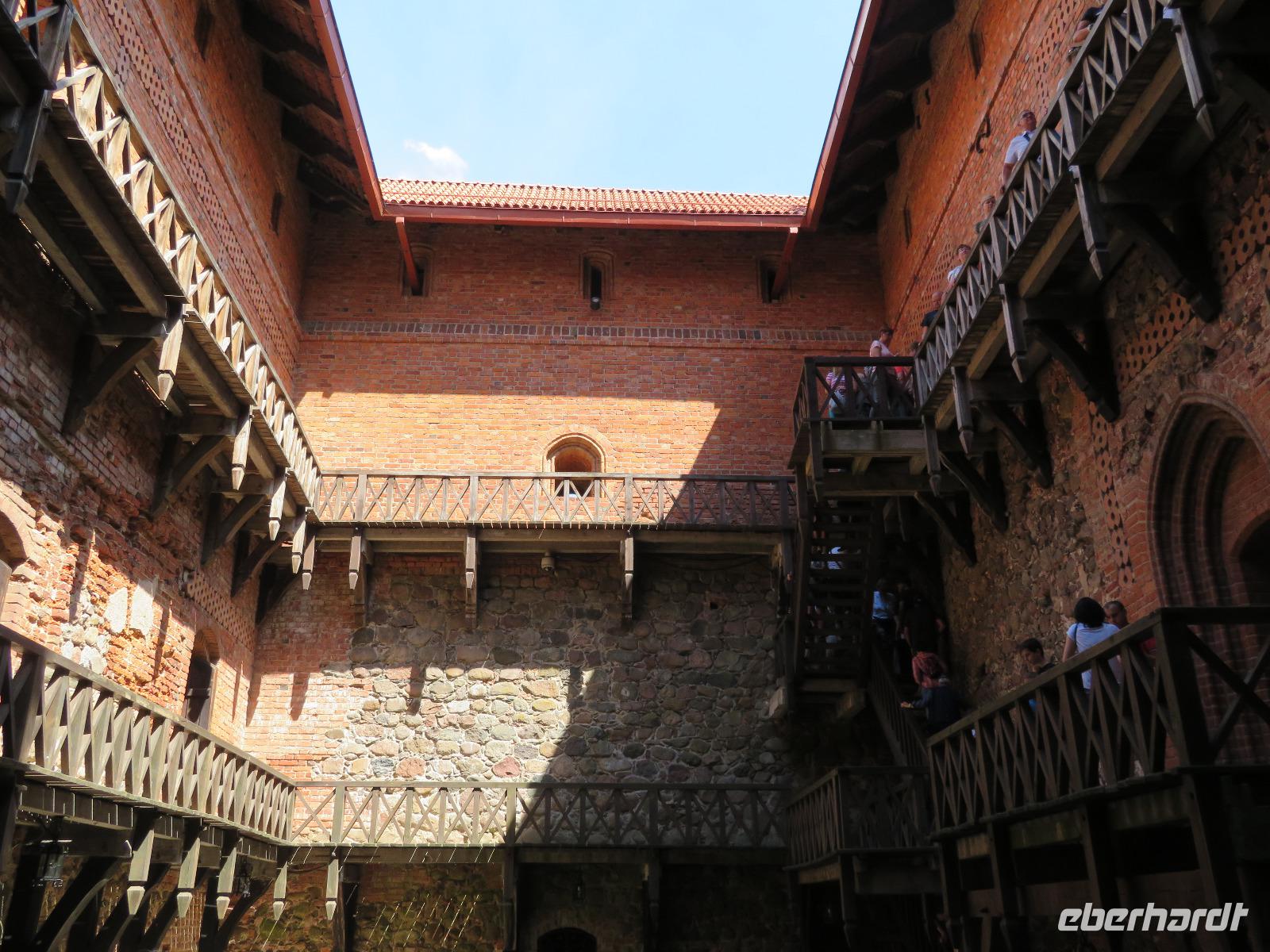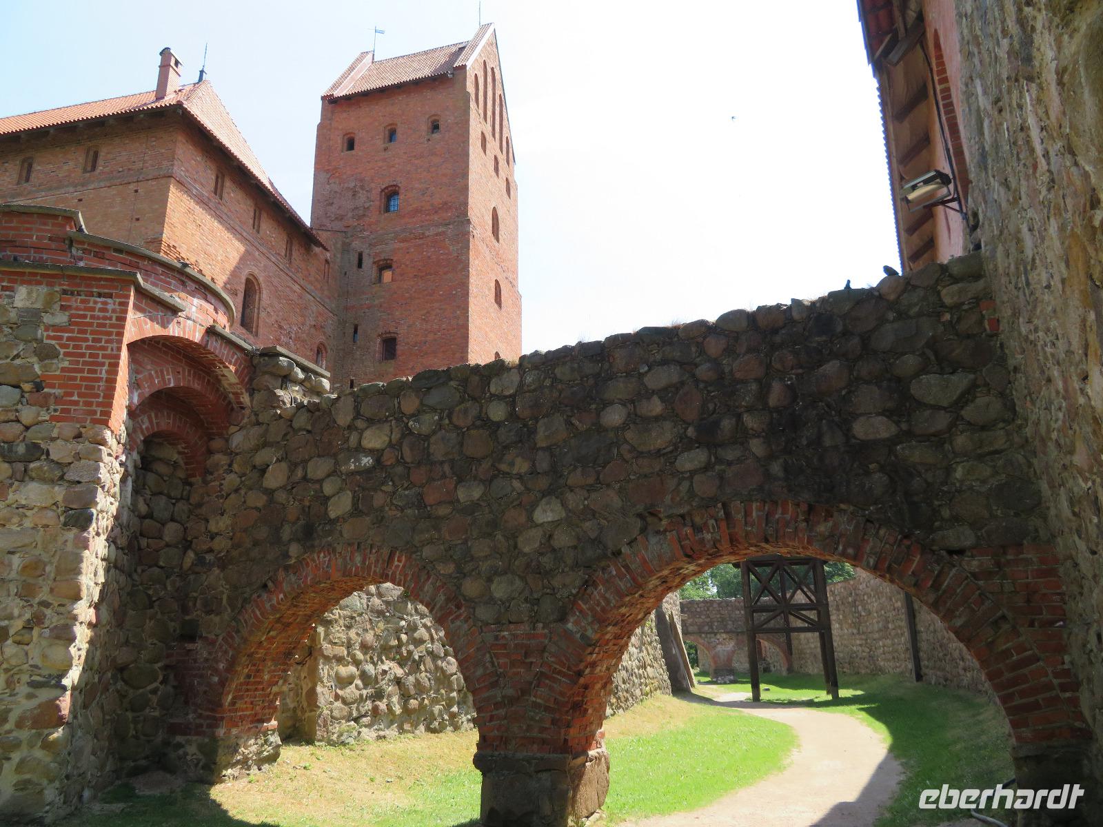 Die Burganlage, die in der ersten Hälfte des 20. Jahrhunderts begonnen wurde zu konservieren, steht nunmehr bereits seit Jahren aufgebaut inmitten der blau schimmernden Seenlandschaft - ein Touristenanziehungspunkt Litauens. Am Nachmittag blieb noch Freizeit bevor wir in Hotelnähe in einem Restaurant auf üppigste Art die litauische Küche kennenlernen konnten (Vorspeisenteller, Borschtsch mit Waldpilzen, Rauchwurst mit Sauerkraut, Zeppelinai, Darmwürste mit Kartoffelfüllung, usw. usf. und obenauf eine Ecke Mohnkuchen mit Vanillesoße - mancher benötigte mehr als einen Verdauungsschnaps.