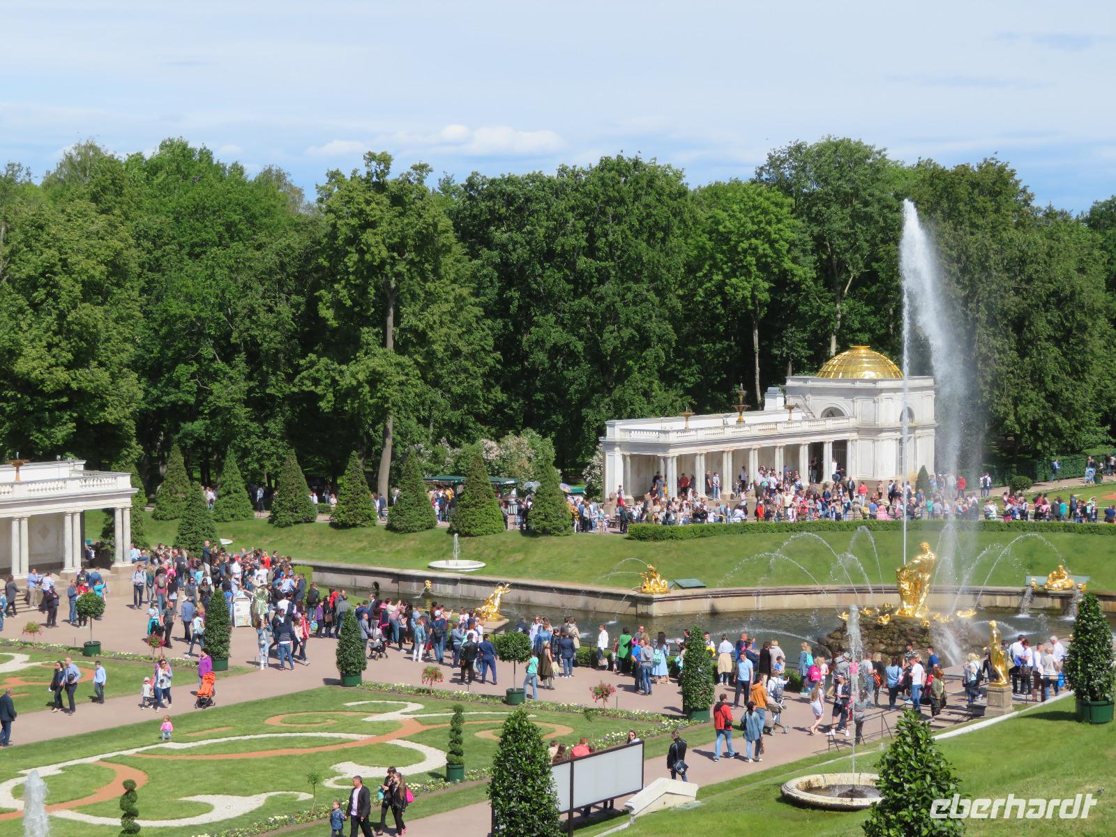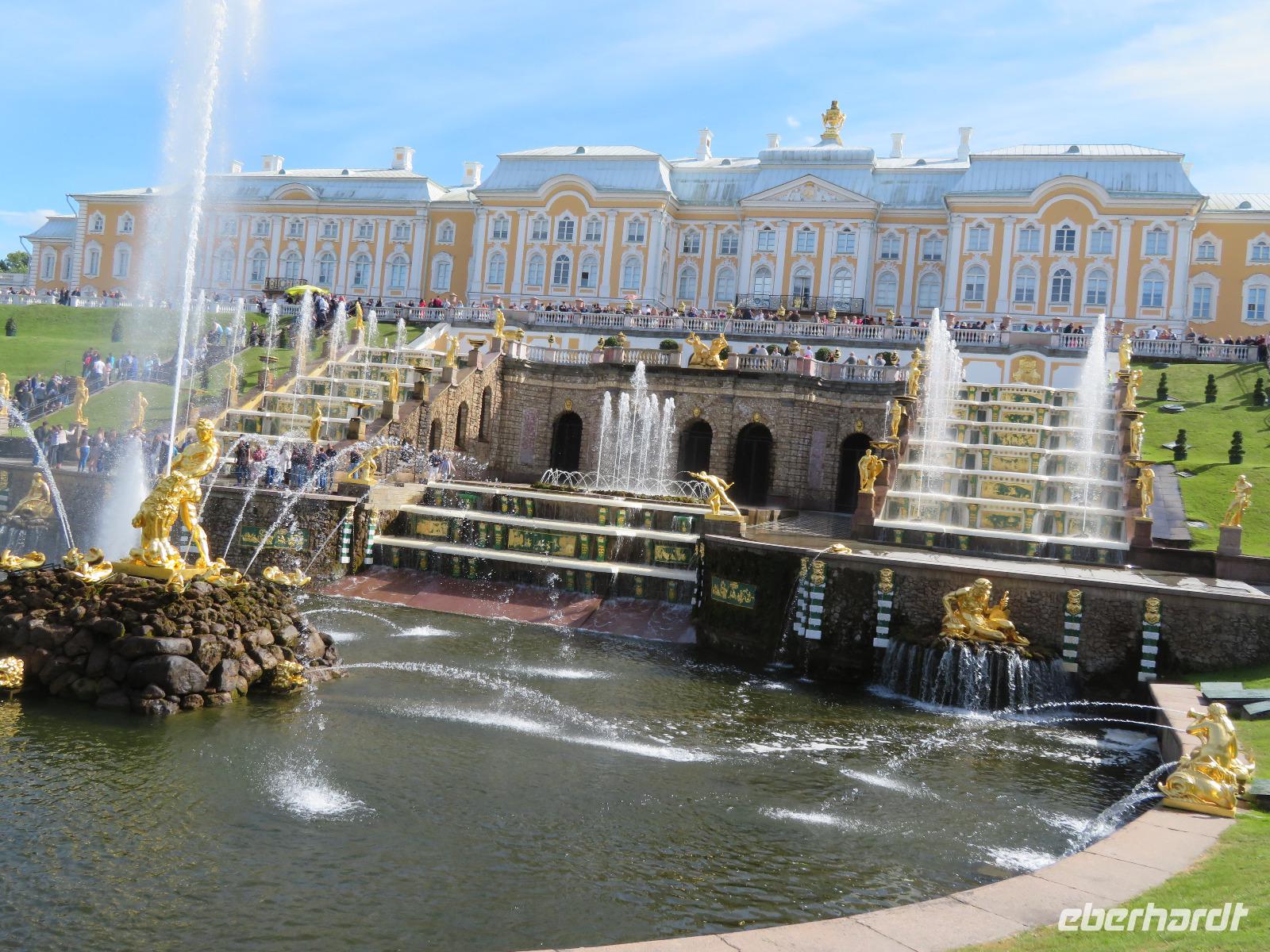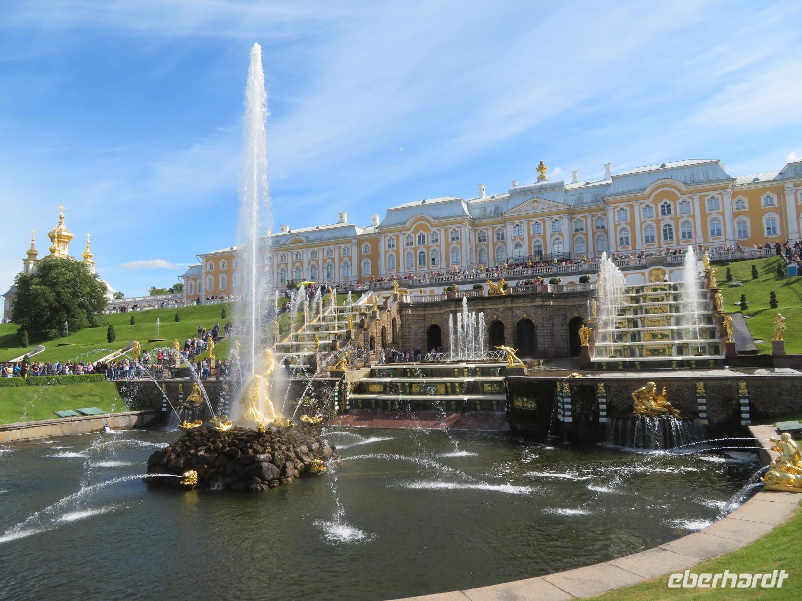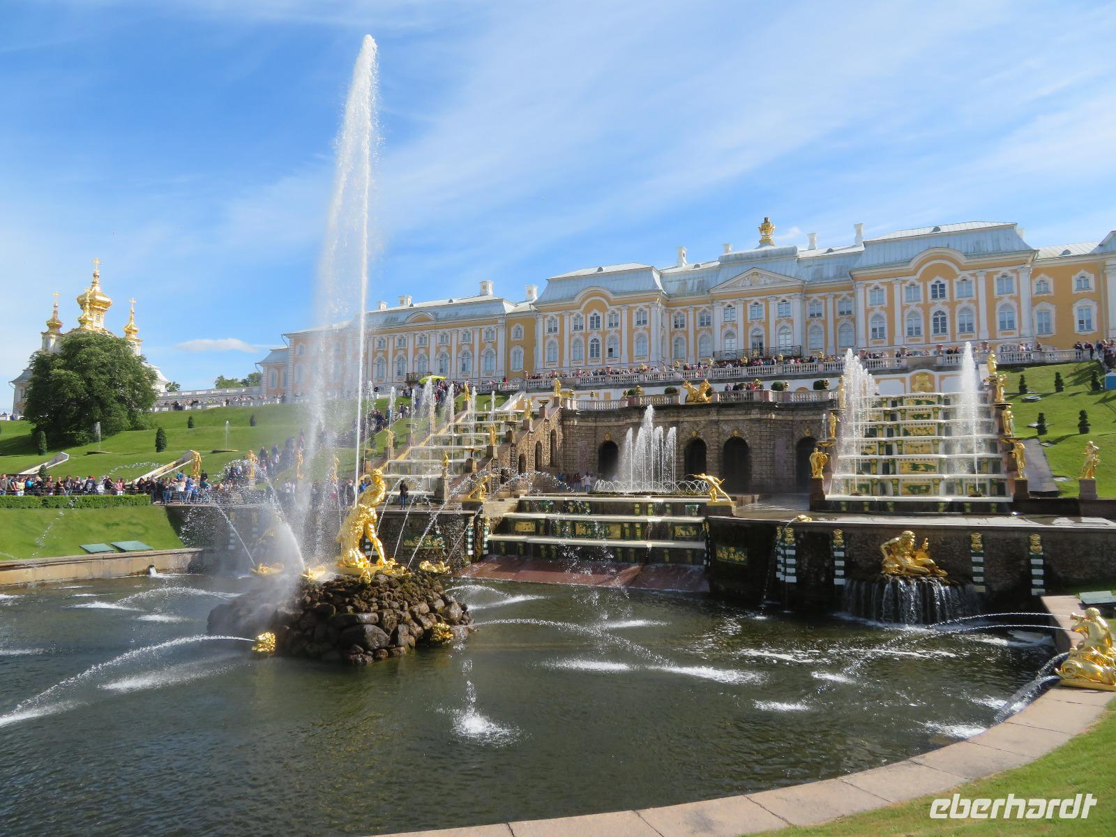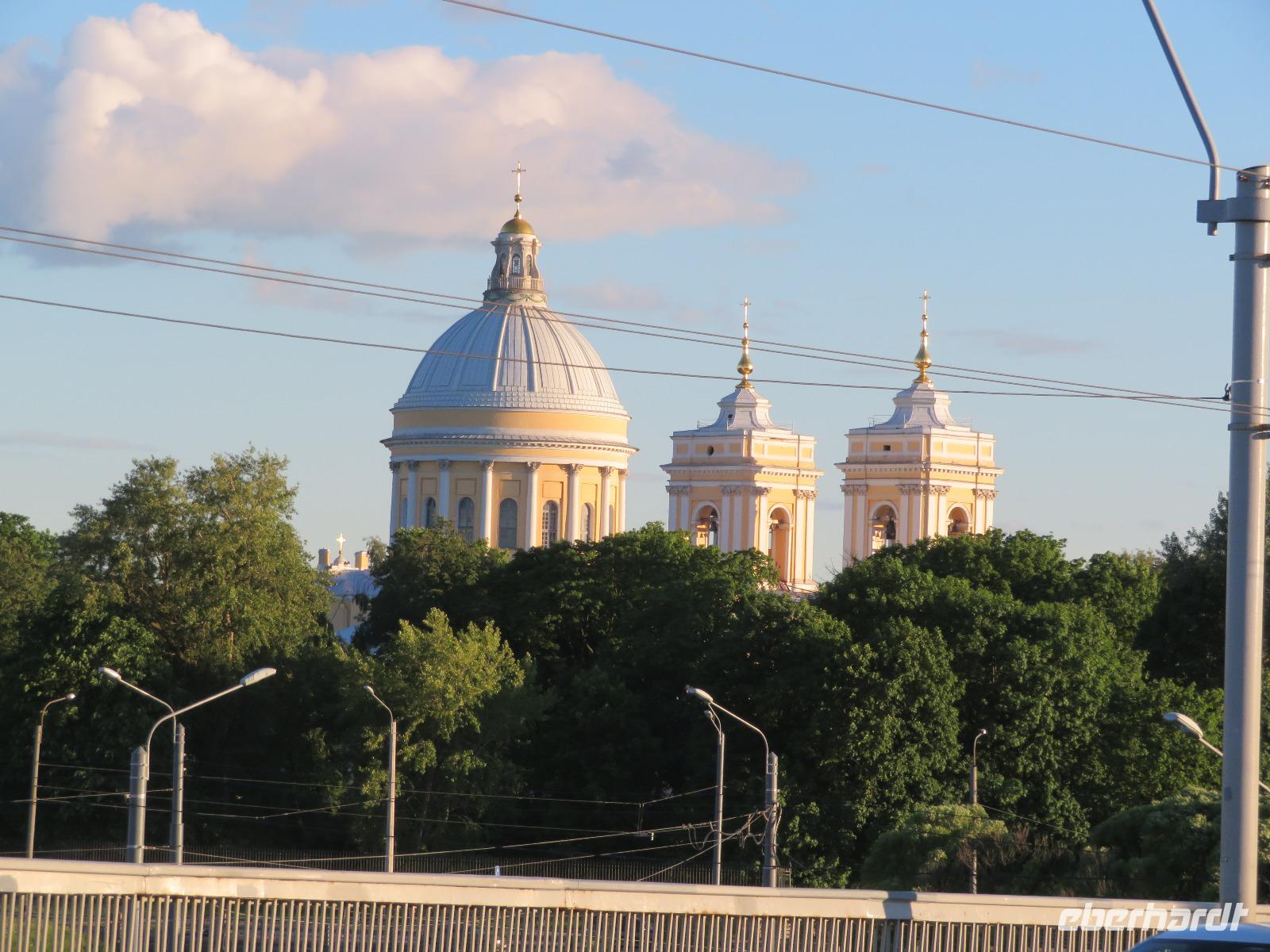 Der akkurat mit 10:37 Uhr zugewiesene Zugang zum Winterpalais ermöglichte uns einen Stopp am Smolny: Ort einer Teerkocherei, eines Mädchenklosters und für romantisierende Bolschewiki-Legenden. Im Strom der Touristen schwammen wir dann mehrere Kilometer durch die Ausstellungsräume eines Museums mit wohl sechzigtausend Ausstellungs- und einigen Millionen Depotgegenständen. In zwei Stunden kann man nur einen kleinen Ausschnitt bei straffer Führung von Timofei sehen: riesige Vasen und Becken aus Halbedelsteinen, Gemälde westeuropäischer Meister, die Galerie der Generäle der russischen Armee im Kampf gegen Napoleon, das von Touristen umlagerte Uhrenspiel oder einfach nur die Säle mit ihrem Goldschmuck. Treff und Fototermin dann an der Alexandersäule auf dem Palaisplatz und zügige Fahrt nach Petrodworez, wo sich mehrere Parkanagen der Zaren befinden, darunter der Peterhof. Bei strahlender Sonne bummelten wir durch den Park mit immer wieder wie neu erscheinenden Goldfiguren und den zahlreichen Fontänen. Am Zugang zur Ostsee mit Blick auf Petersburg mit dem Gazprom-Tower zur Rechten und auf ein Stück Kronstadt zur Linken. Am zeitigen Abend erreichten wir unser Hotel Moskwa und jeder konnte am Abend, wenige Tage vor der Sommersonnenwende, „Weiße Nächte" in St. Petersburg erleben.